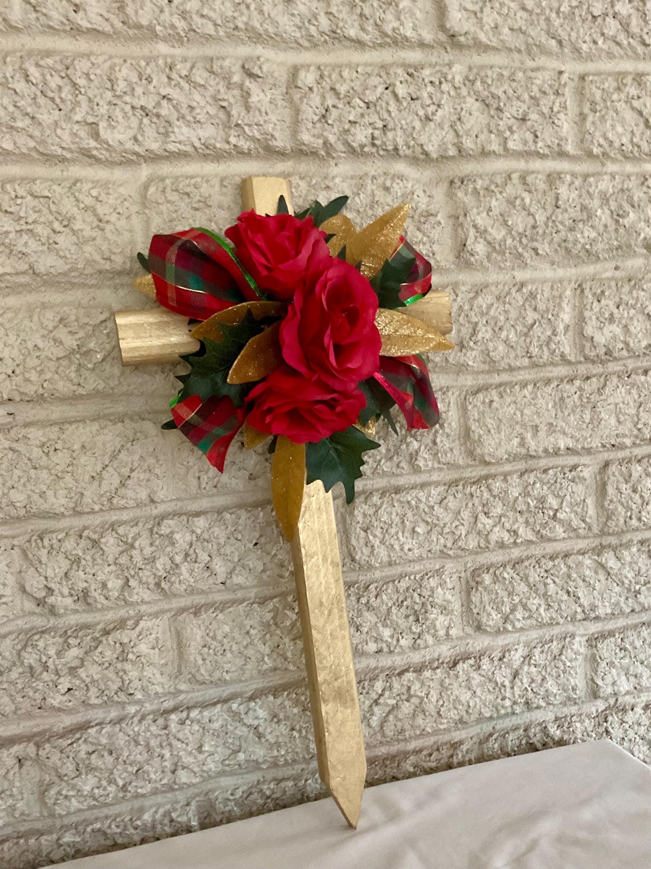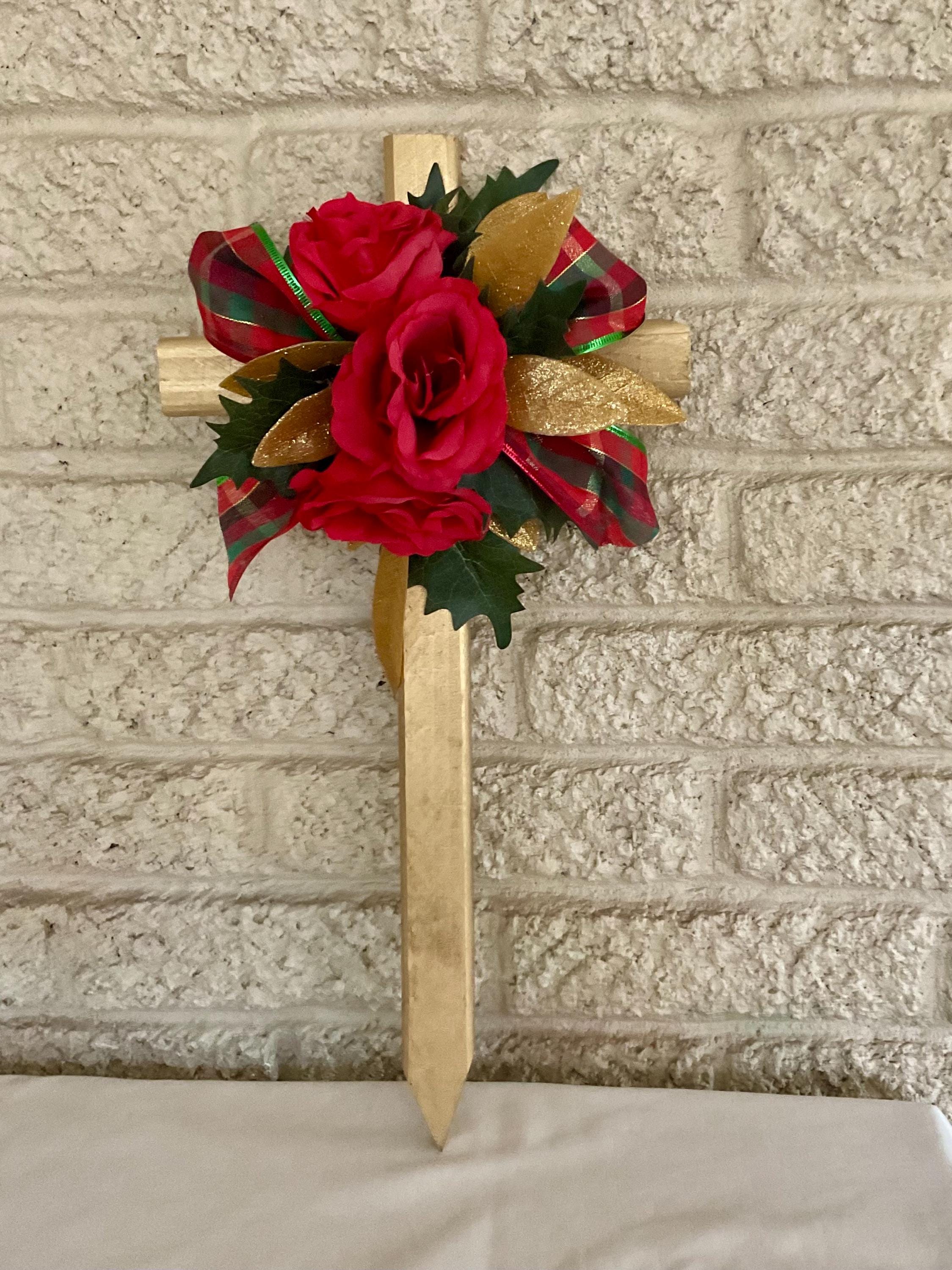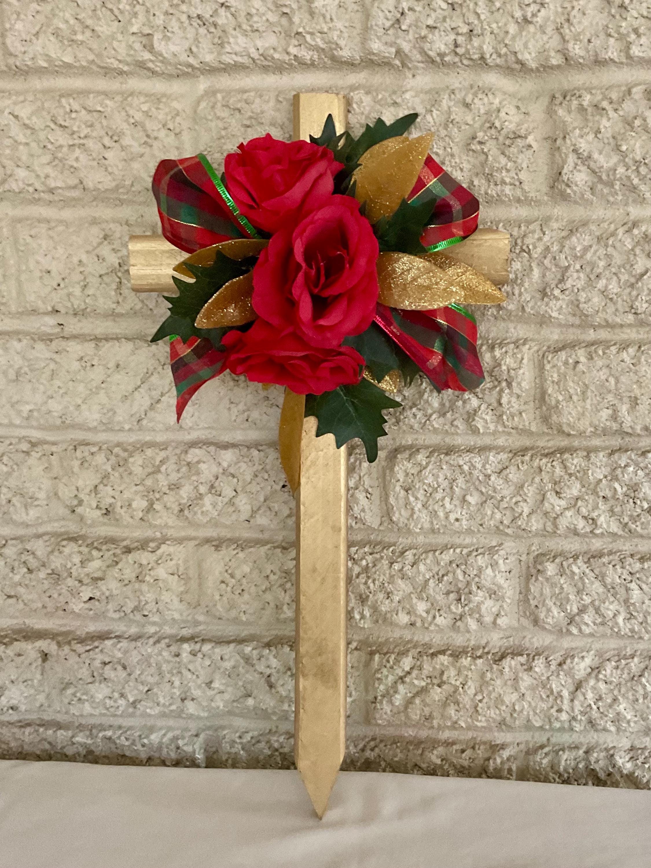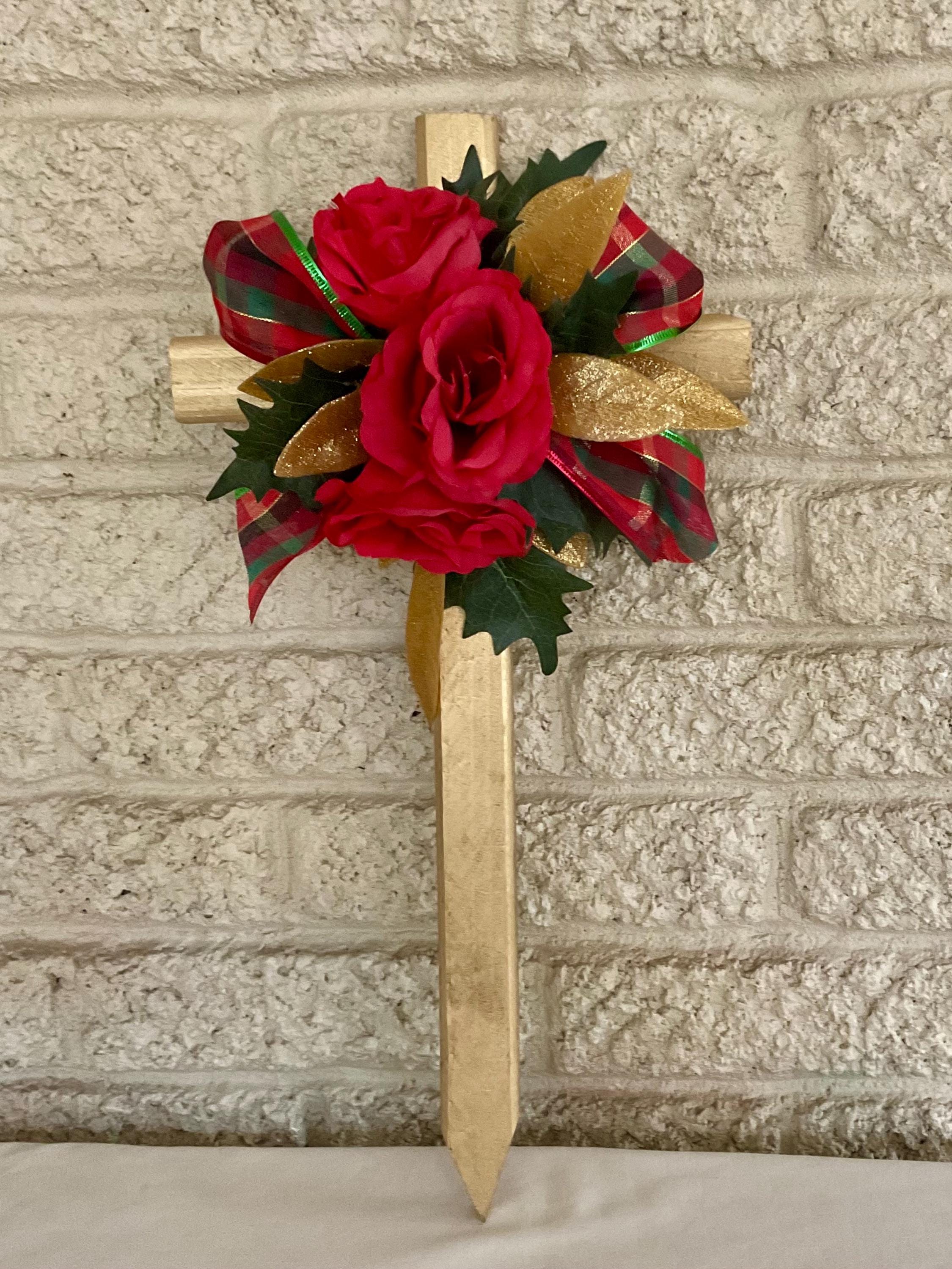 This 18-inch handcrafted pine cemetery cross is lovingly painted in a rich metallic gold finish, creating a soft, radiant backdrop for its festive floral design.