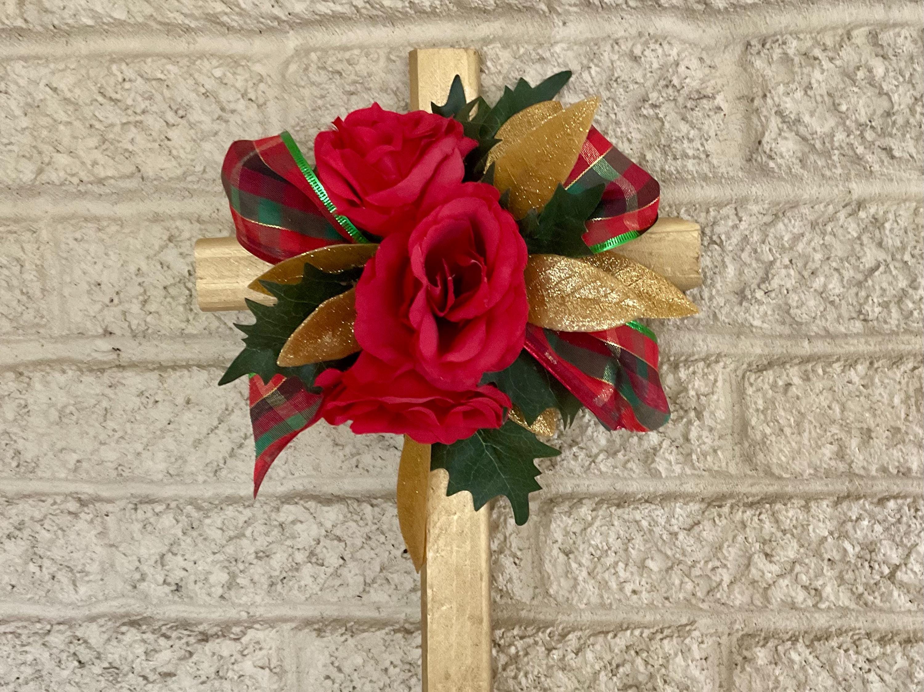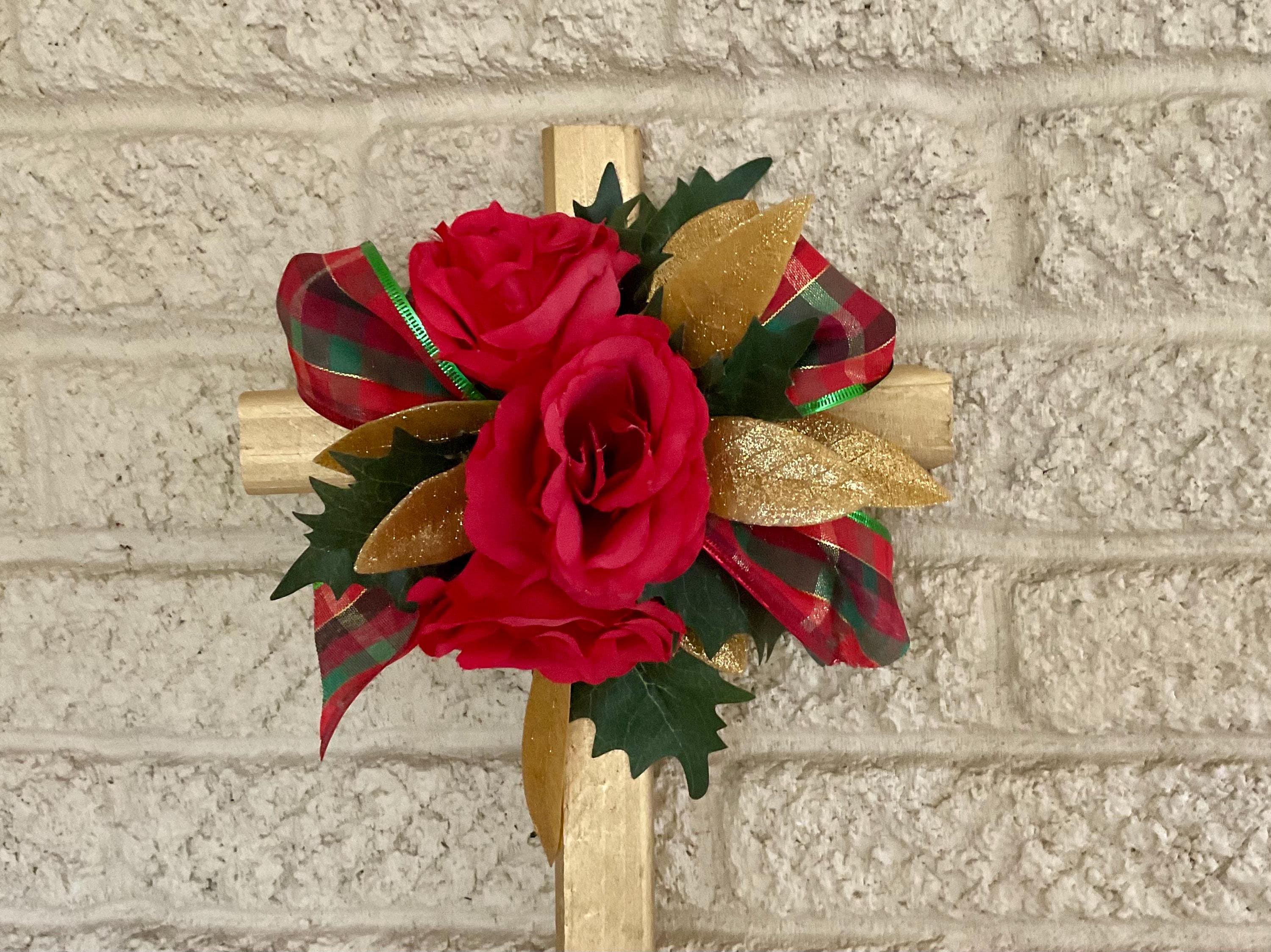 Gold and Red Rose Cemetery Cross – 18” Handcrafted Grave Decoration with Holiday Plaid Ribbon, Holly Leaves, and Glittered Gold Accents |