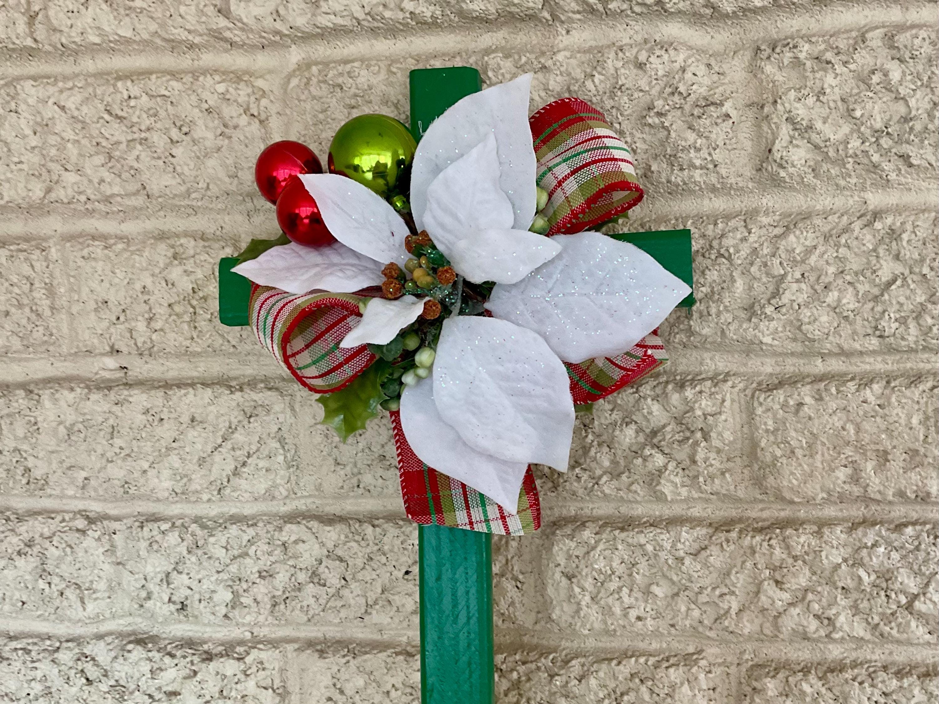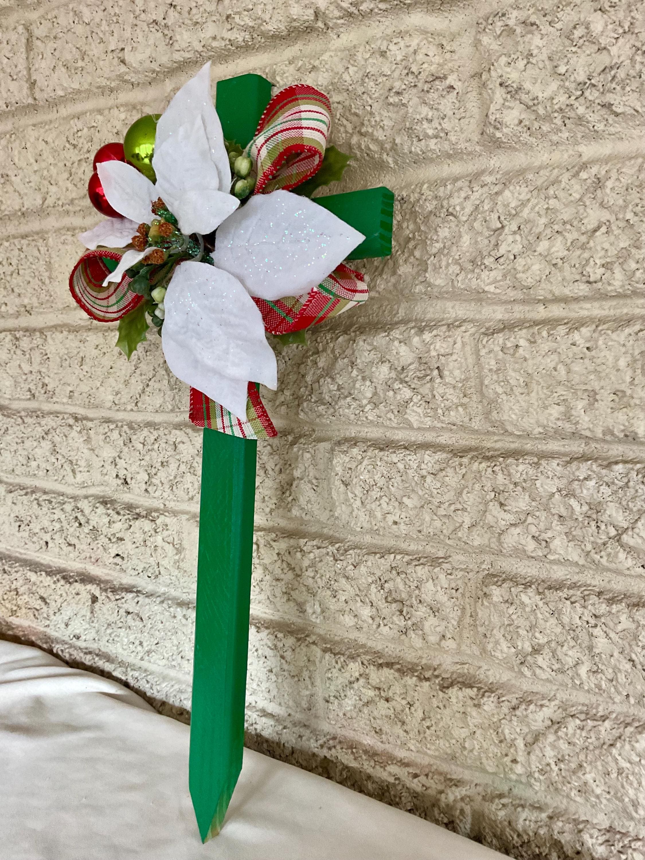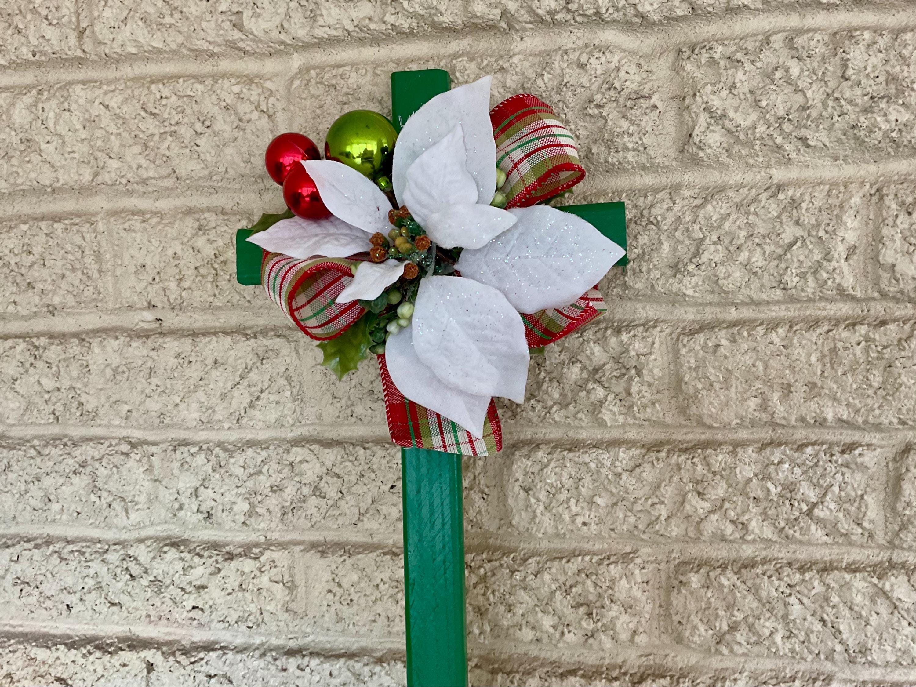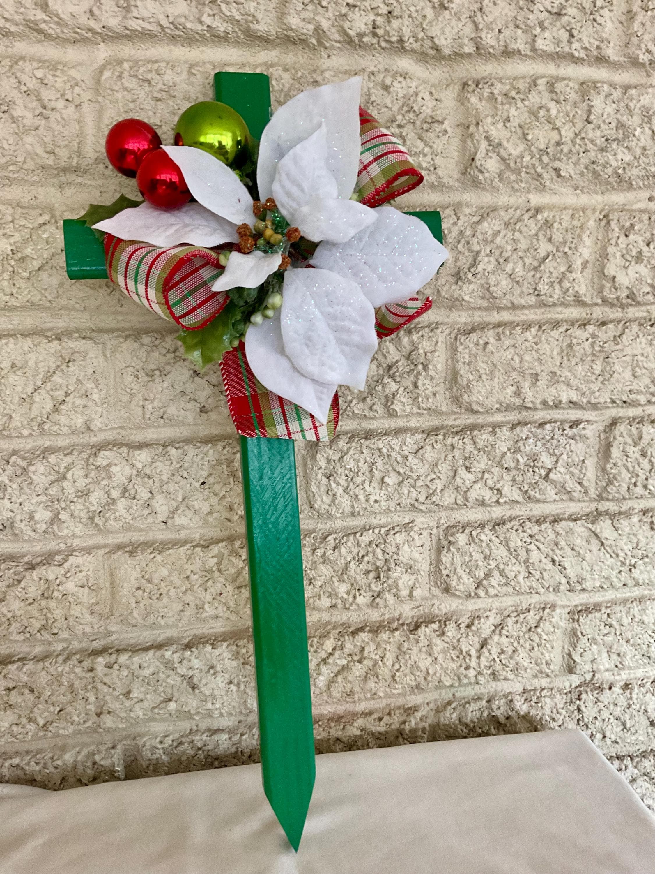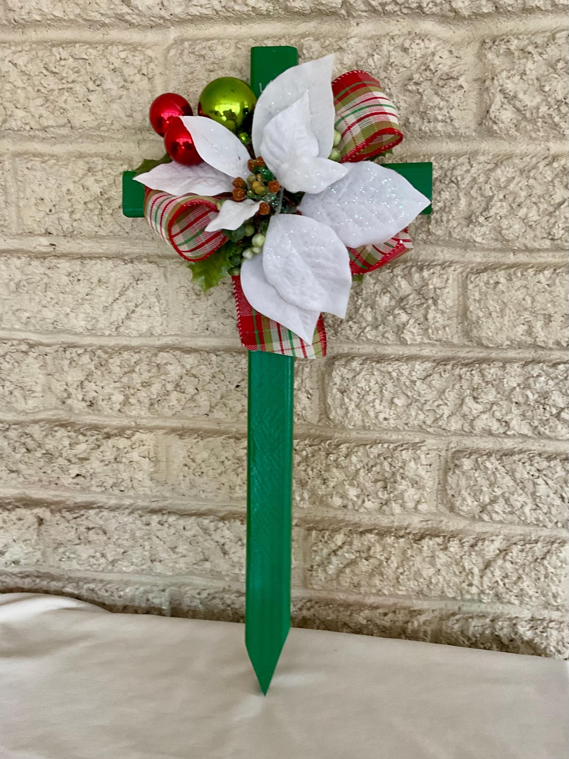 Honor your loved one this holiday season with a timeless tribute that shines with warmth and grace. This 18-inch handcrafted pine cemetery cross is lovingly painted Christmas tree green, creating a radiant backdrop for its festive floral design.