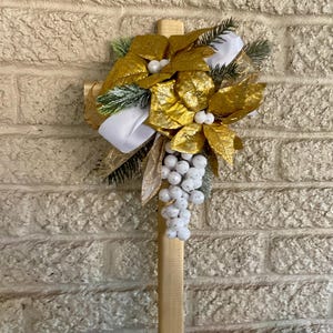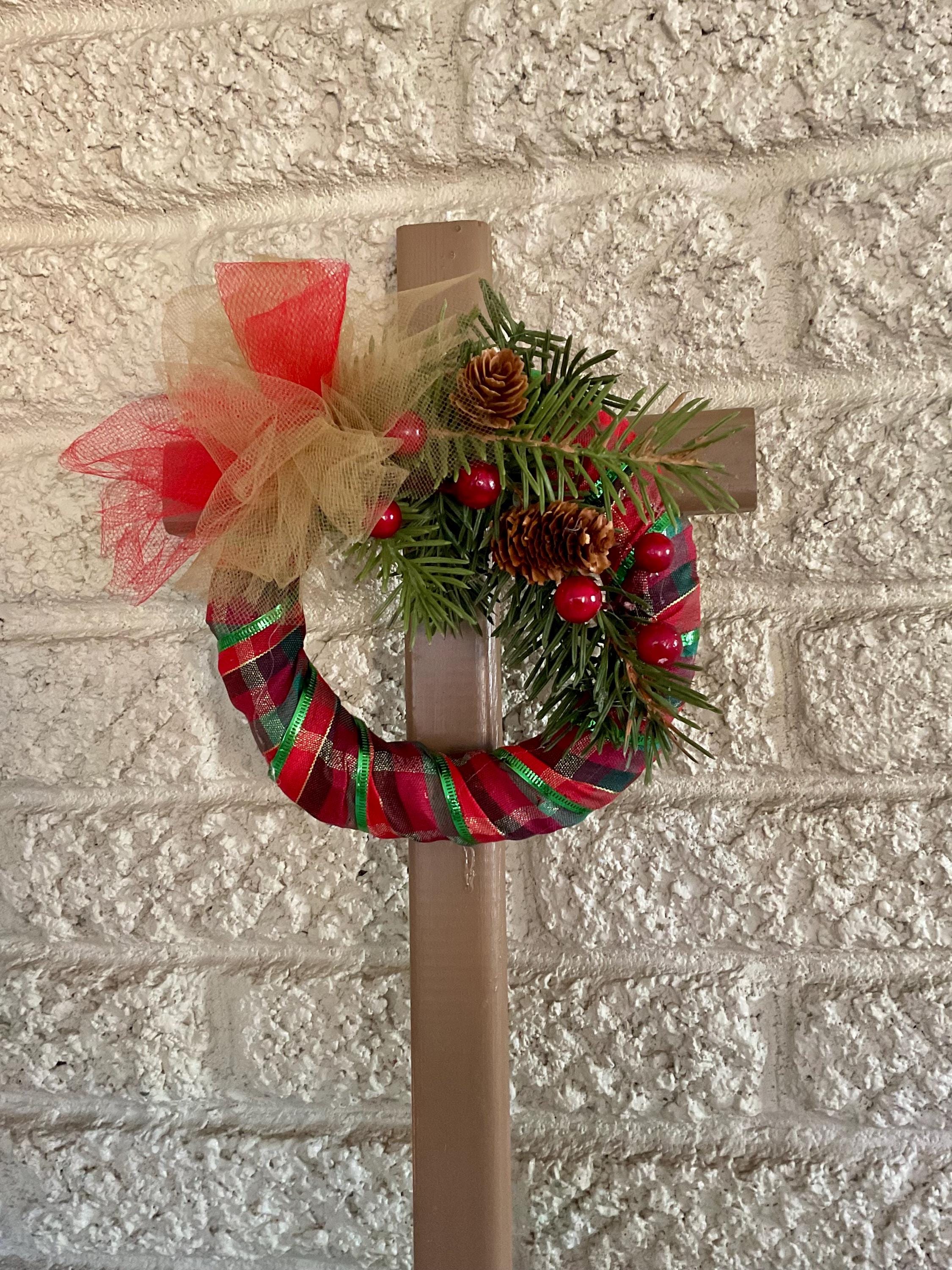 This 18” pine cemetery cross has been painted gingerbread brown with a Christmas ribbon wrapped mini wreath attached to the front. The wreath has fir branches , red berries, mini pine cones, and gold / red tulle. The cross has a pointed end for easy ground insertion. Every cross is sprayed with a coat of clear polyurethane to protect the ribbon and silk flowers from outdoor elements.