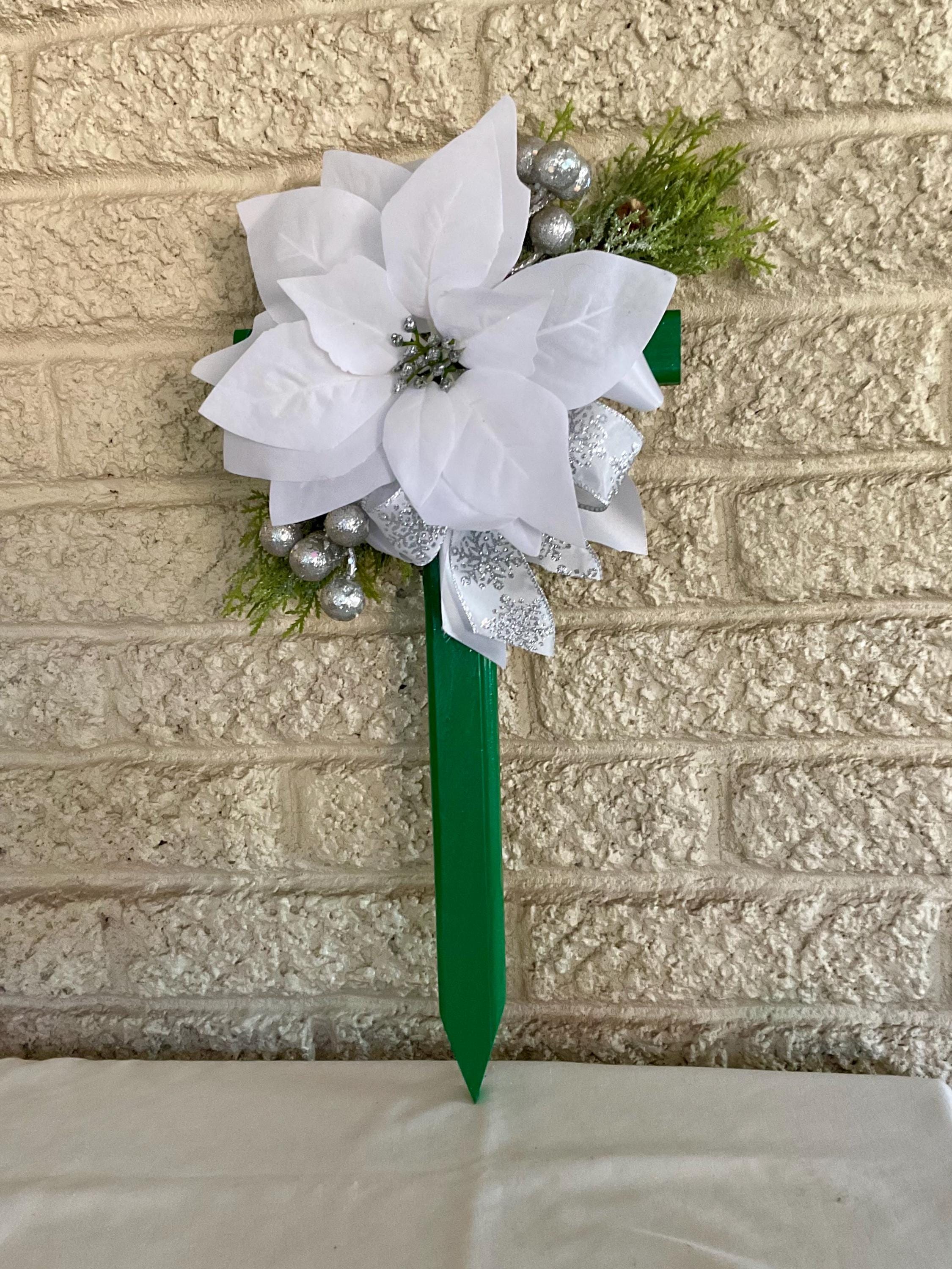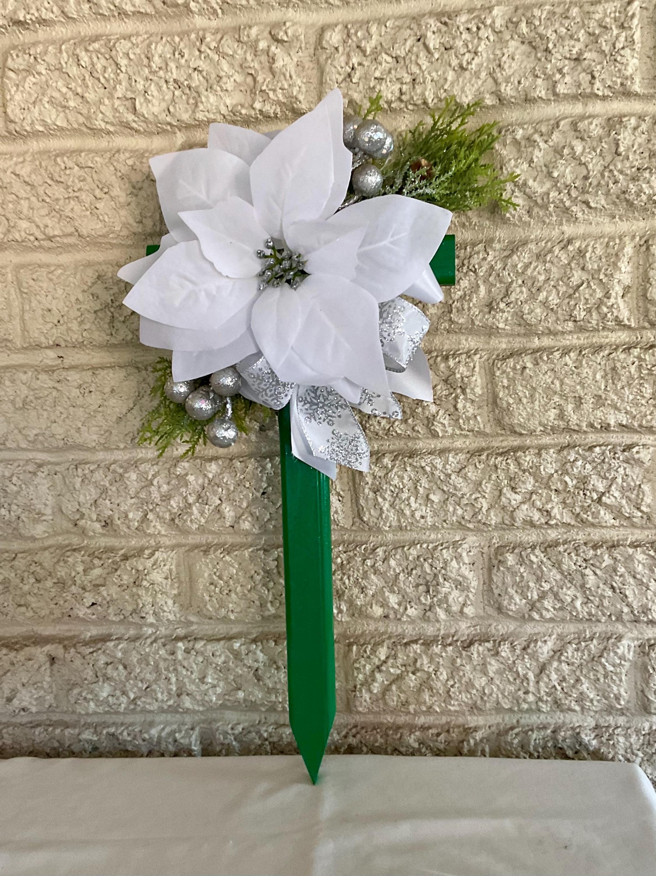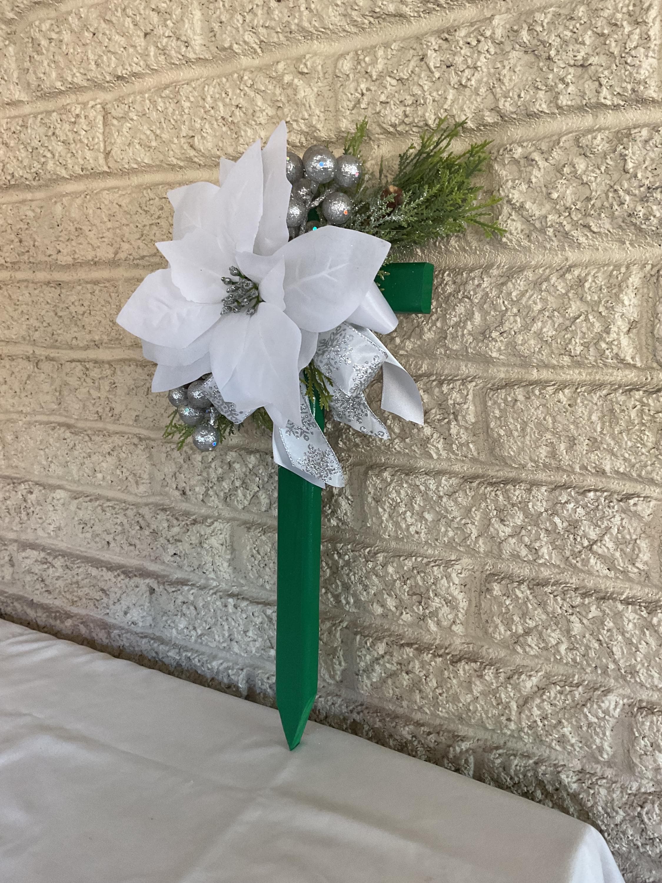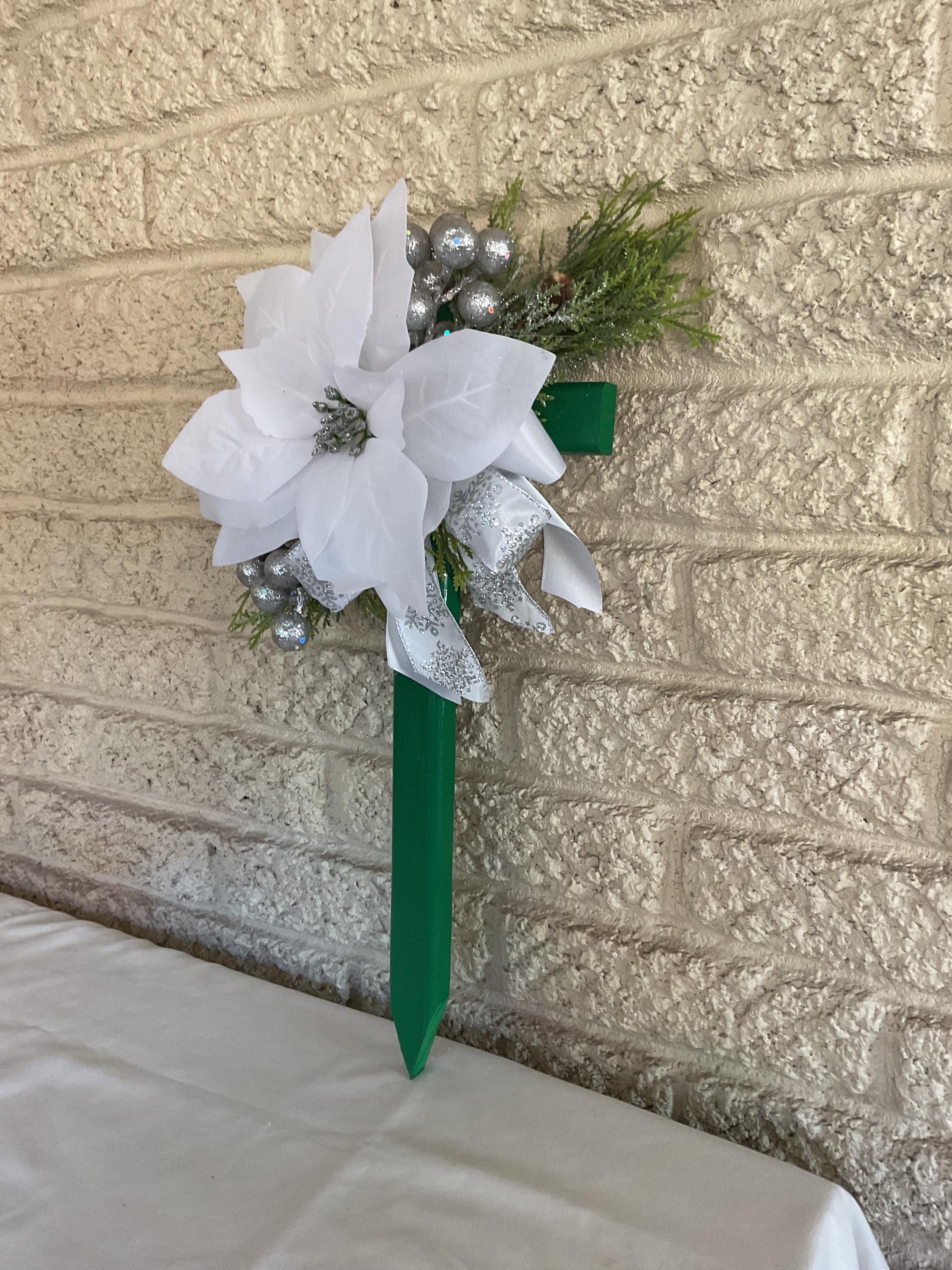 This 18” pine cemetery cross has been painted Christmas green with a large white poinsettia, layers of fir branches, silver glitter berry branches, white ribbon, and glitter silver snowflake ribbon. The cross has a pointed end for easy ground insertion. Every cross is sprayed with a coat of clear polyurethane to protect the ribbon and silk flowers from outdoor elements.