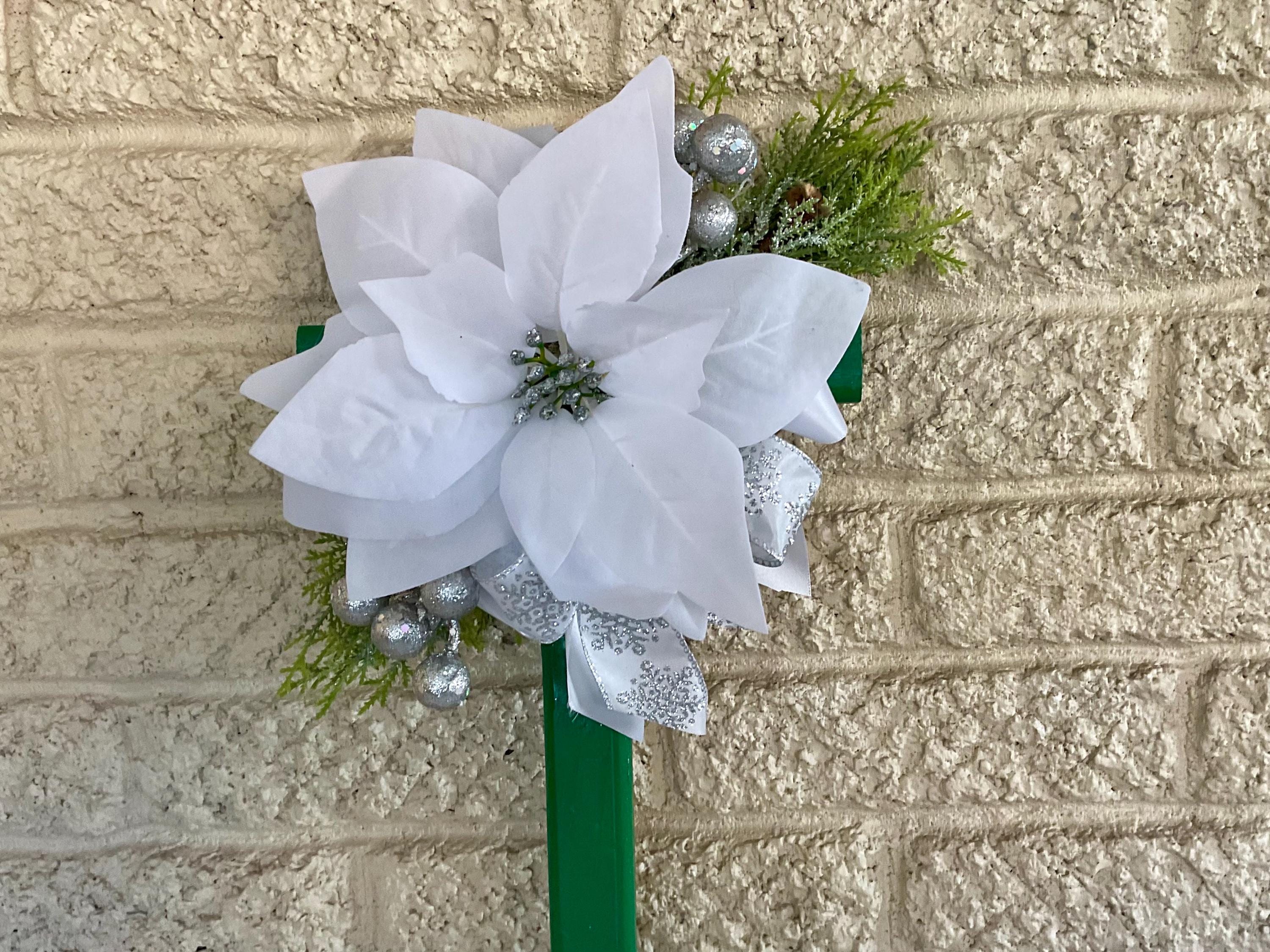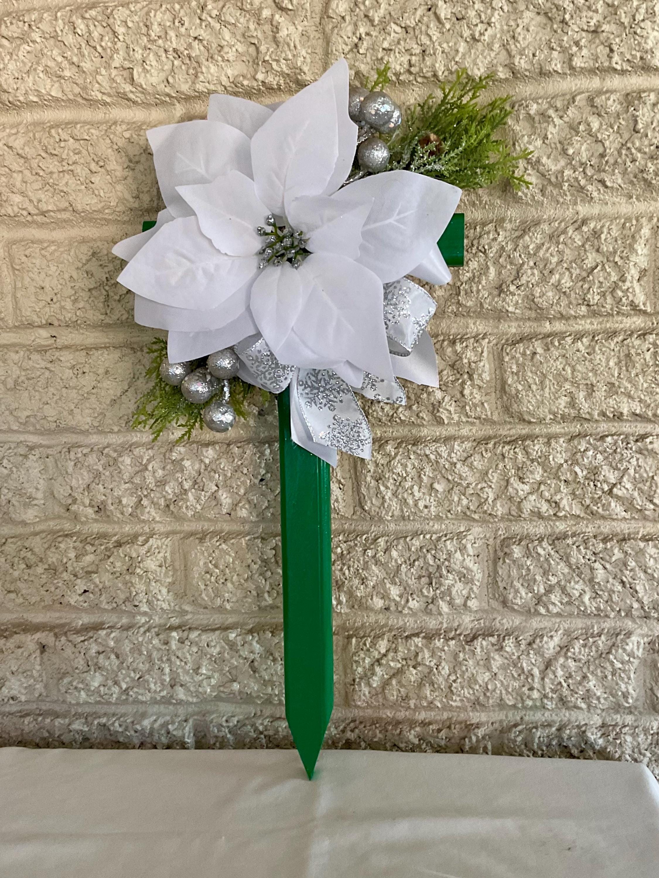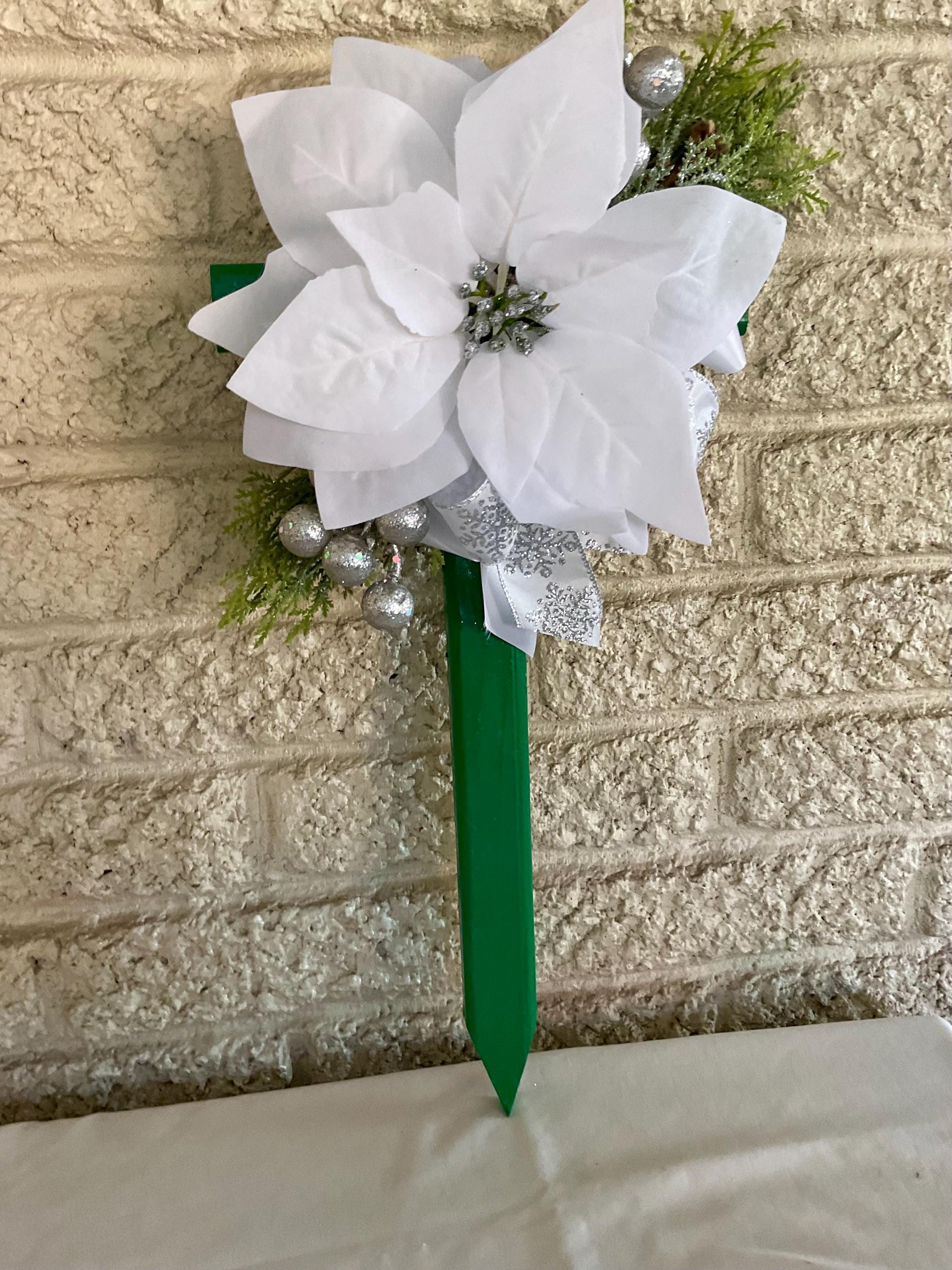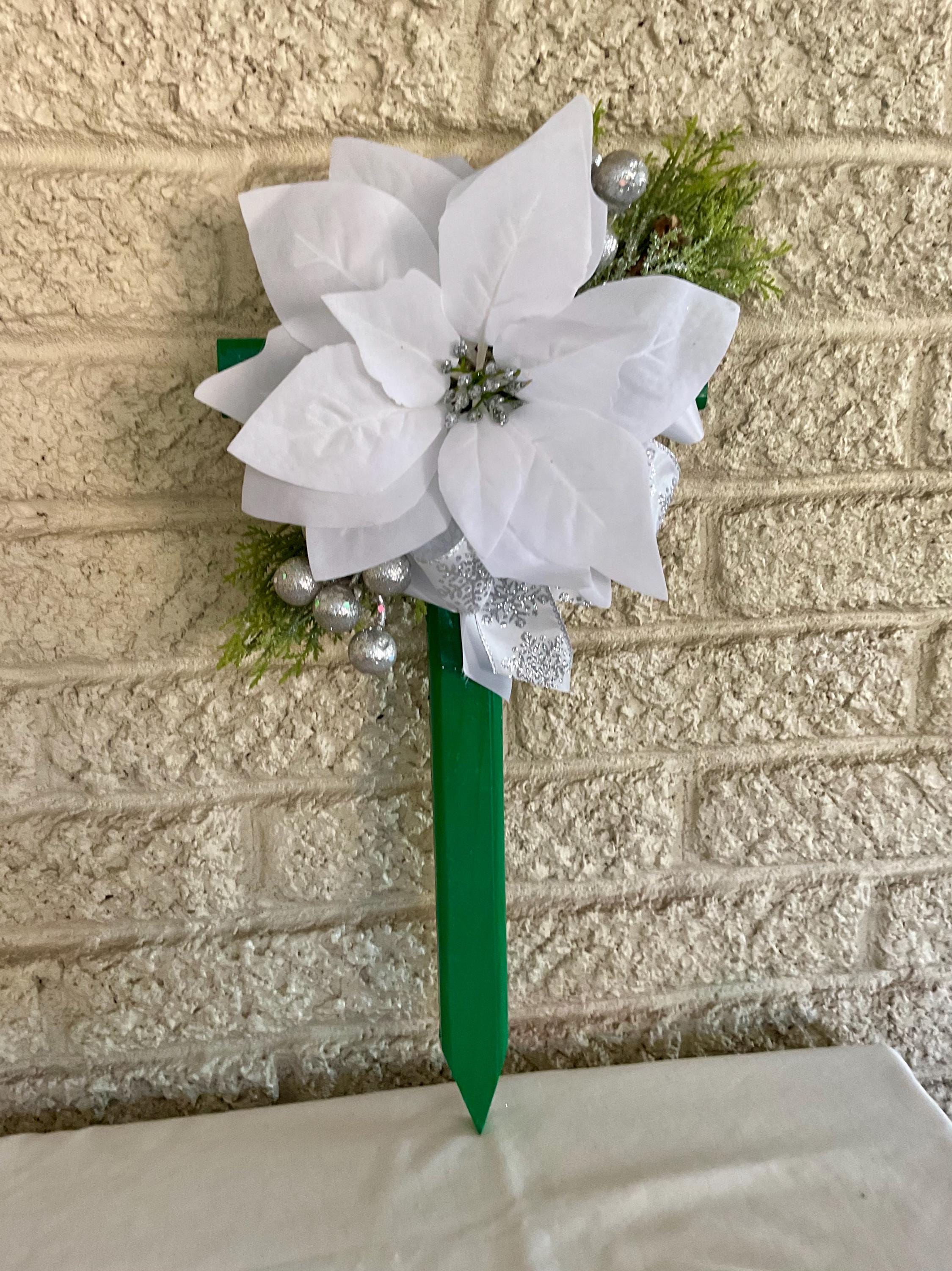This 18” pine cemetery cross has been painted Christmas green with a large white poinsettia, layers of fir branches, silver glitter berry branches, white ribbon, and glitter silver snowflake ribbon. The cross has a pointed end for easy ground insertion. Every cross is sprayed with a coat of clear polyurethane to protect the ribbon and silk flowers from outdoor elements.