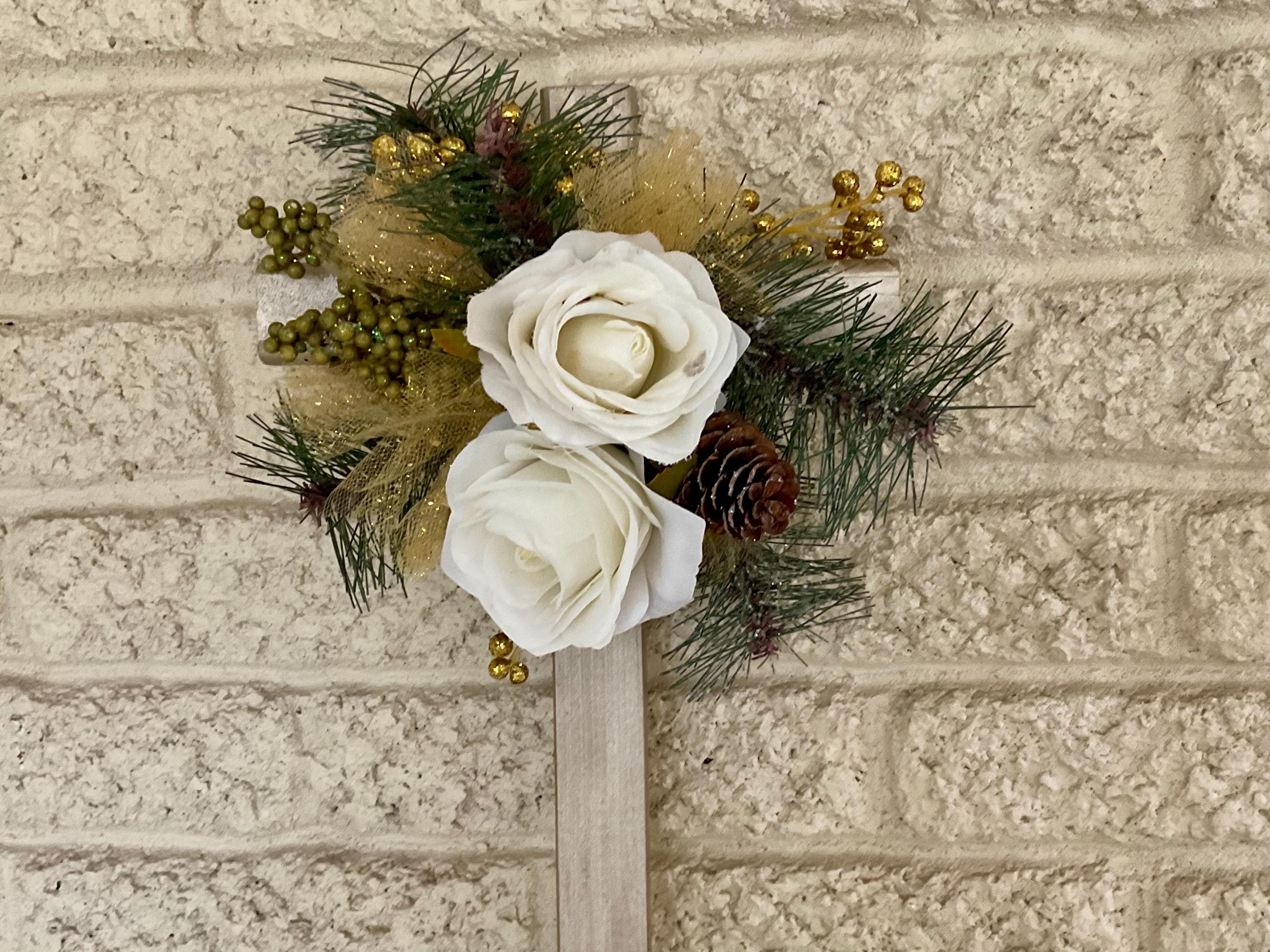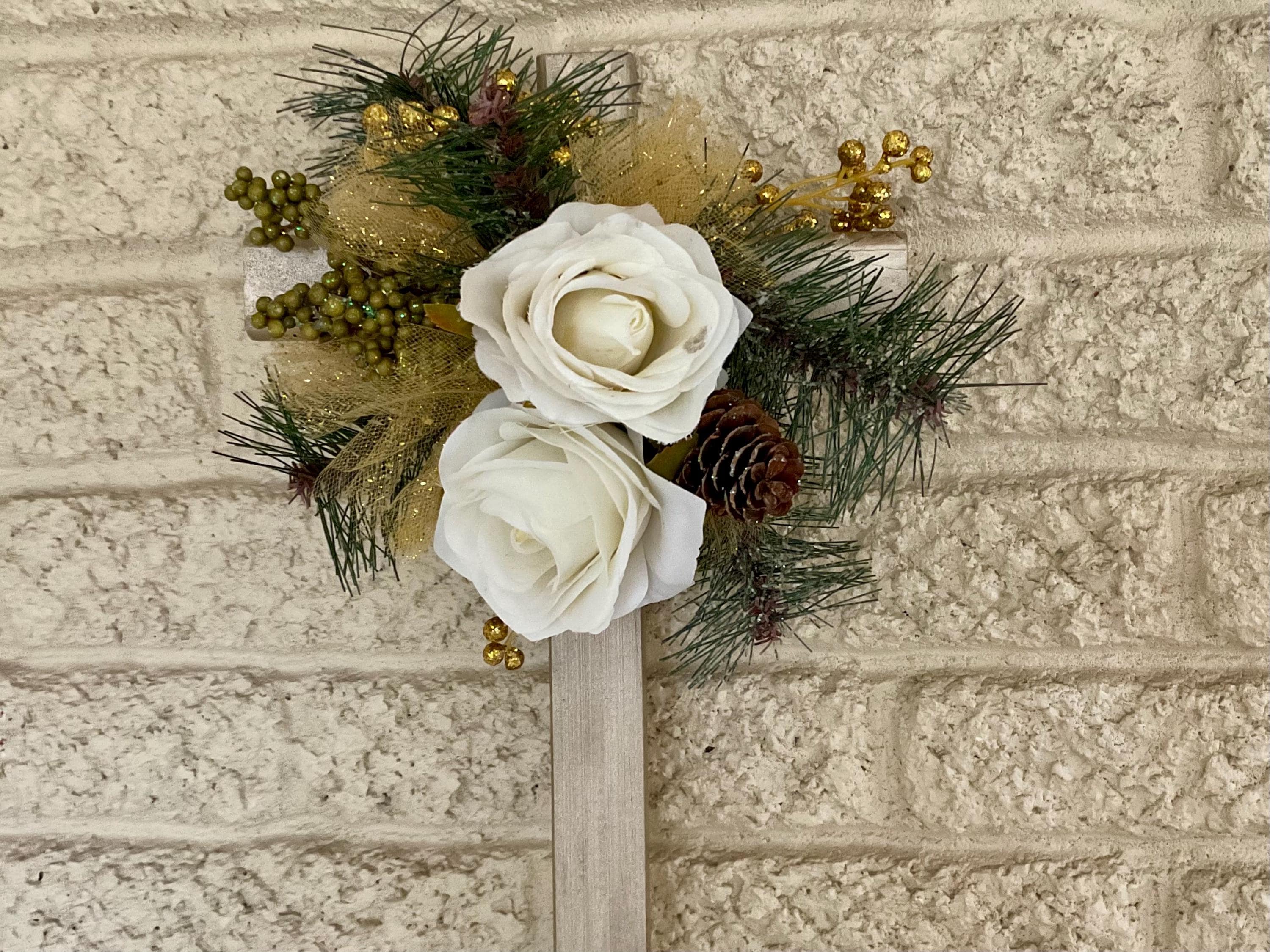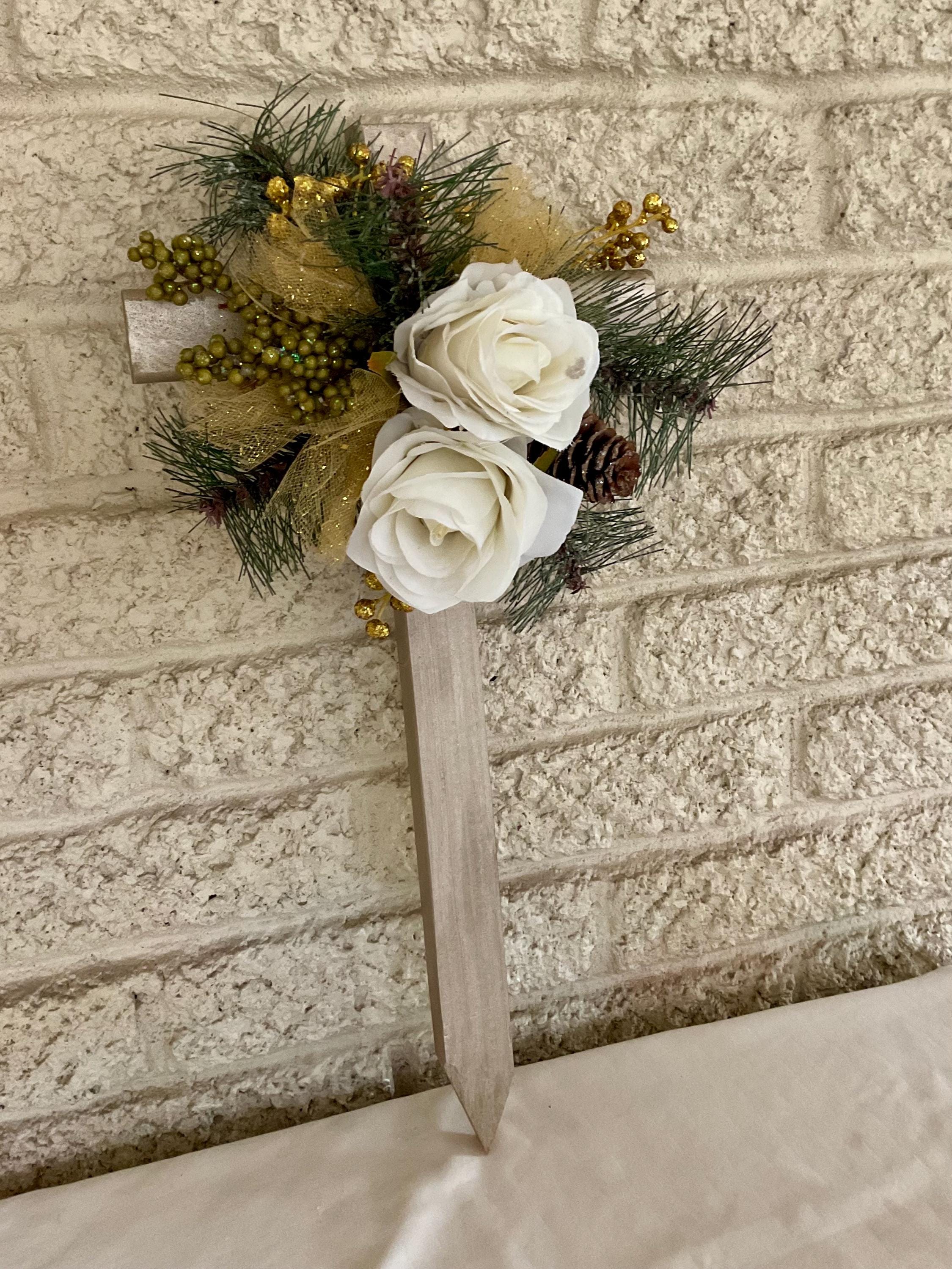 This 18” pine cemetery cross has been painted a metallic color with two large off white roses, layers of snow covered fir branches, bright gold glitter berries, green berry branch, a pine cone, and glitter gold tulle. The cross has a pointed end for easy ground insertion. Every cross is sprayed with a coat of clear polyurethane to protect the ribbon and silk flowers from outdoor elements.