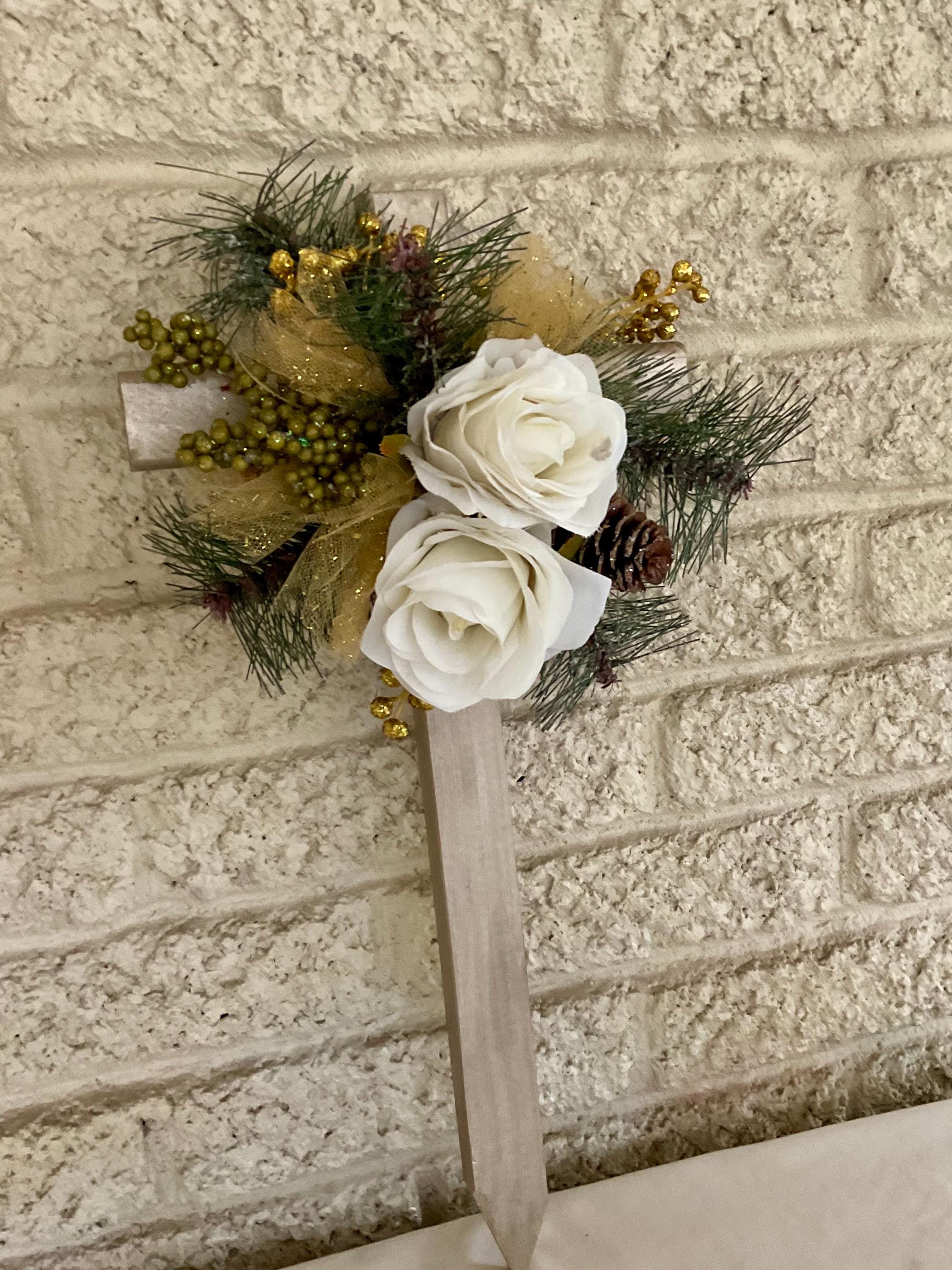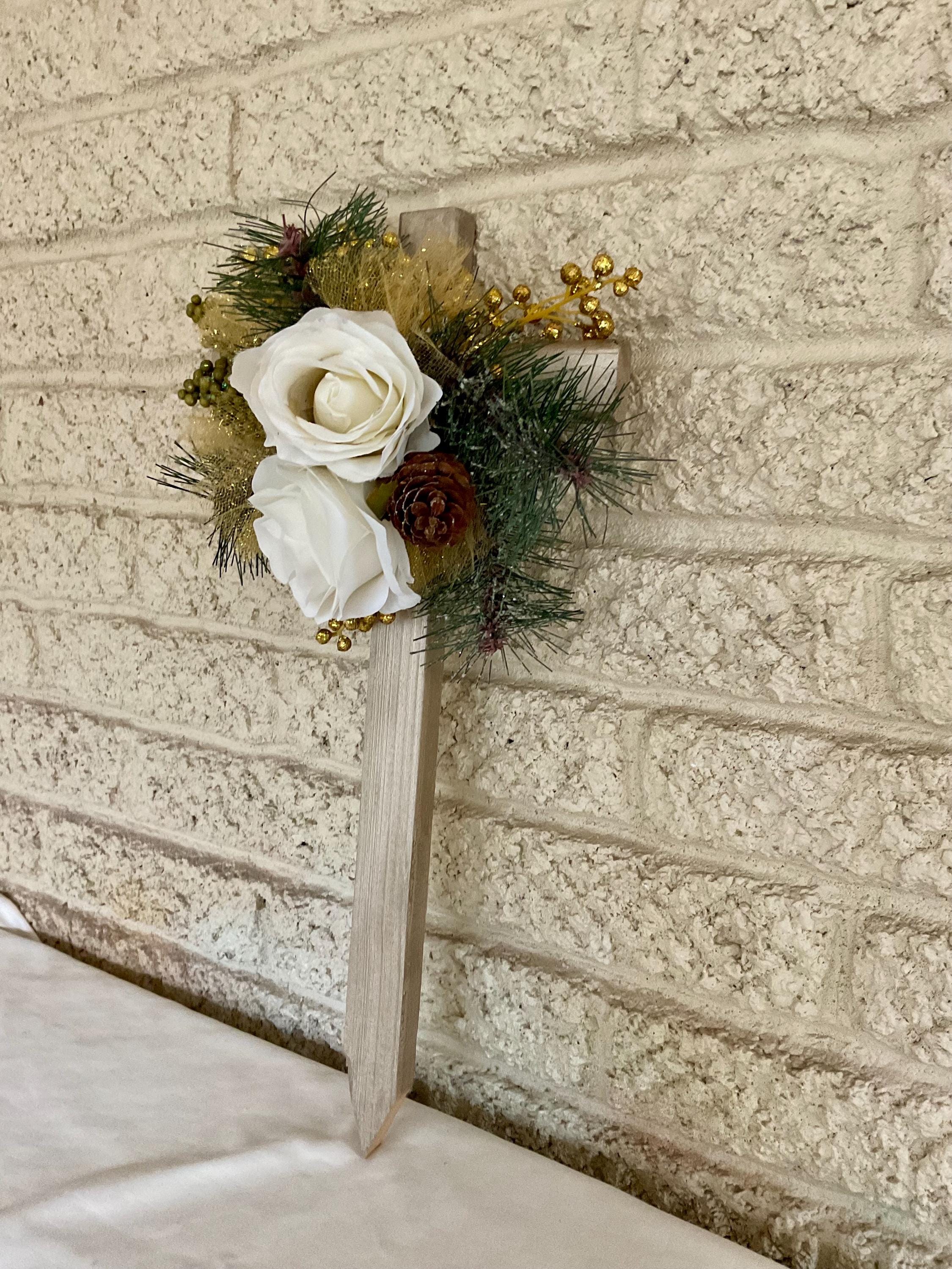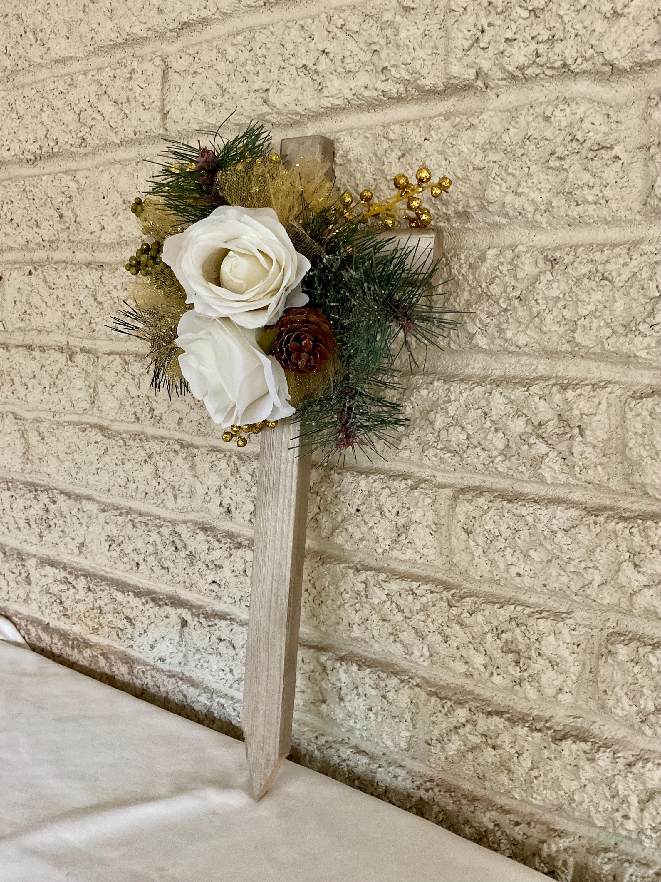 This 18” pine cemetery cross has been painted a metallic color with two large off white roses, layers of snow covered fir branches, bright gold glitter berries, green berry branch, a pine cone, and glitter gold tulle. The cross has a pointed end for easy ground insertion. Every cross is sprayed with a coat of clear polyurethane to protect the ribbon and silk flowers from outdoor elements.