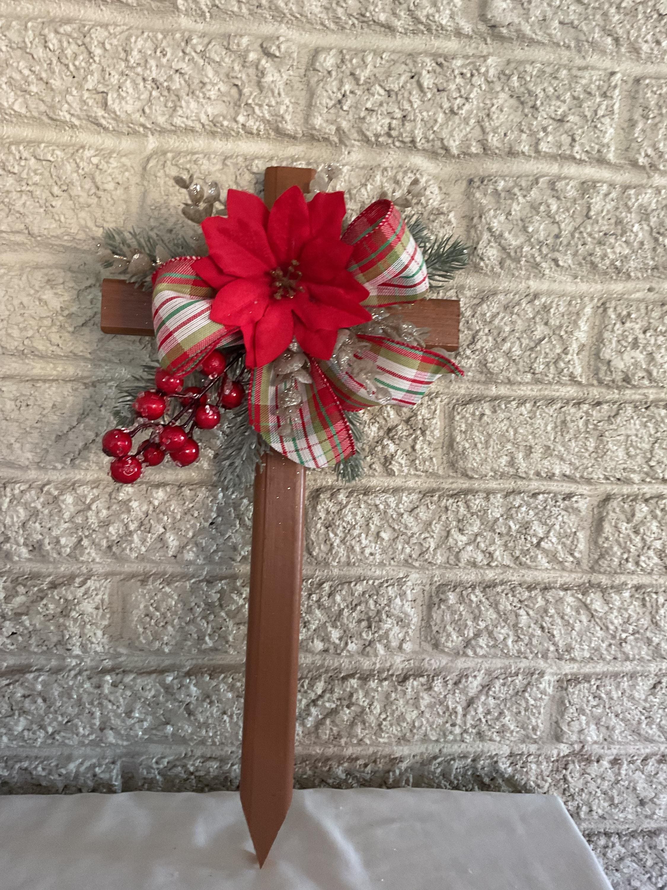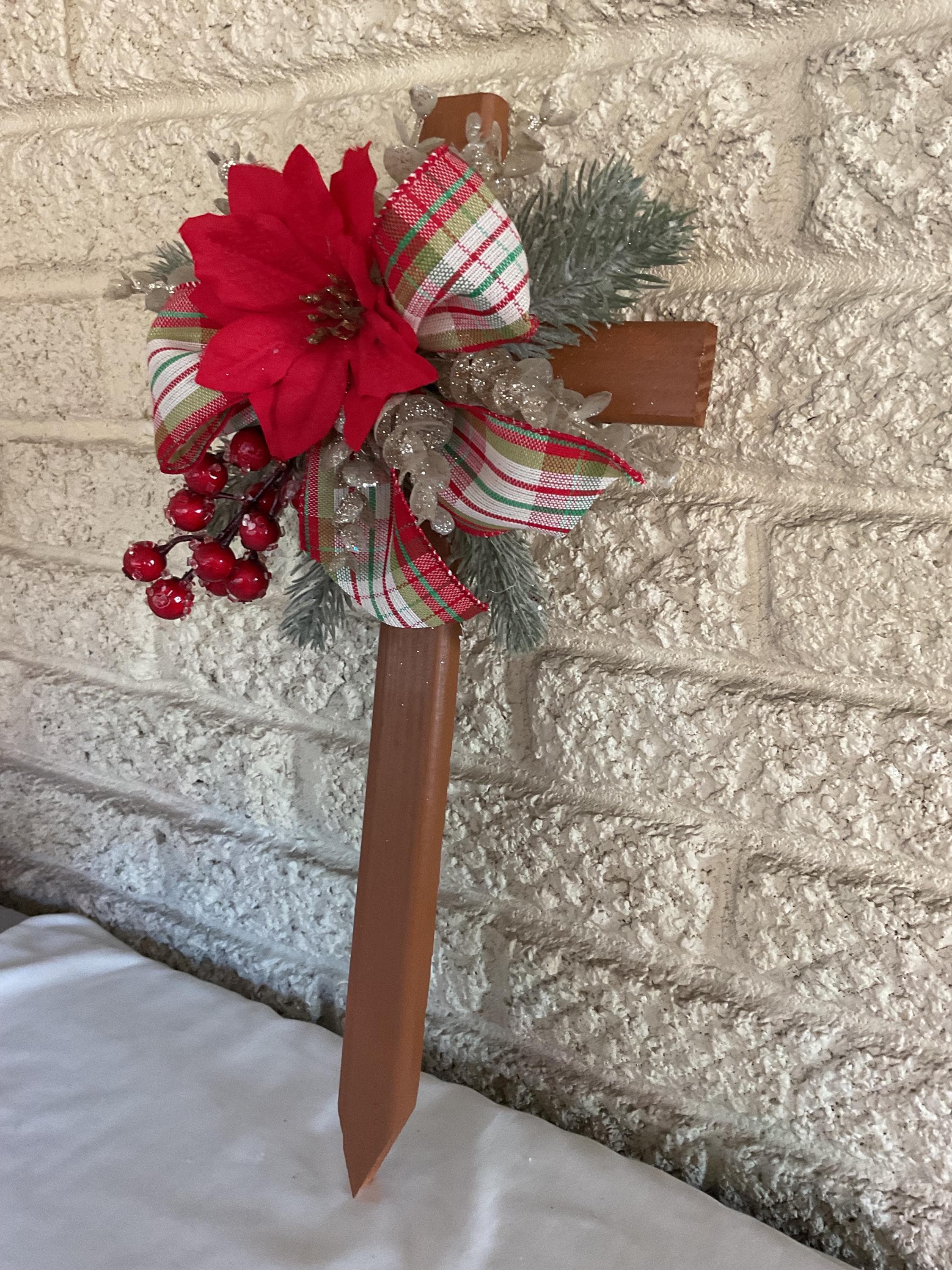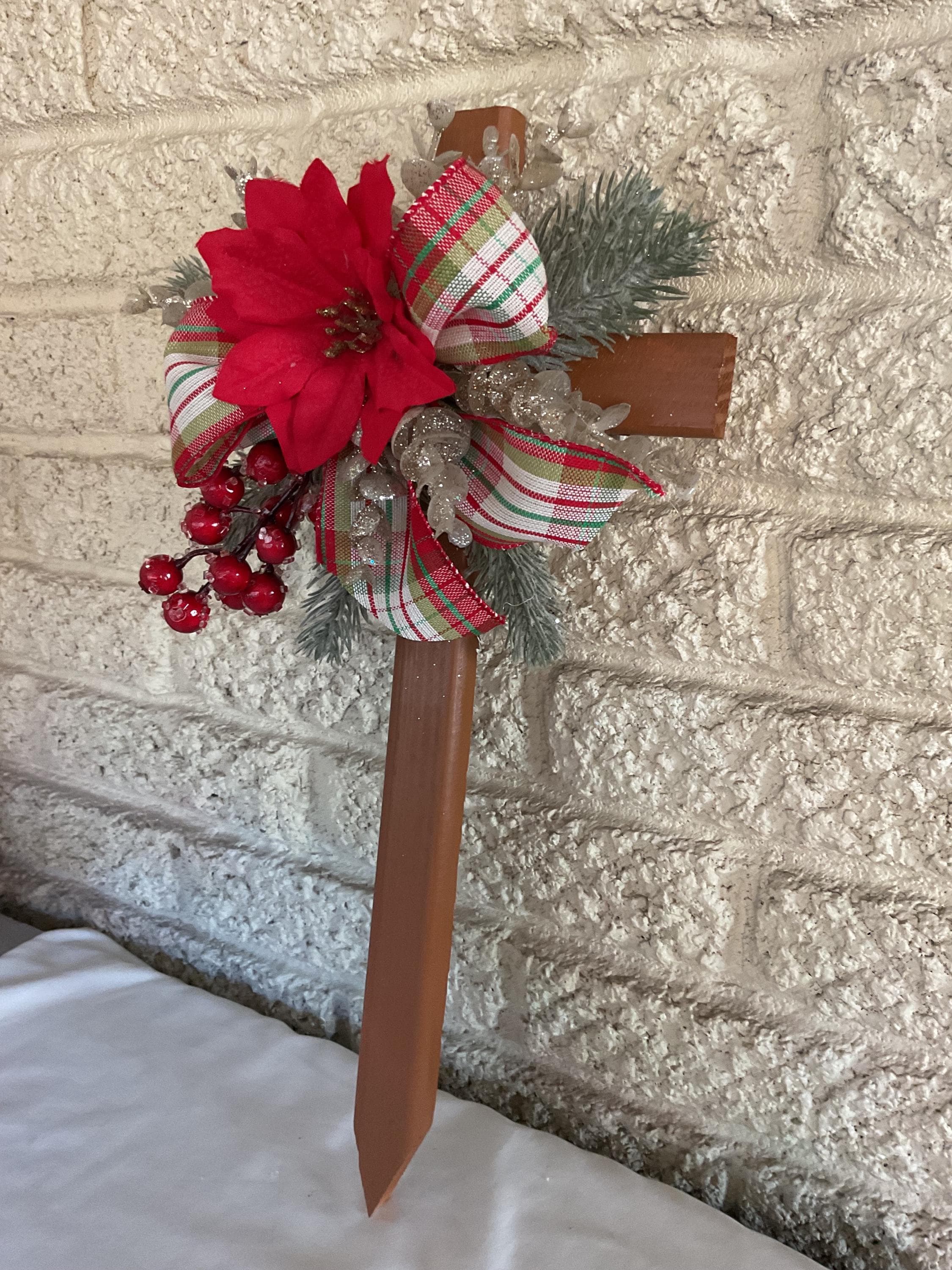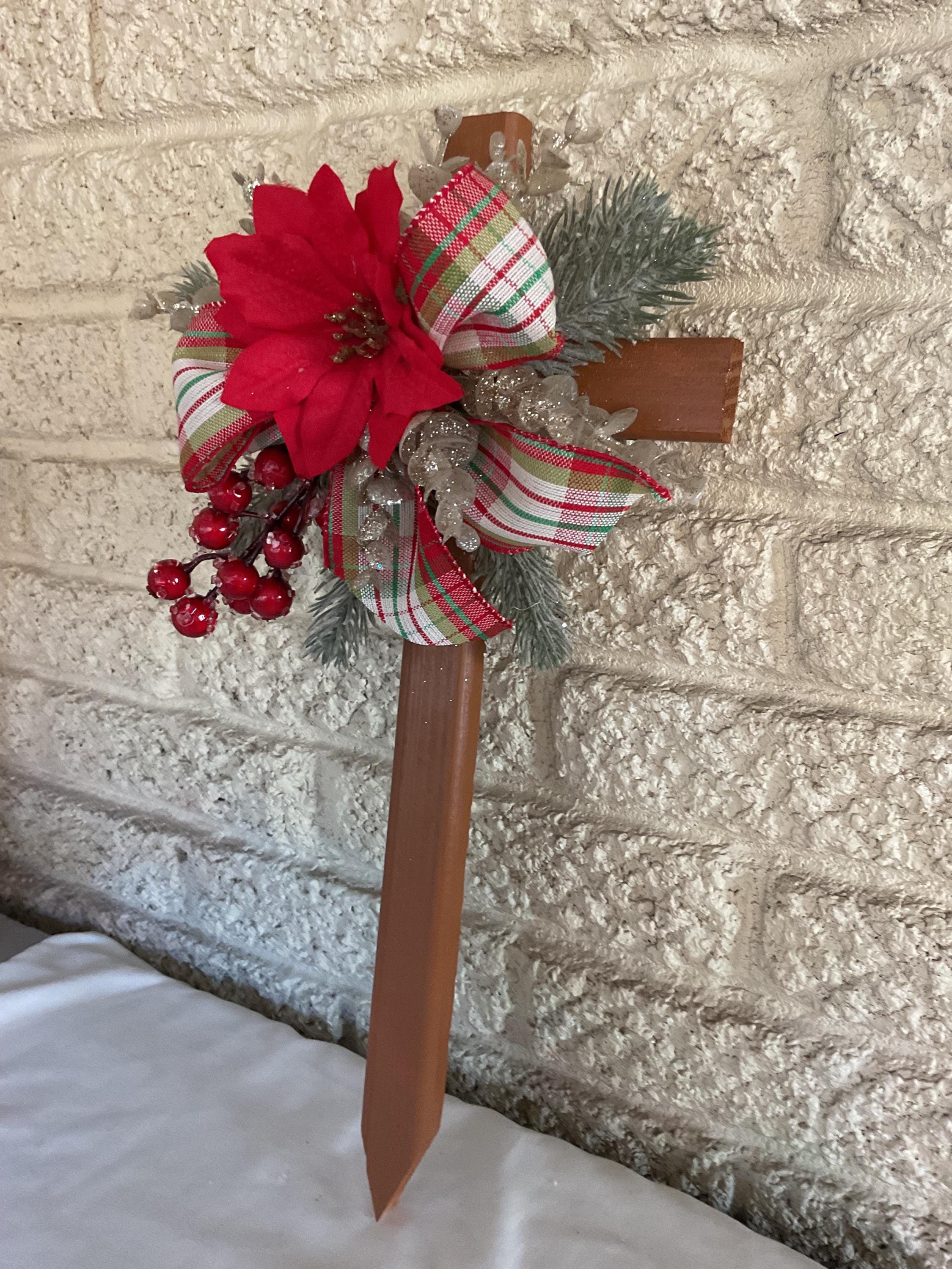 This 18” pine cemetery cross has been painted gingerbread brown with a red poinsettia centered ,layers of fir branches, gold glitter floral picks, and red/white/and green plaid holiday ribbon. The cross has a pointed end for easy ground insertion. Every cross is sprayed with a coat of clear polyurethane to protect the ribbon and silk flowers from outdoor elements.
