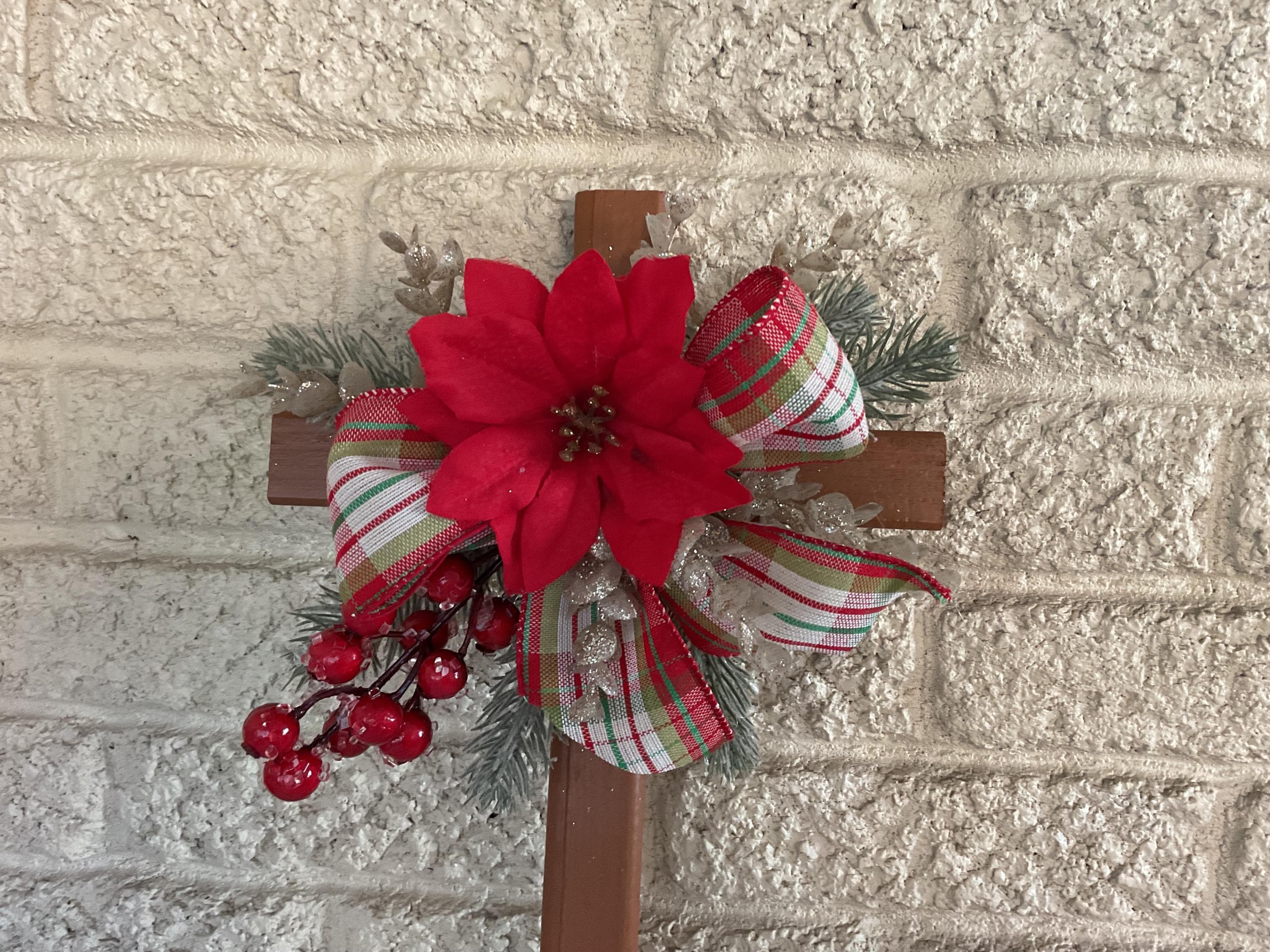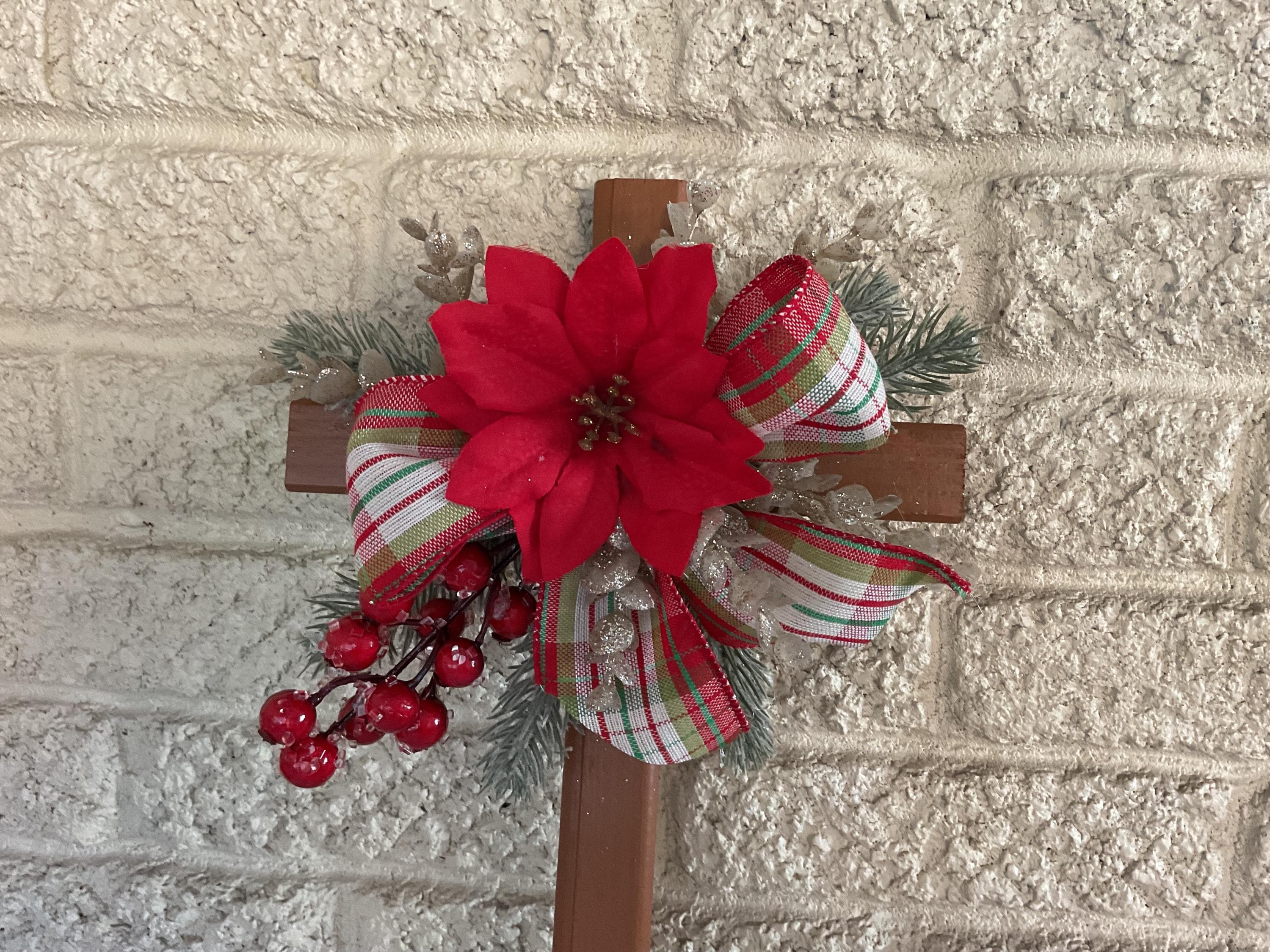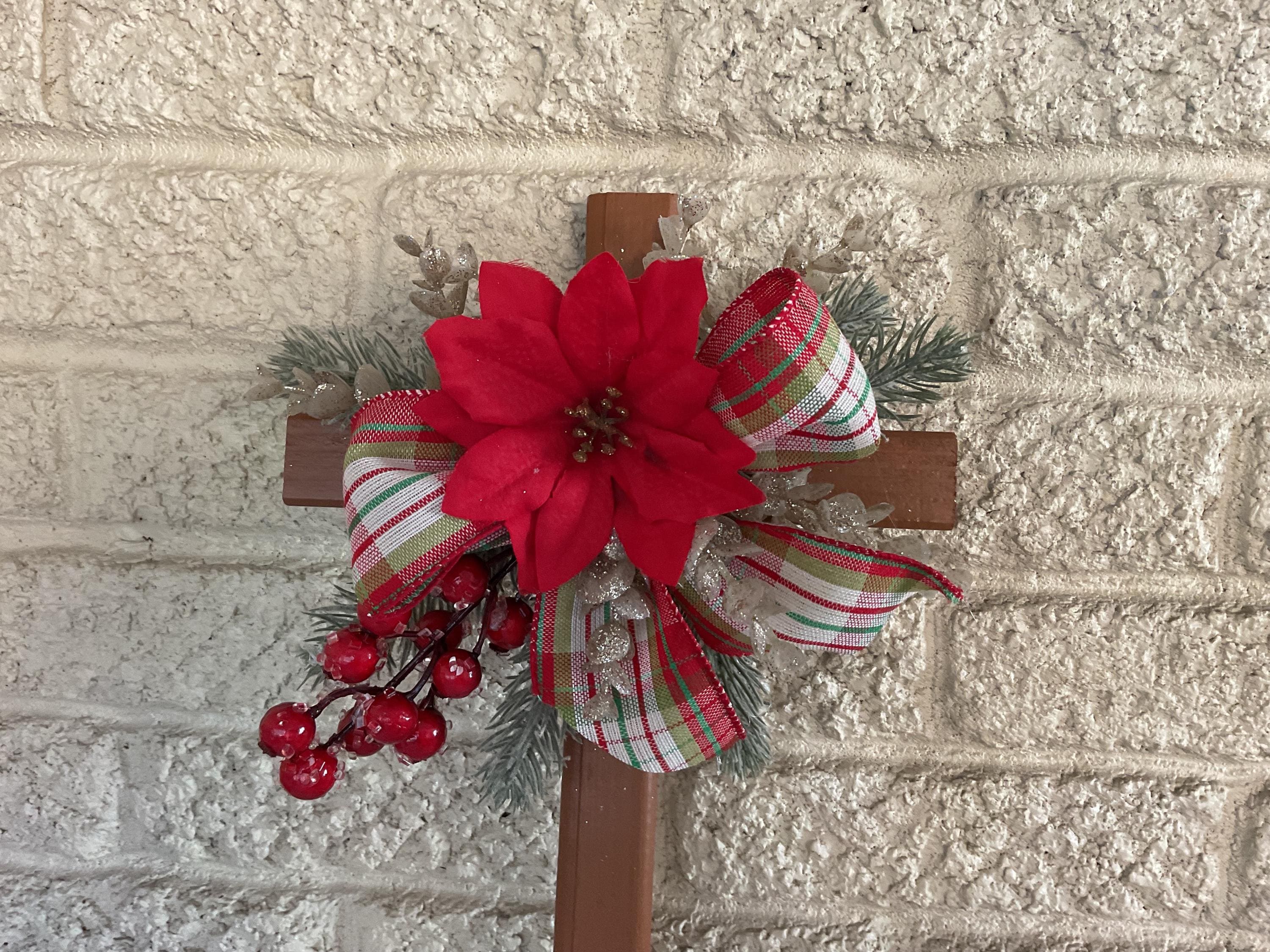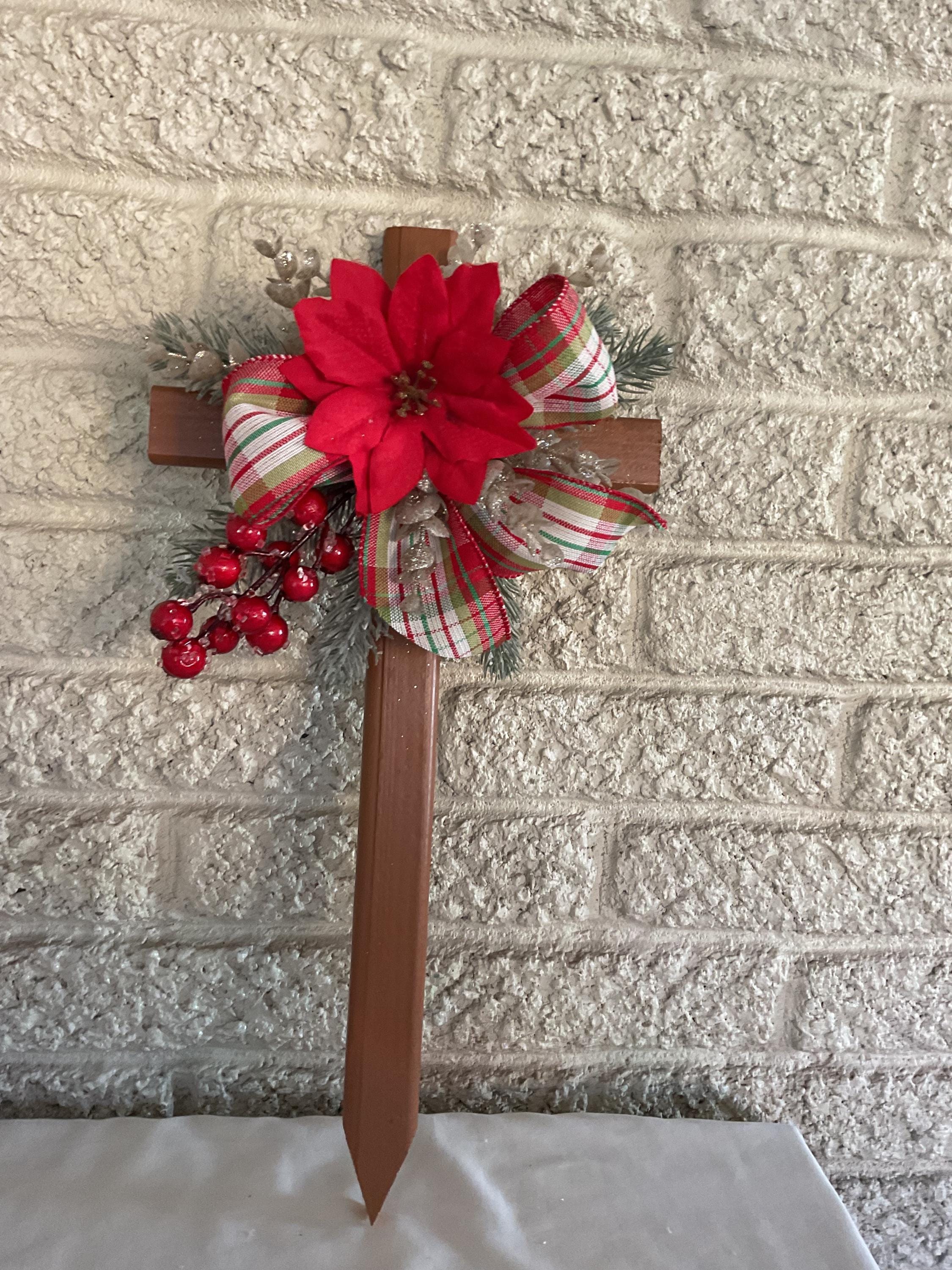 This 18” pine cemetery cross has been painted gingerbread brown with a red poinsettia centered ,layers of fir branches, gold glitter floral picks, and red/white/and green plaid holiday ribbon. The cross has a pointed end for easy ground insertion. Every cross is sprayed with a coat of clear polyurethane to protect the ribbon and silk flowers from outdoor elements.