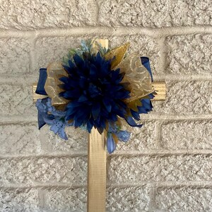 This 18” pine cemetery cross has been painted gingerbread brown with two large snowball flowers with cherry centers, layers of fir branches, frosted red berries, and a vintage like holiday ribbon. The cross has a pointed end for easy ground insertion. Every cross is sprayed with a coat of clear polyurethane to protect the ribbon and silk flowers from outdoor elements.