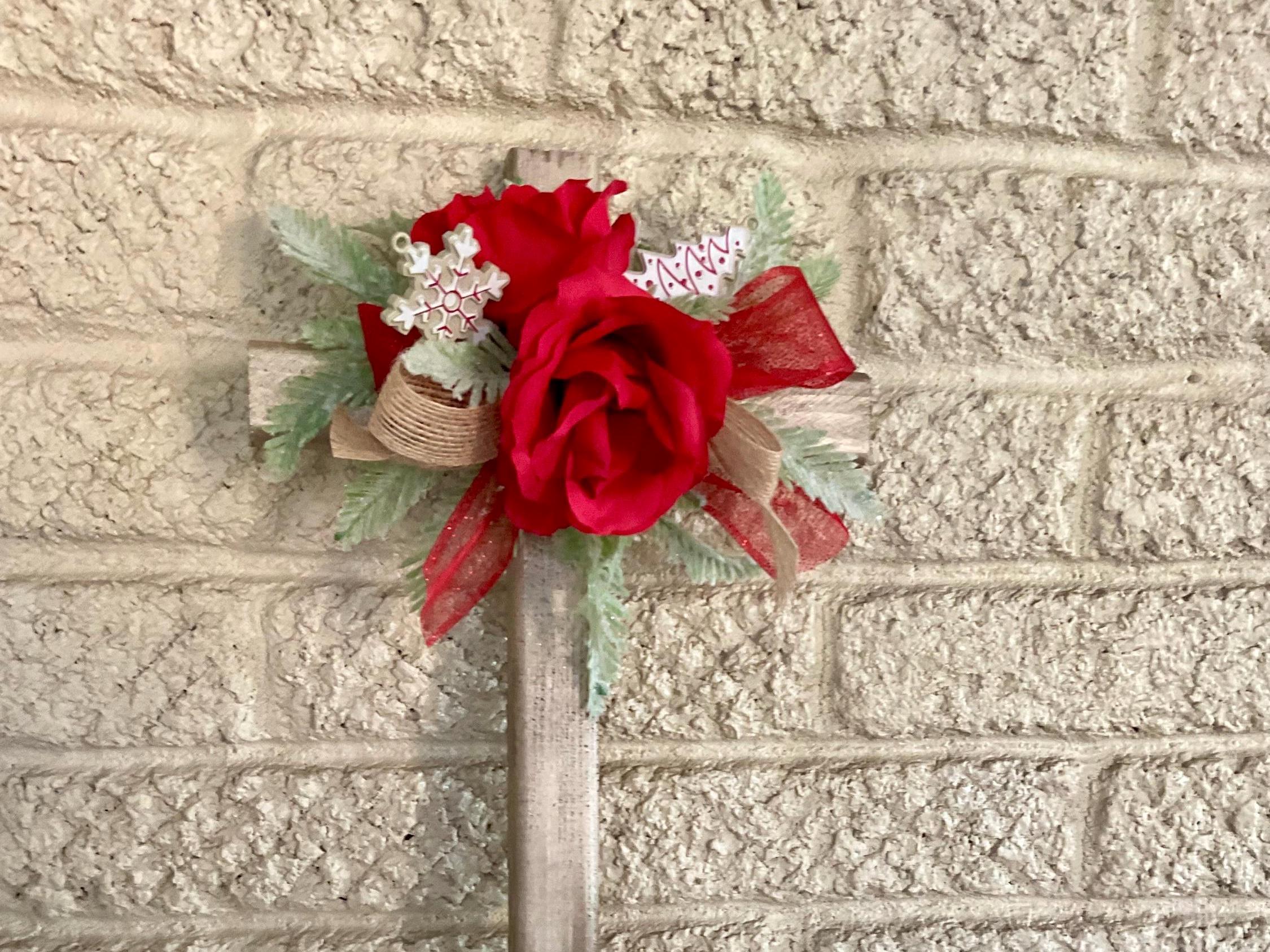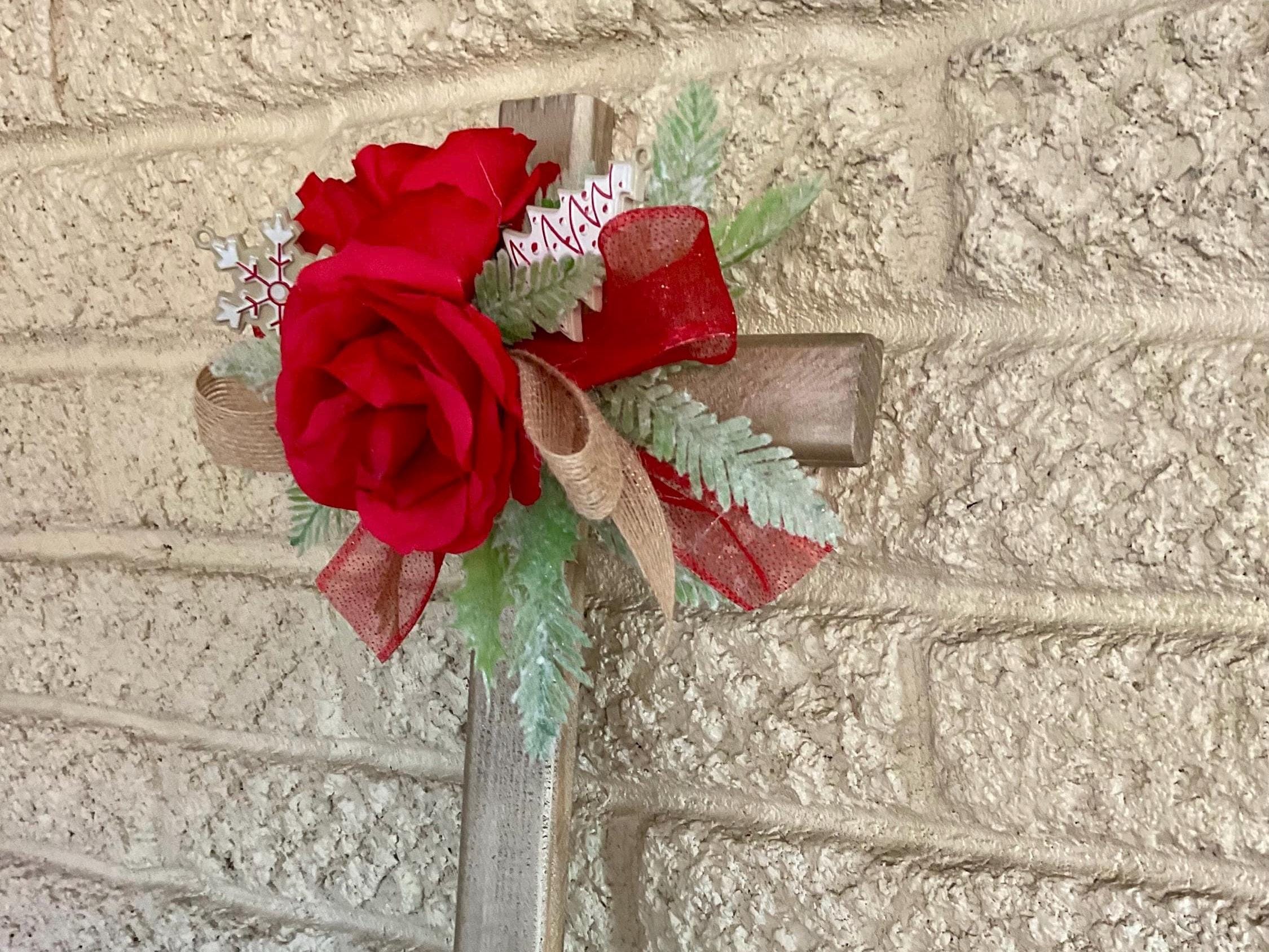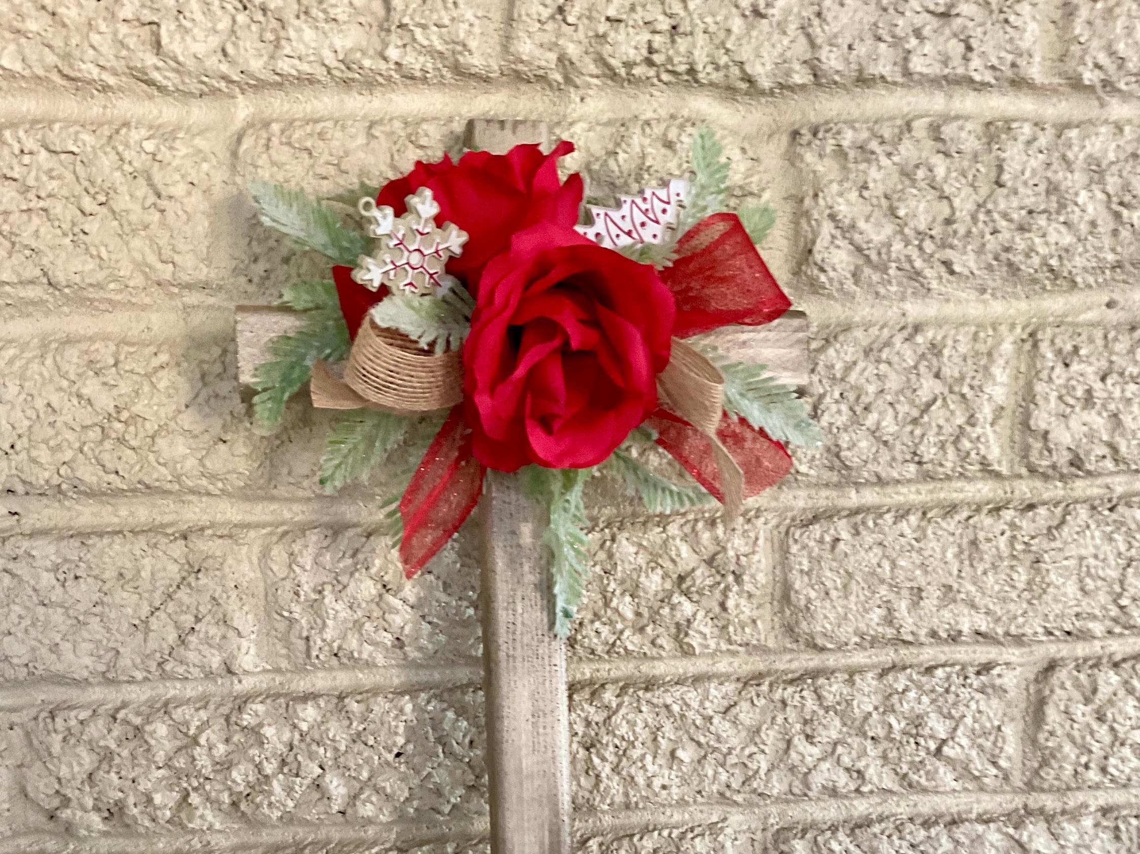 This 18” pine cemetery cross has been painted metallic with two red roses, sage leaves, red berries, two holiday picks to match, burlap ribbon, and red glitter ribbon. The cross has a pointed end for easy ground insertion. Every cross is sprayed with a coat of clear polyurethane to protect the ribbon and silk flowers from outdoor elements.