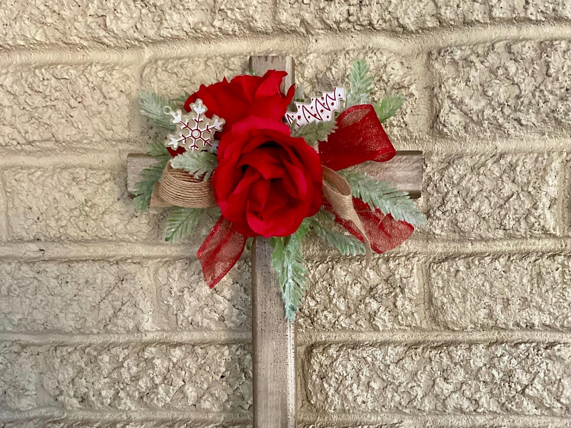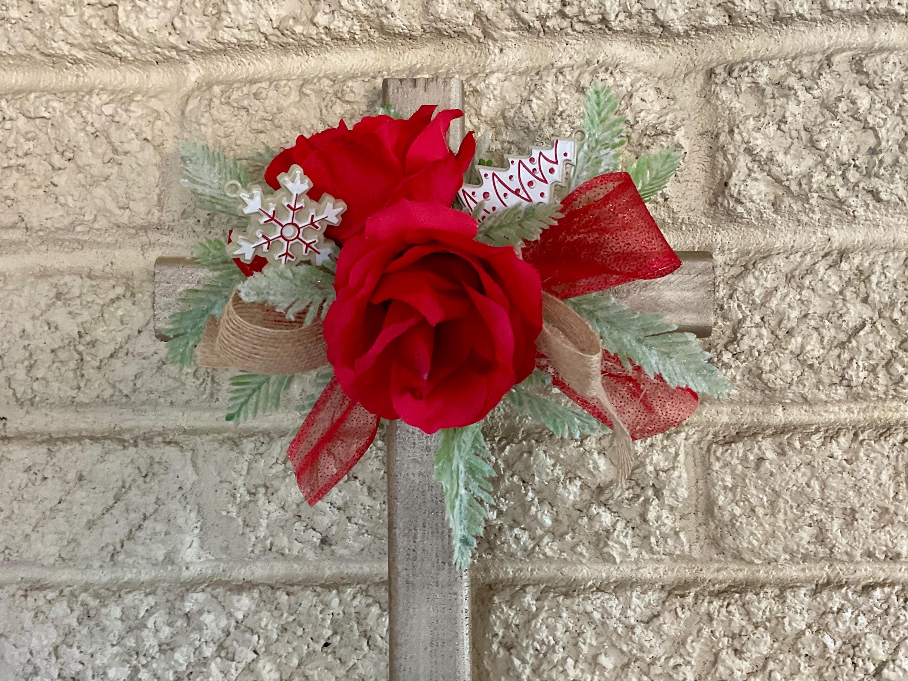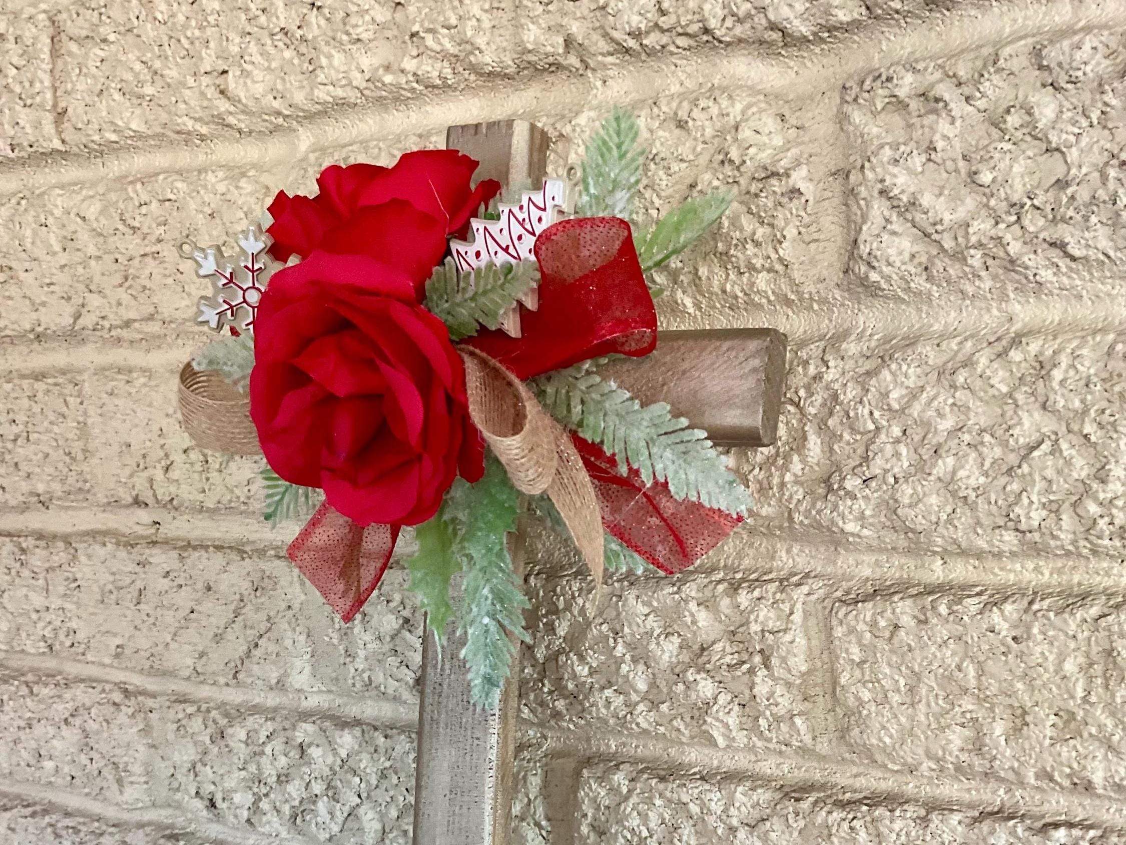This 18” pine cemetery cross has been painted metallic with two red roses, sage leaves, red berries, two holiday picks to match, burlap ribbon, and red glitter ribbon. The cross has a pointed end for easy ground insertion. Every cross is sprayed with a coat of clear polyurethane to protect the ribbon and silk flowers from outdoor elements.