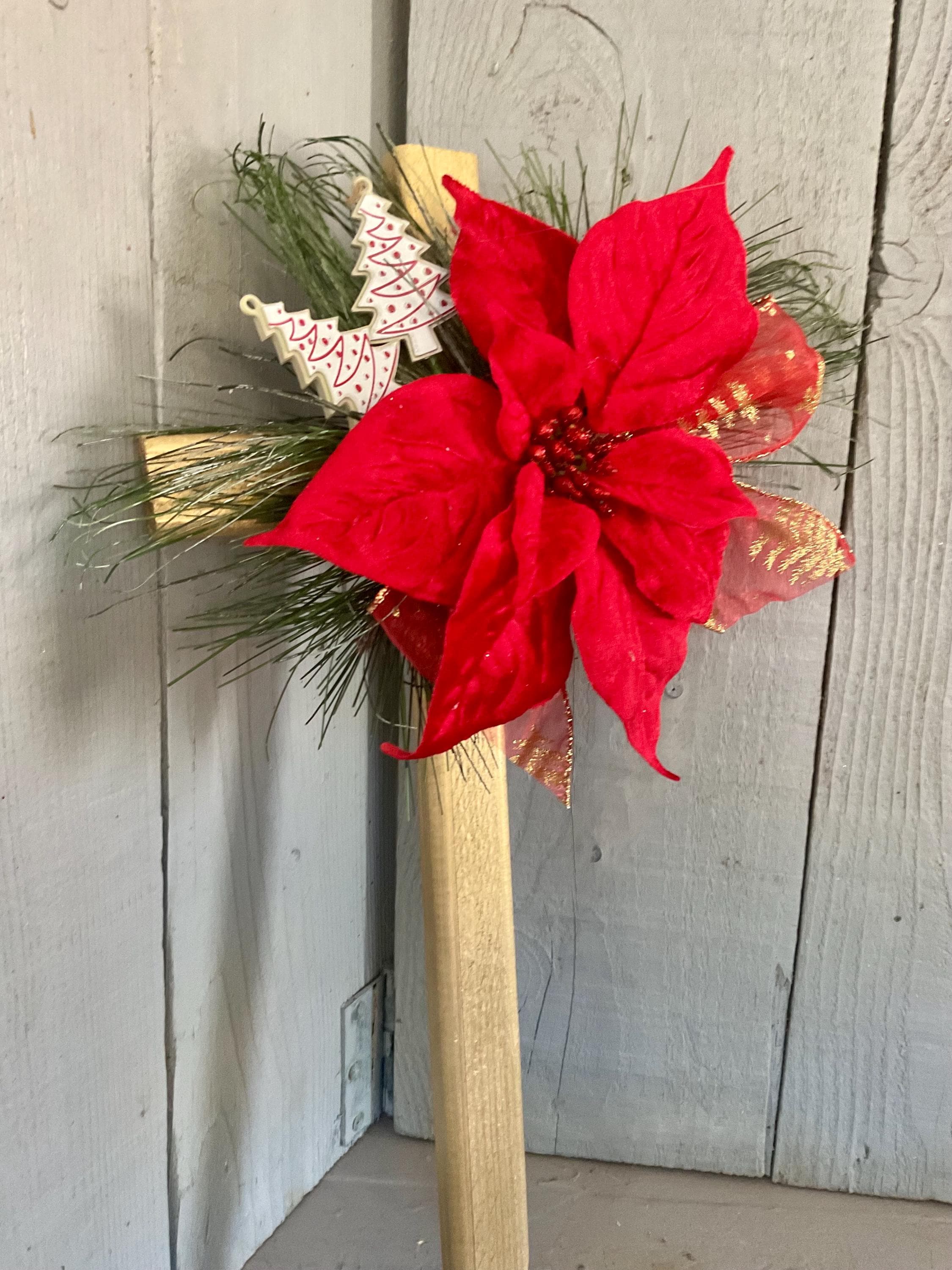 This 18” pine cemetery cross has been painted gold with a large red velvet poinsettia, two Christmas tree picks, fir branches, and red and gold Christmas ribbon. The cross has a pointed end for easy ground insertion. Every cross is sprayed with a coat of clear polyurethane to protect the ribbon and silk flowers from outdoor elements.