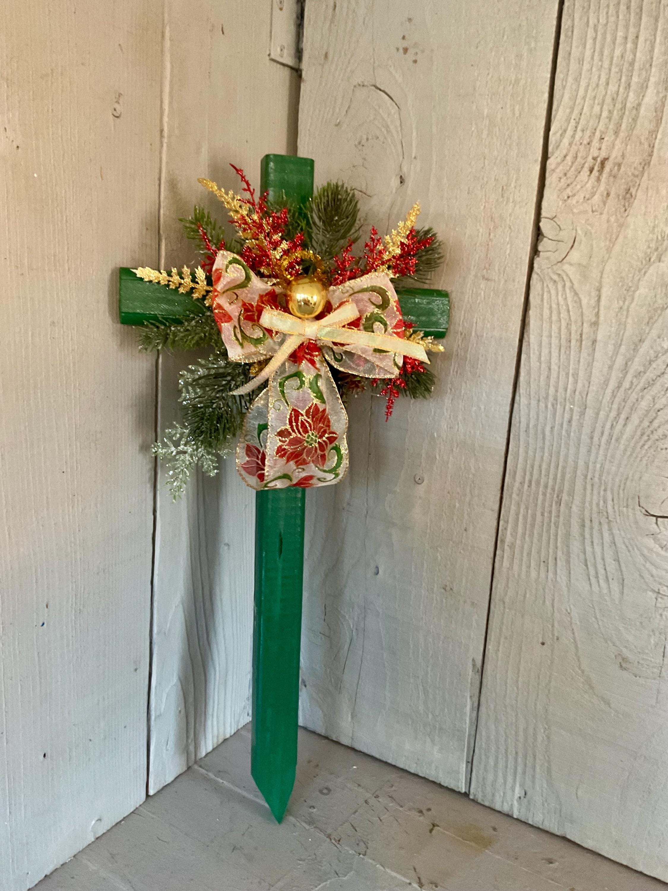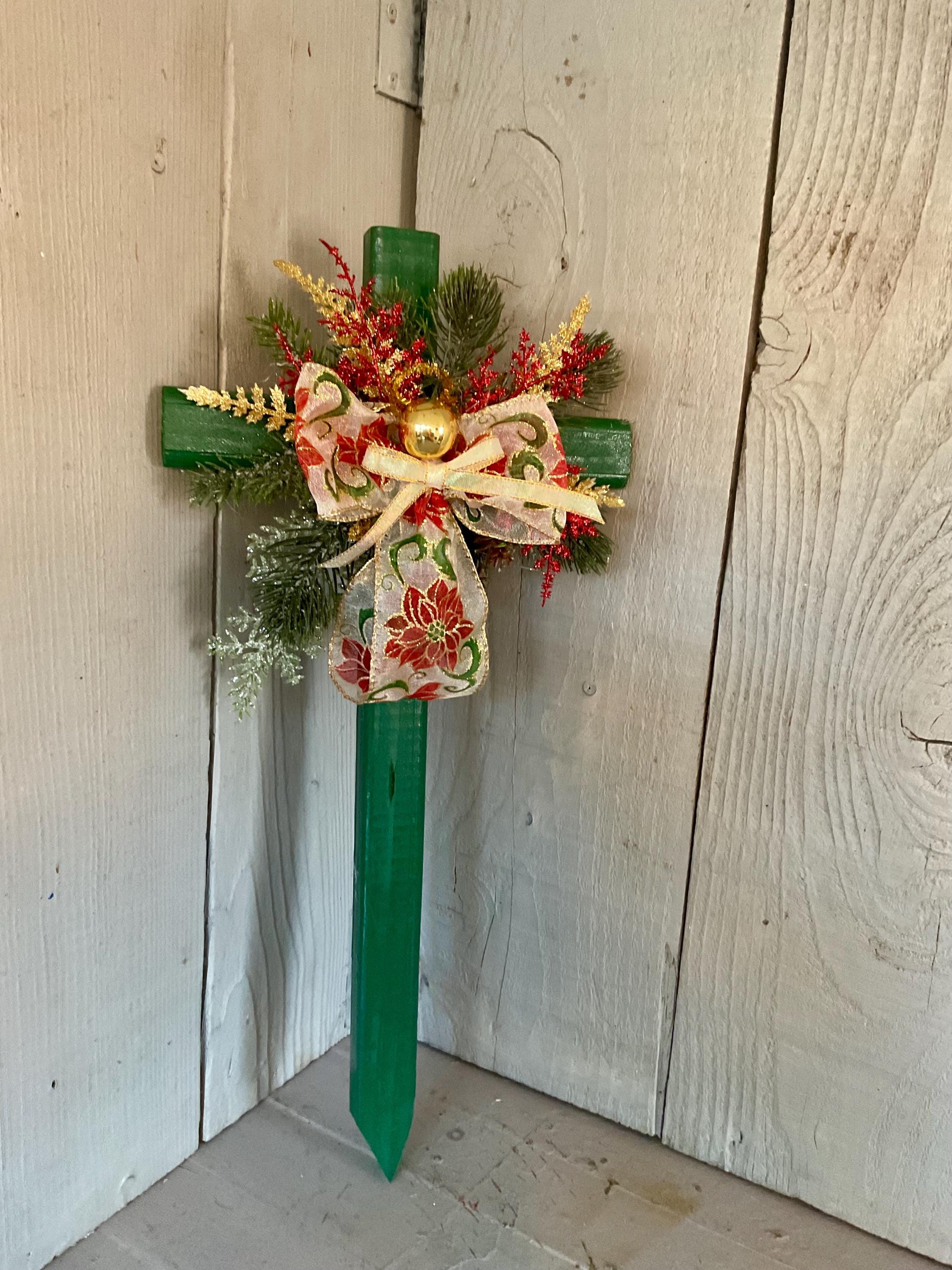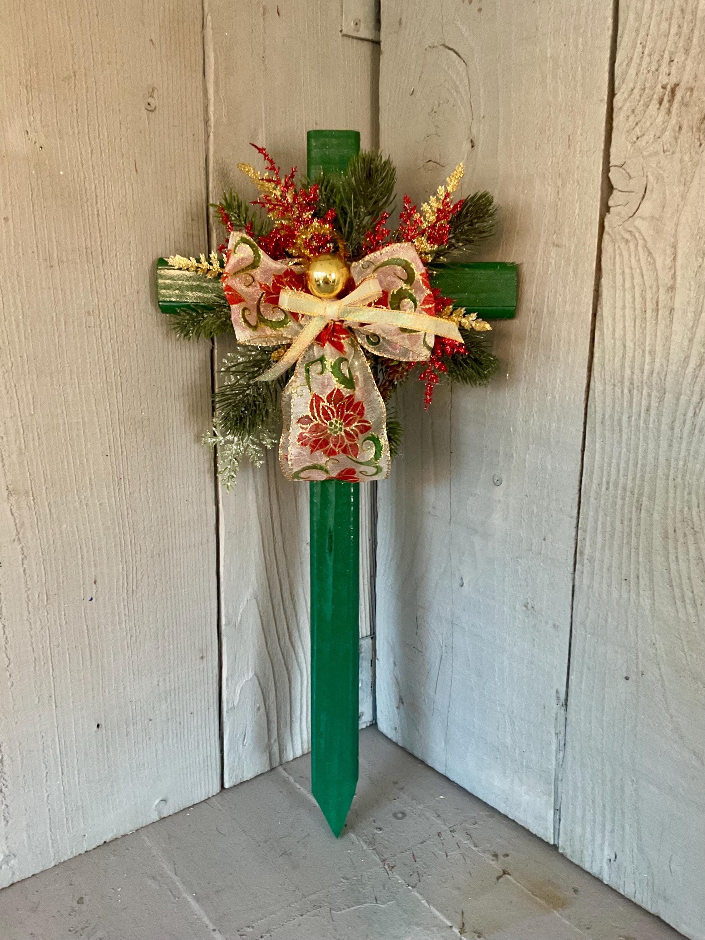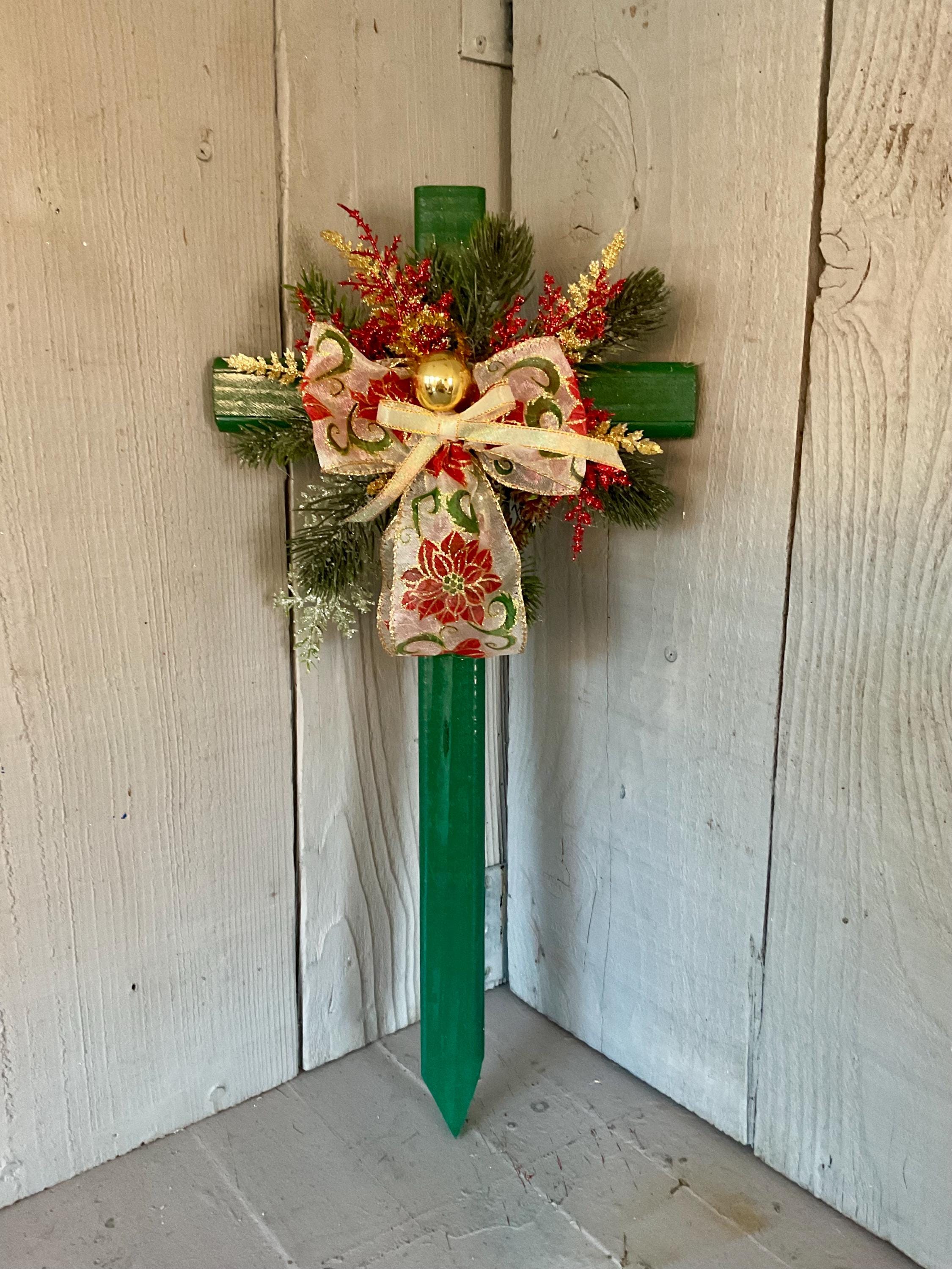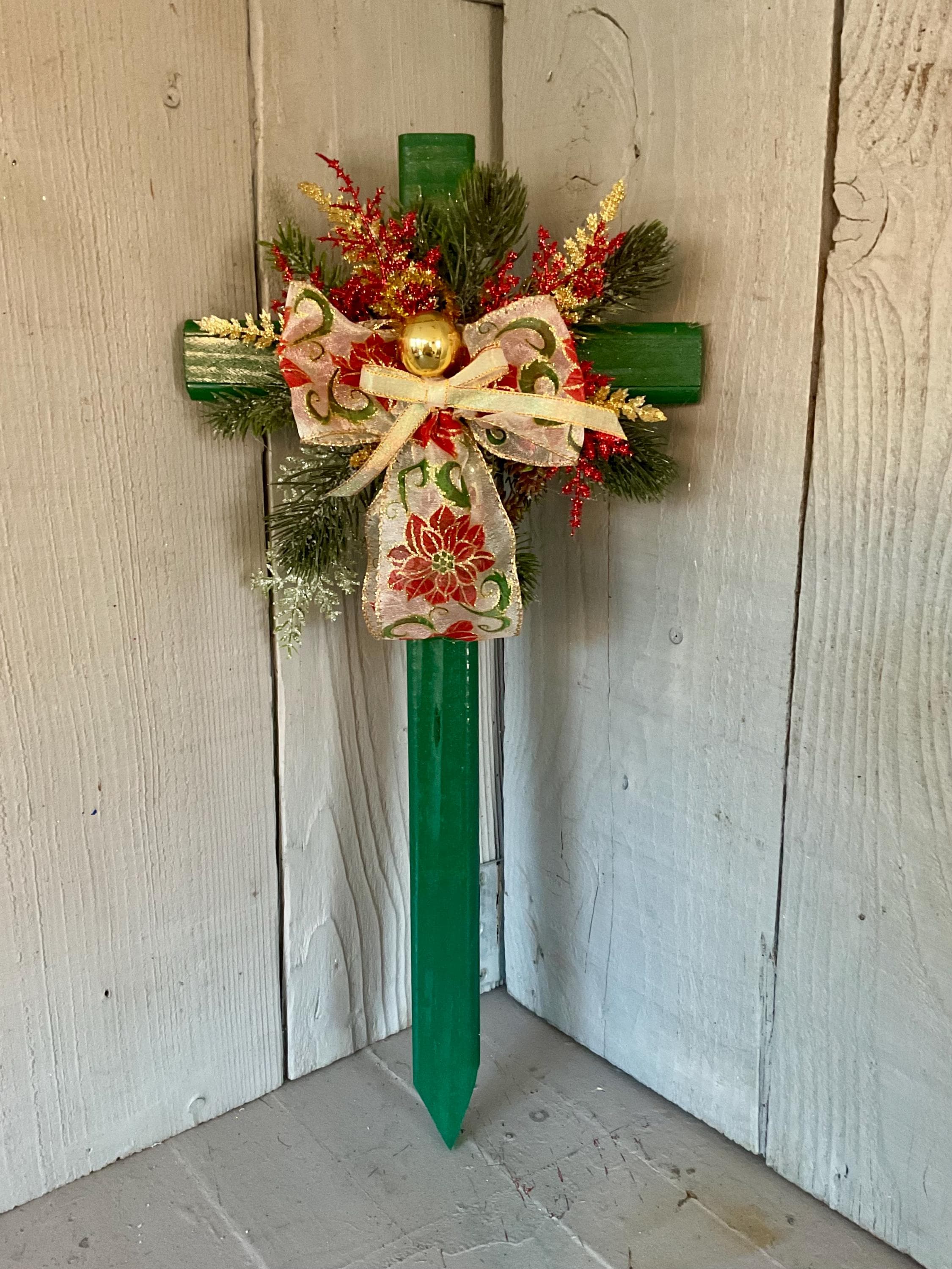 poinsettia print ribbon. The cross has a pointed end for easy ground insertion. Every cross is sprayed with a coat of clear polyurethane to protect the ribbon and silk flowers from outdoor elements.