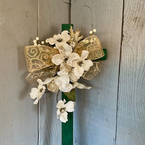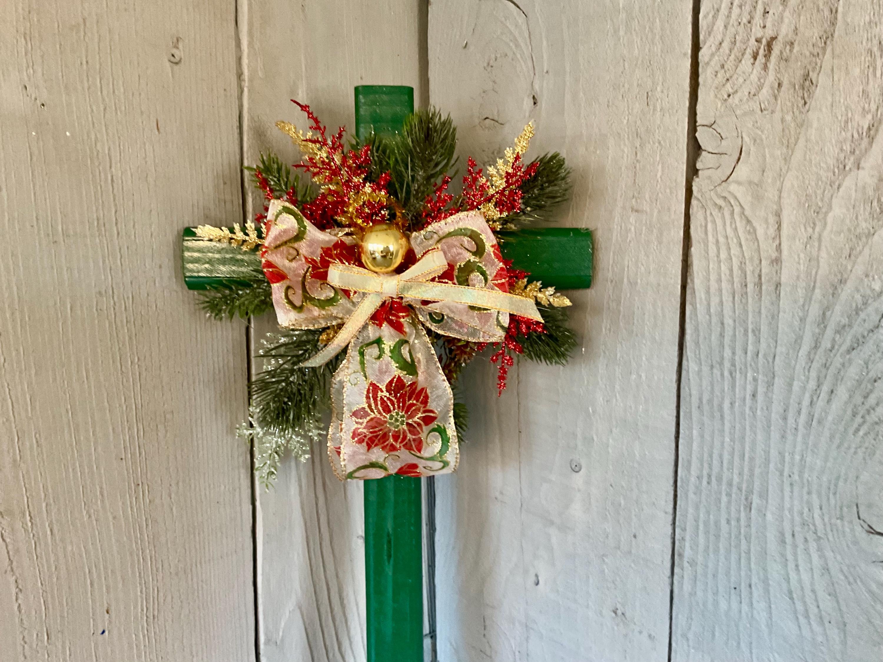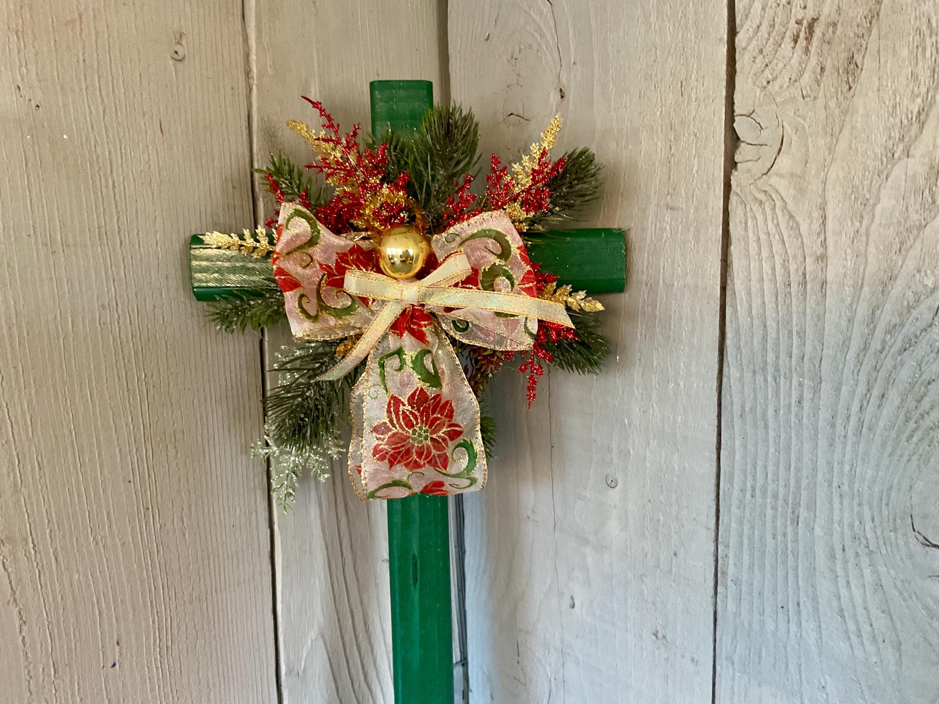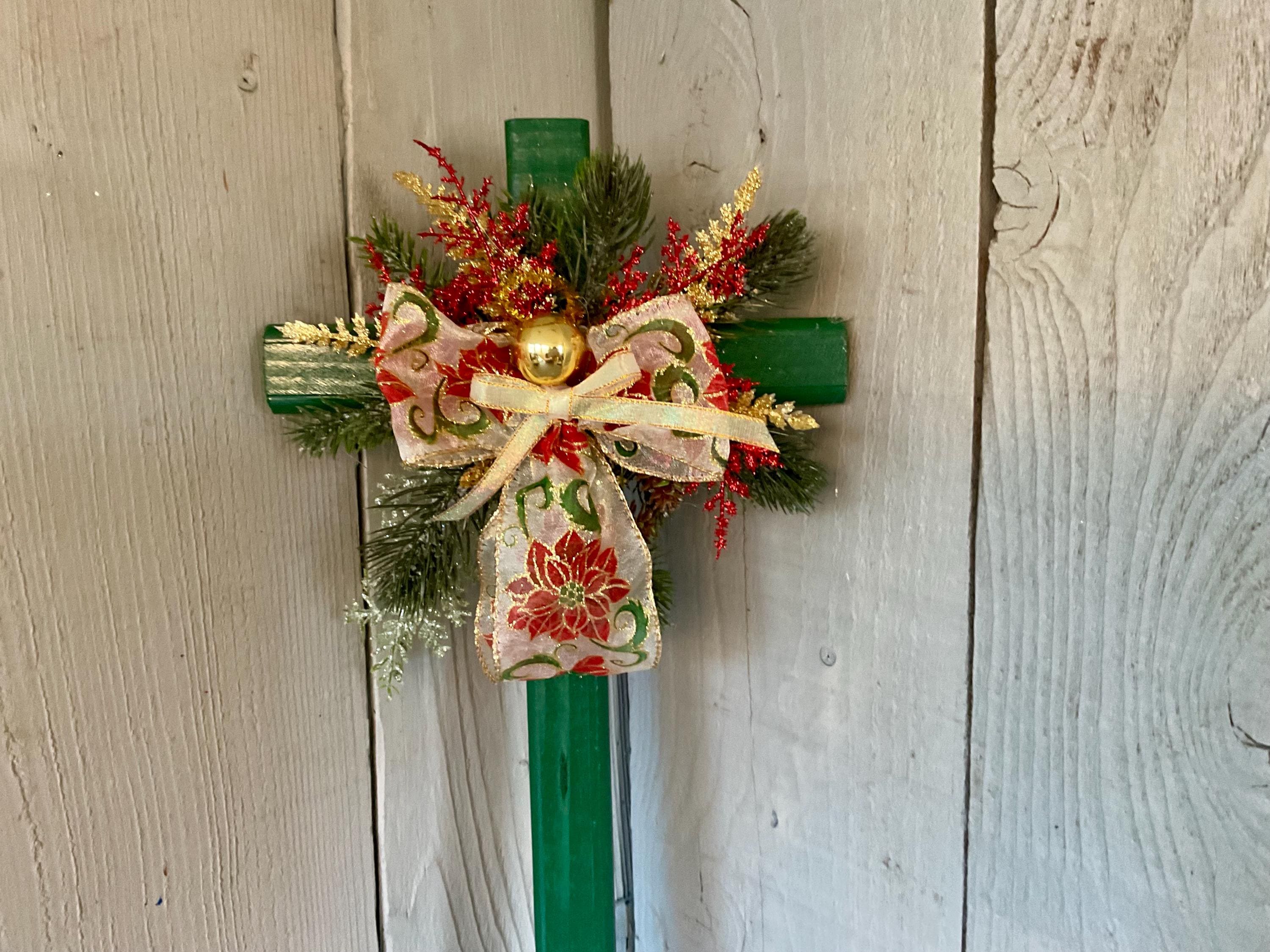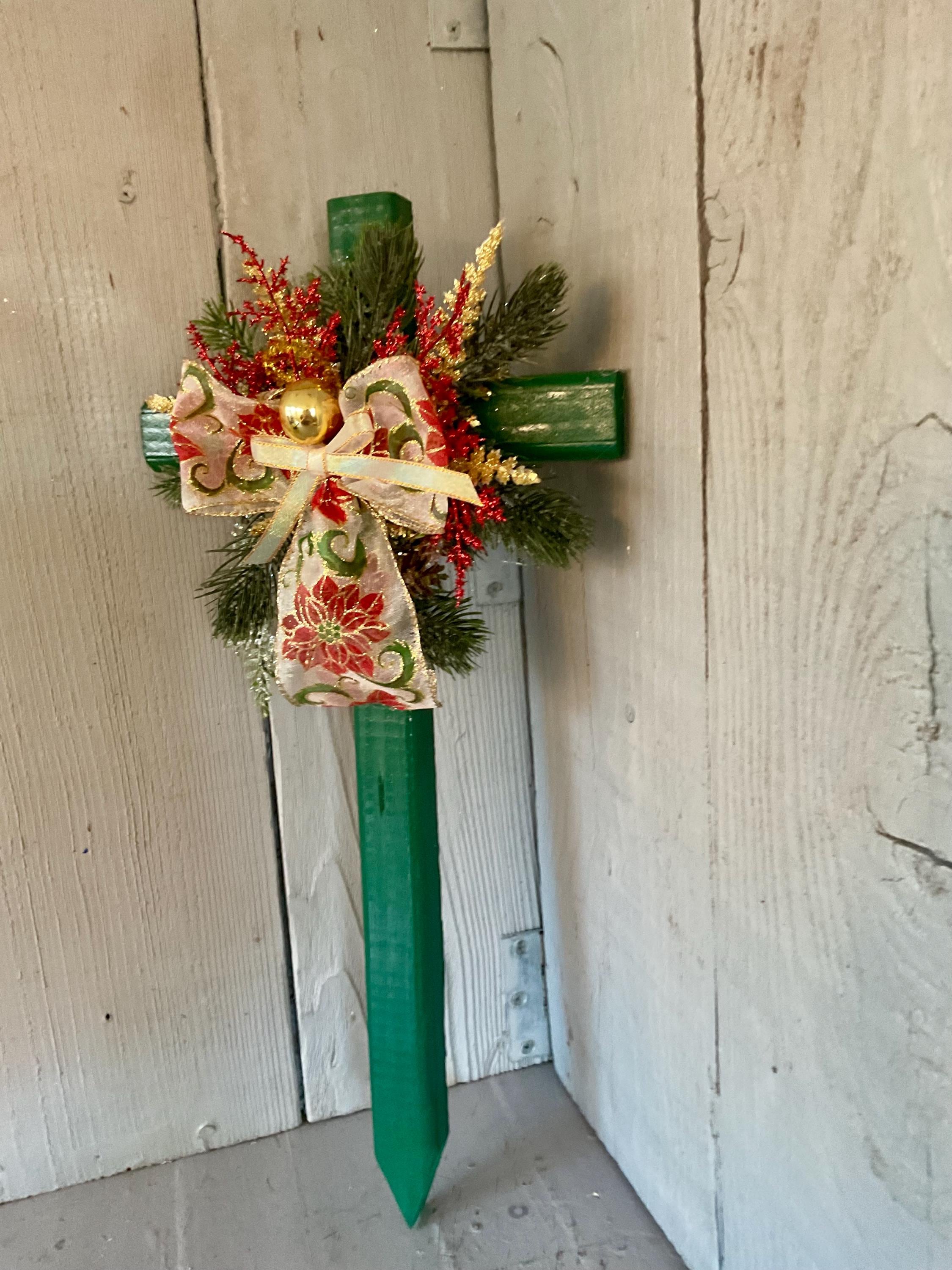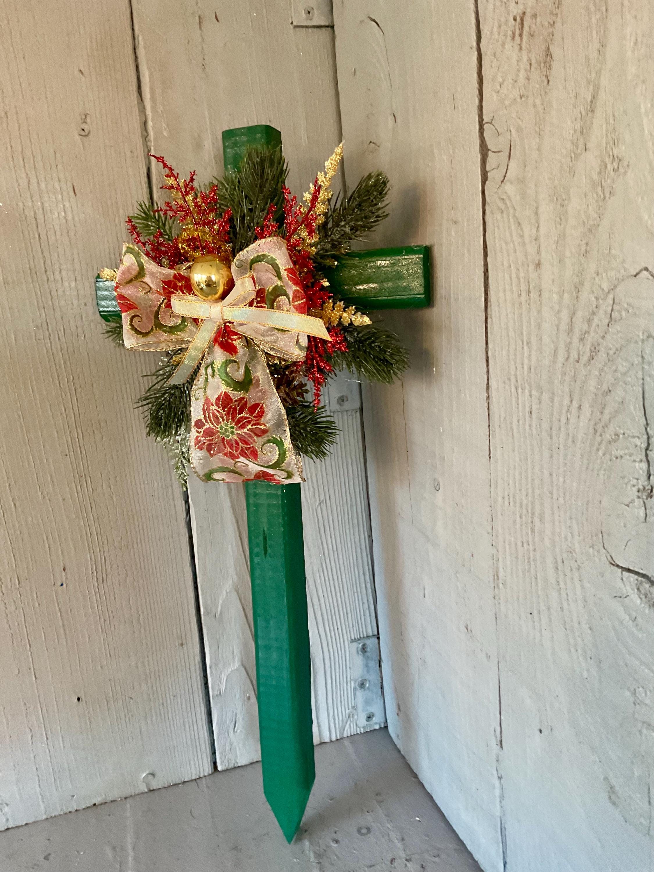 poinsettia print ribbon. The cross has a pointed end for easy ground insertion. Every cross is sprayed with a coat of clear polyurethane to protect the ribbon and silk flowers from outdoor elements.