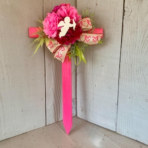 The cross has a pointed end for easy ground insertion. Every cross is sprayed with a coat of clear polyurethane to protect the ribbon and silk flowers from outdoor elements.