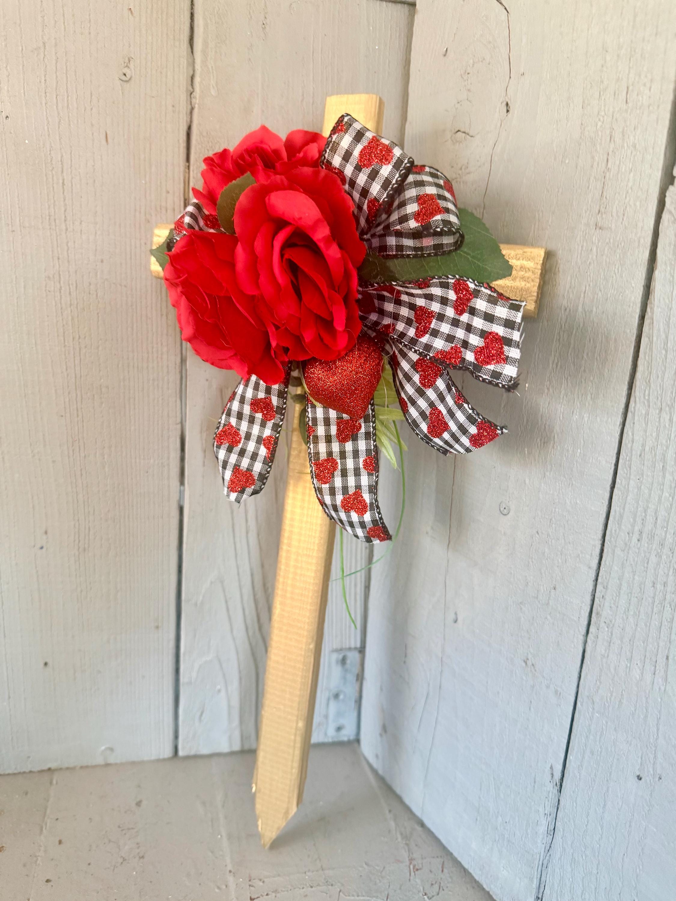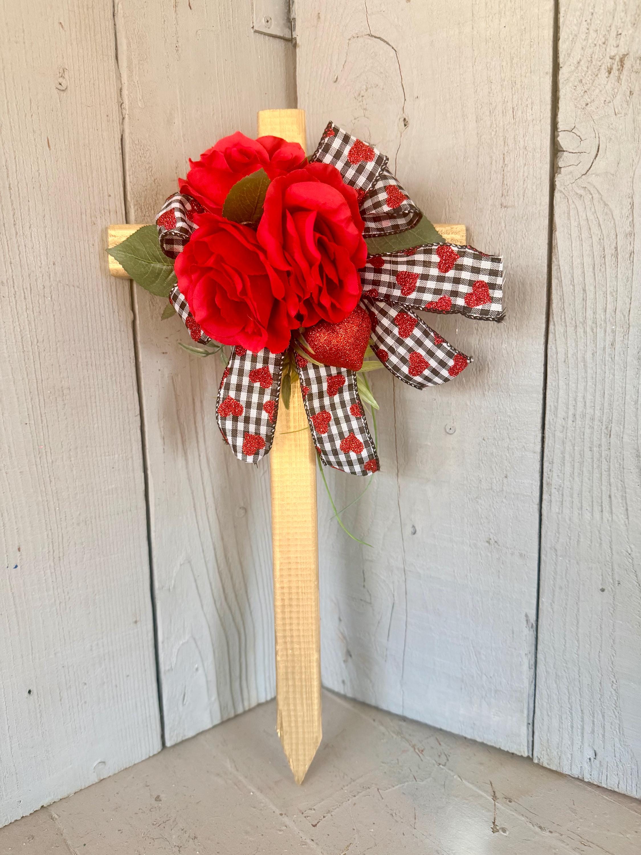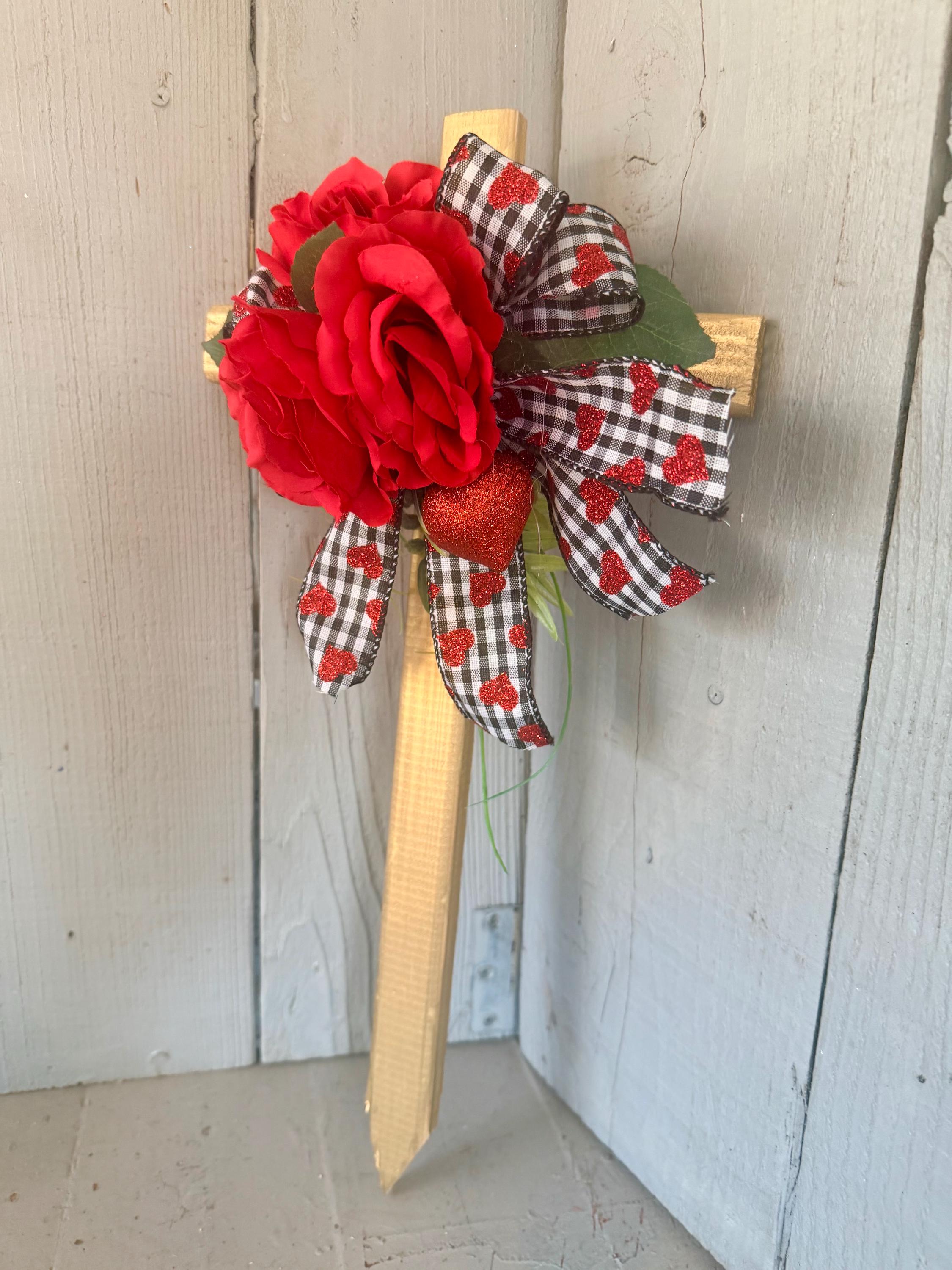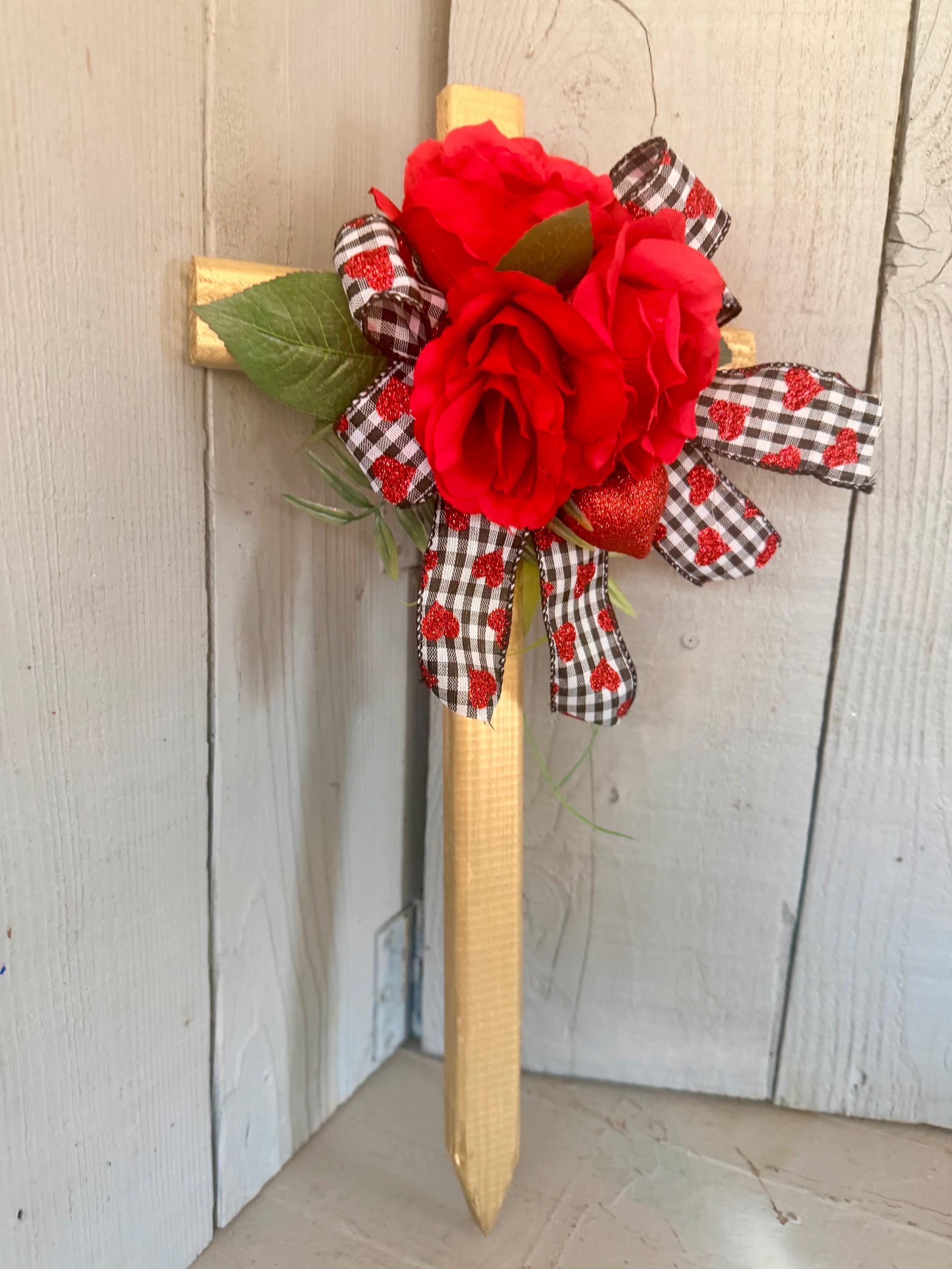 This 18” pine cross has been painted gold with three red roses , rose leaves, red glitter heart and red glitter Valentine ribbon.