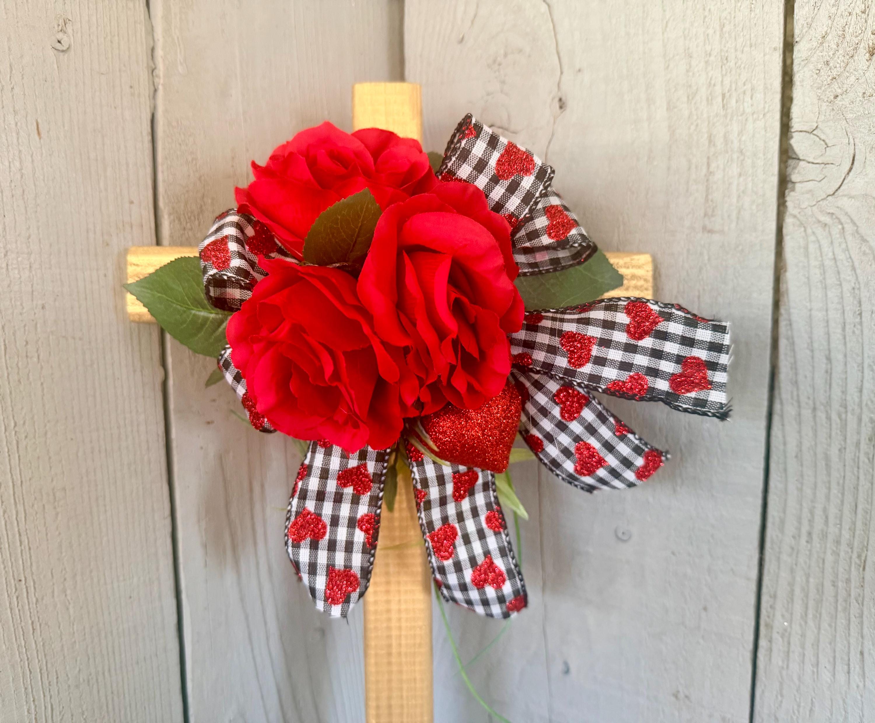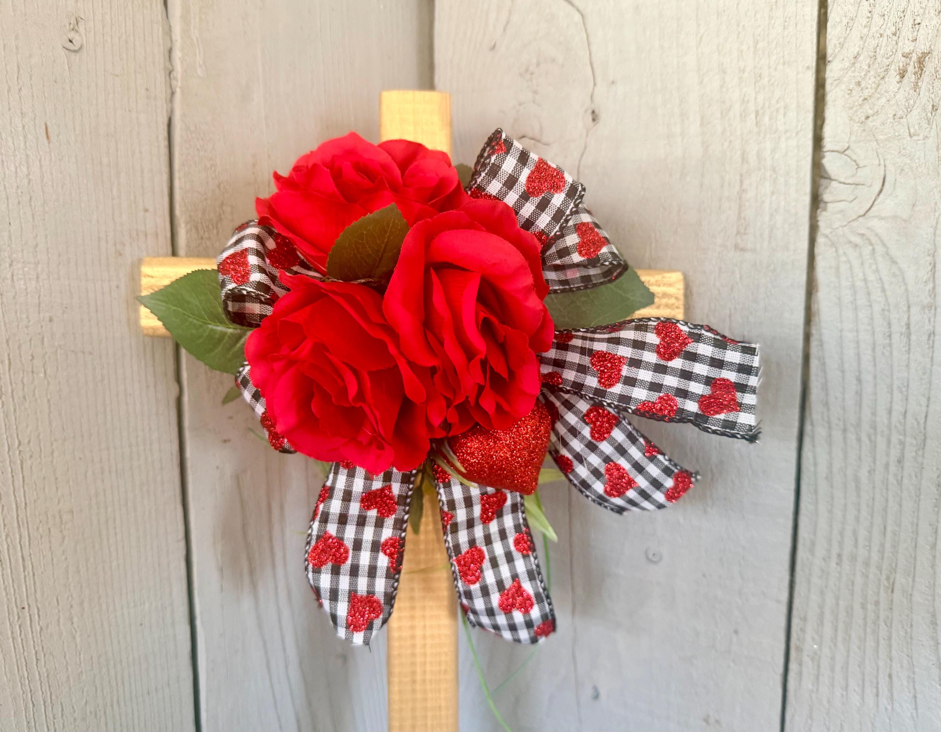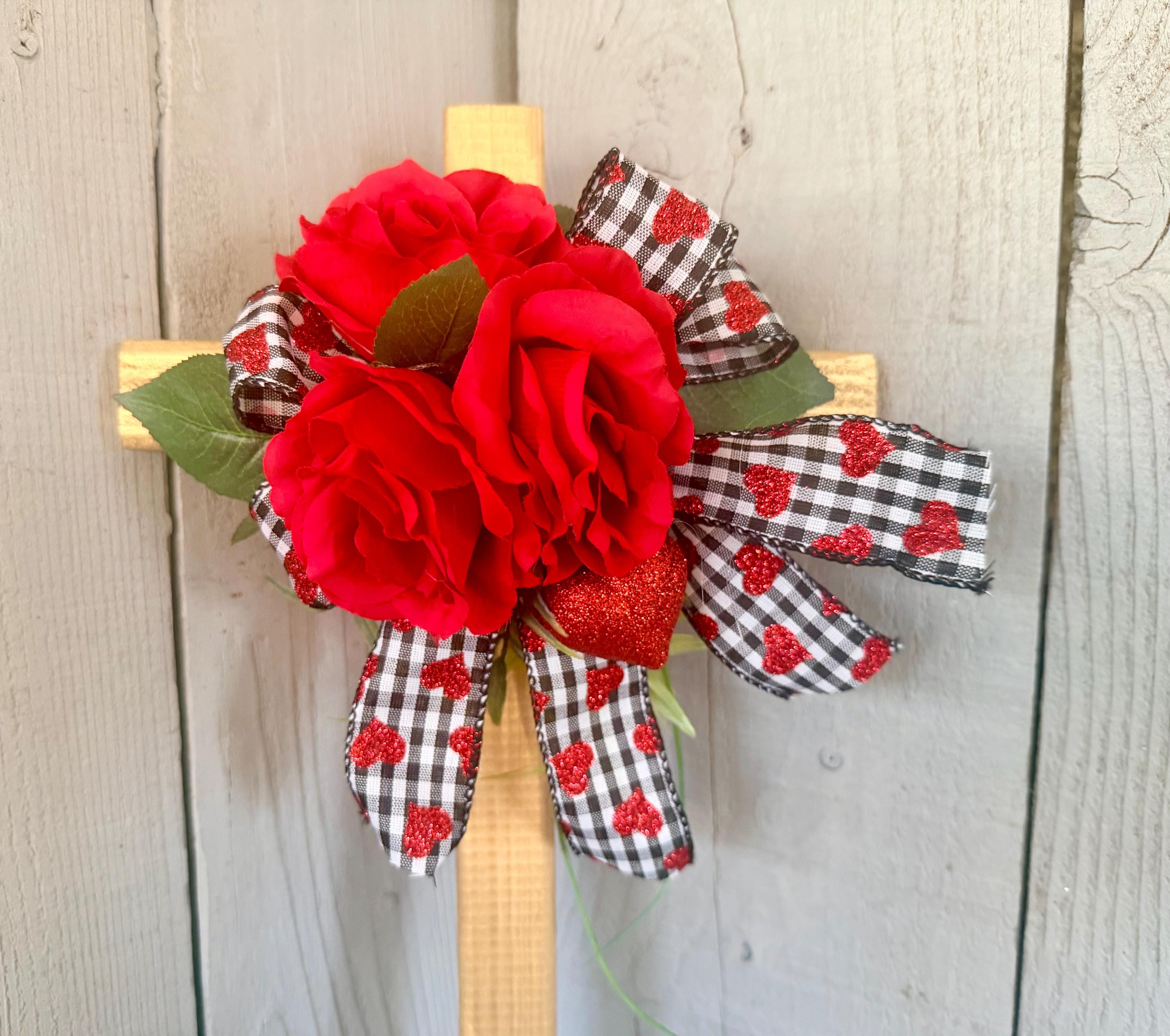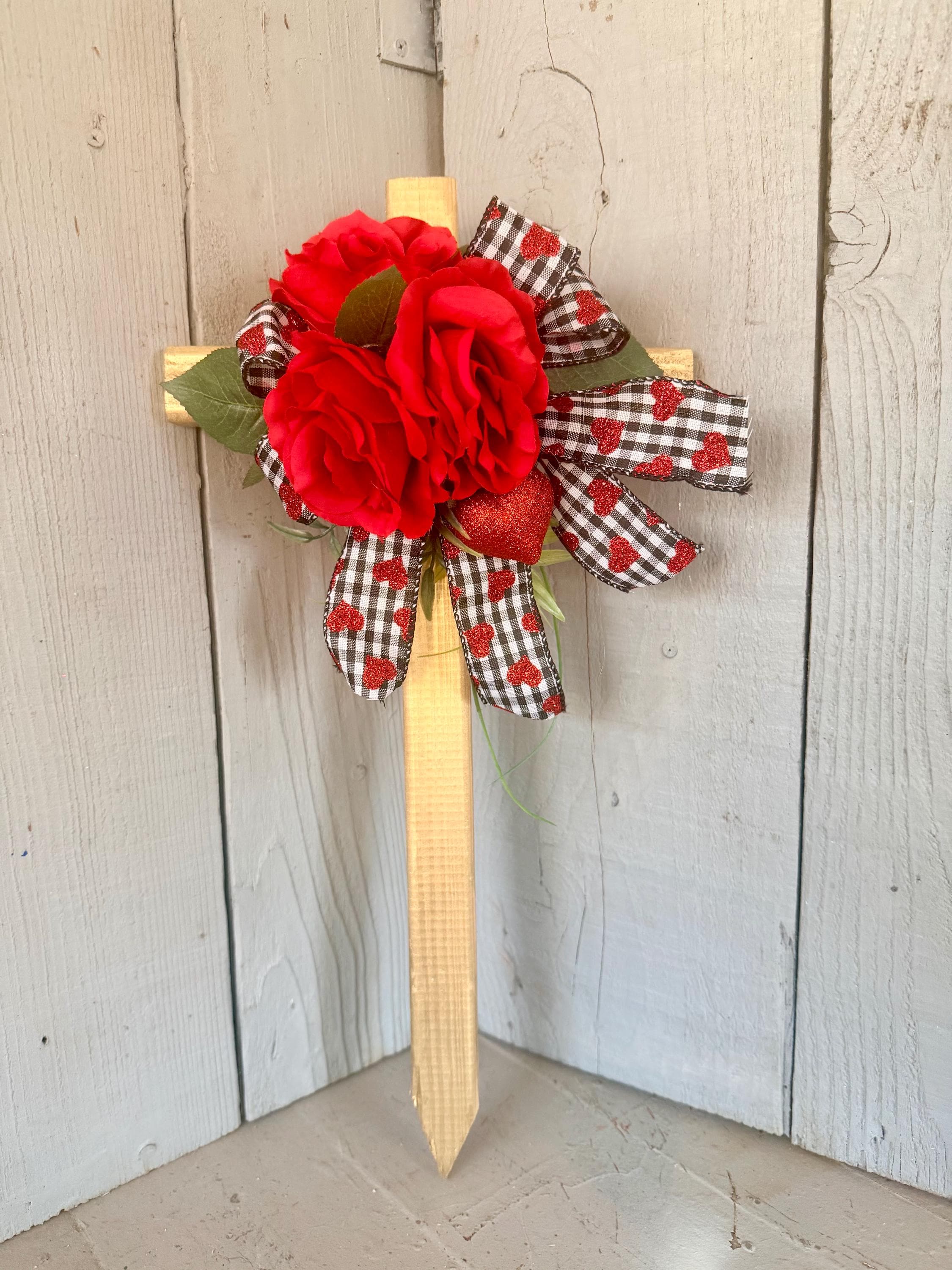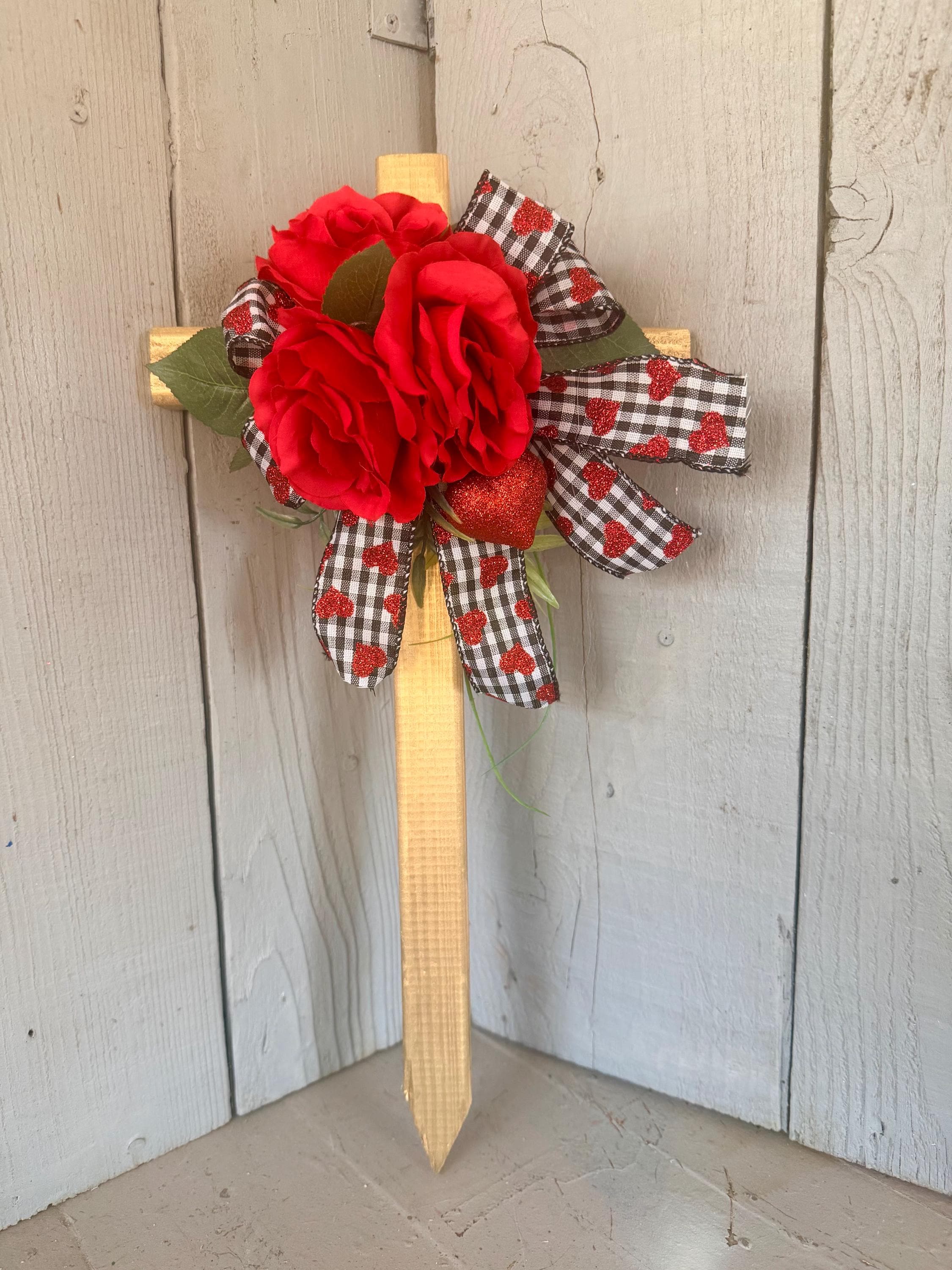 This 18” pine cross has been painted gold with three red roses , rose leaves, red glitter heart and red glitter Valentine ribbon.