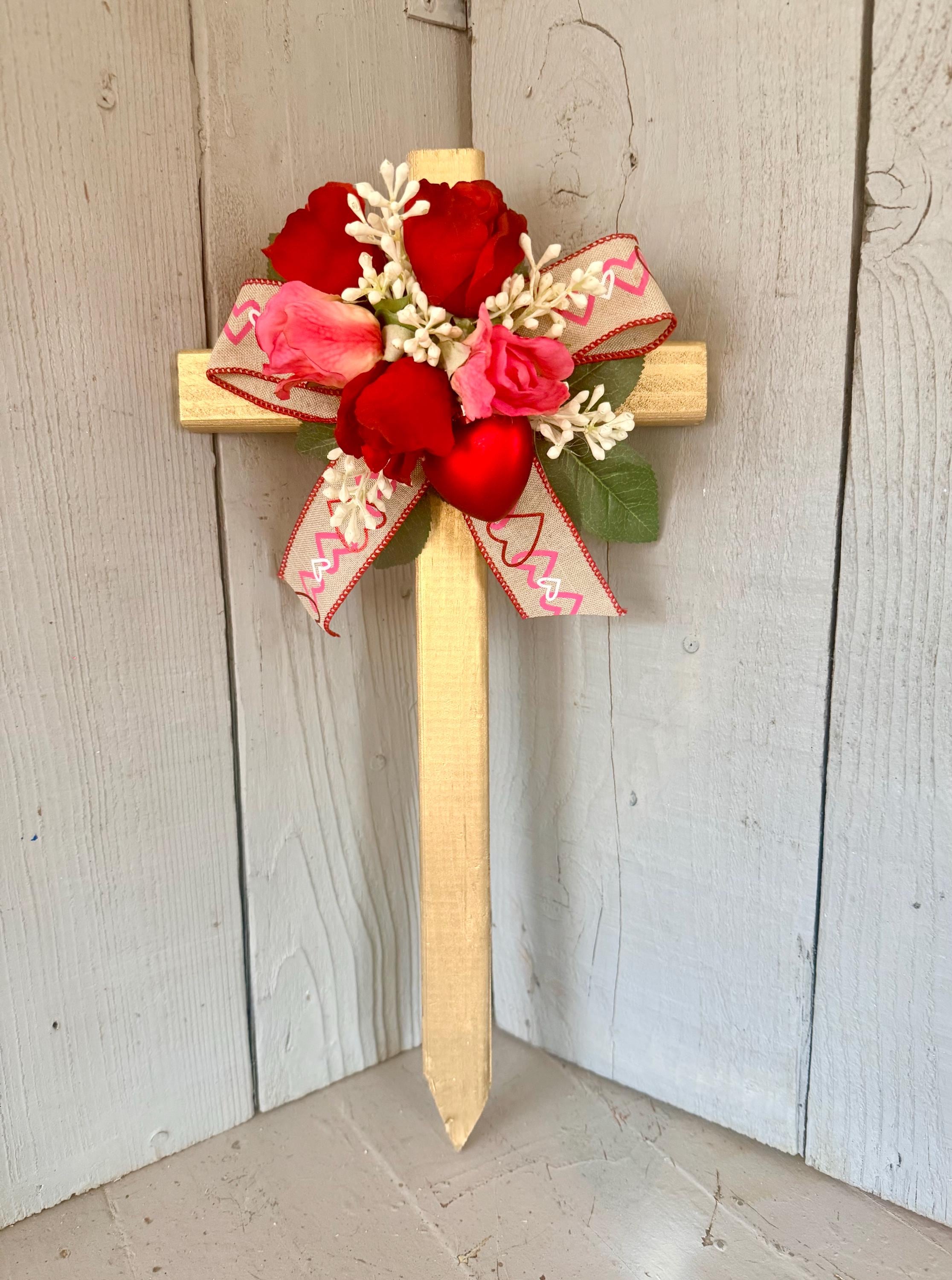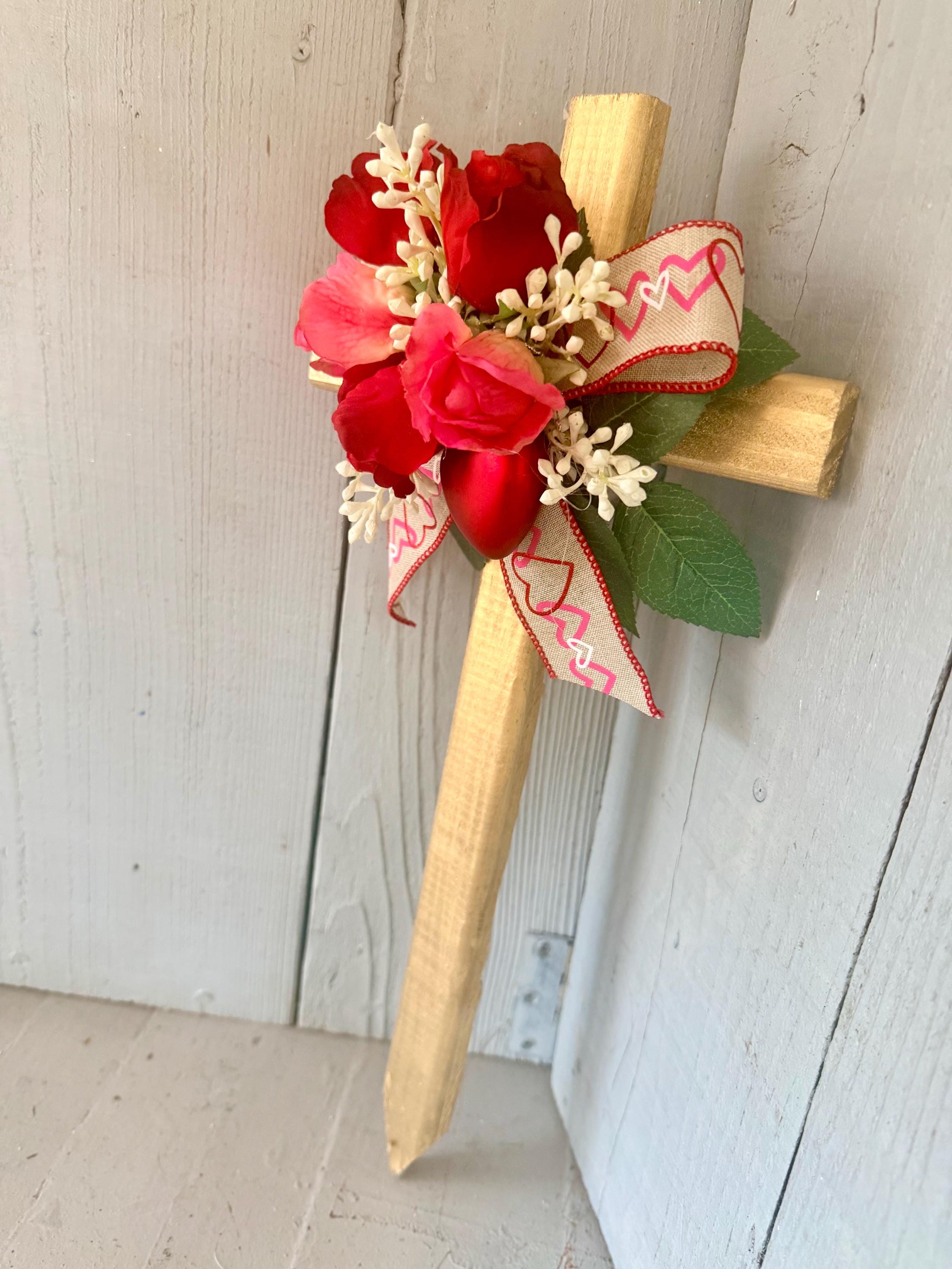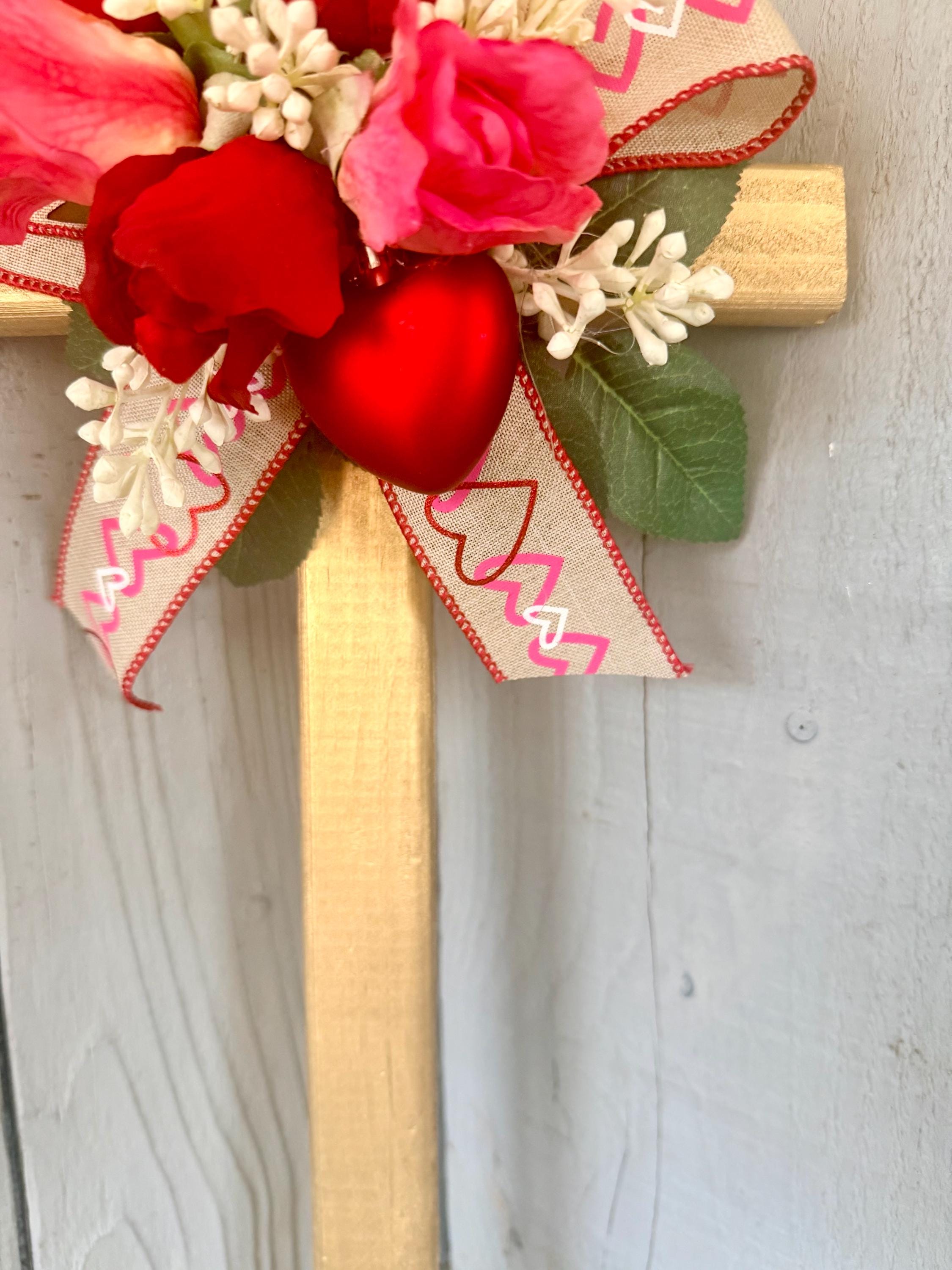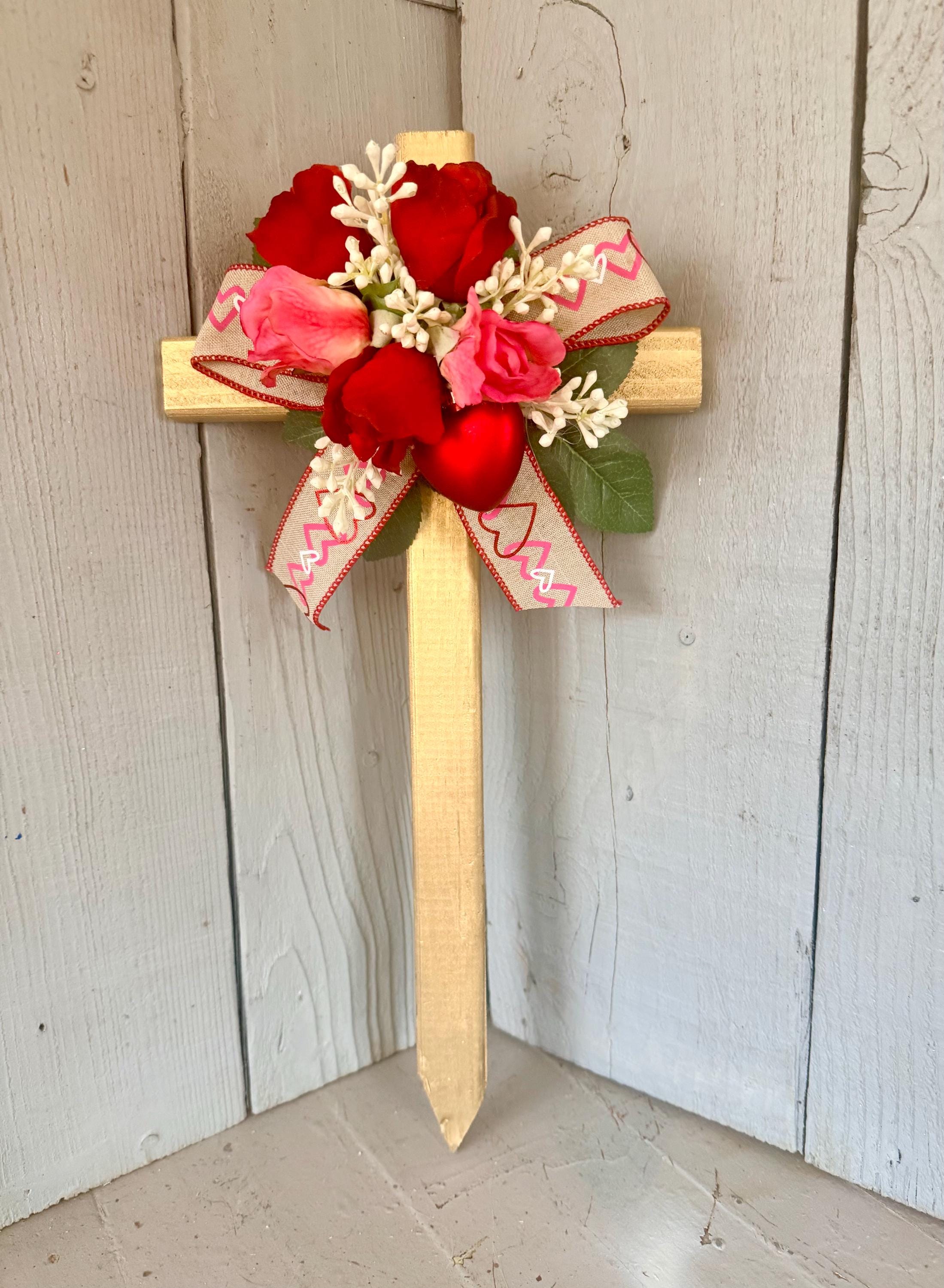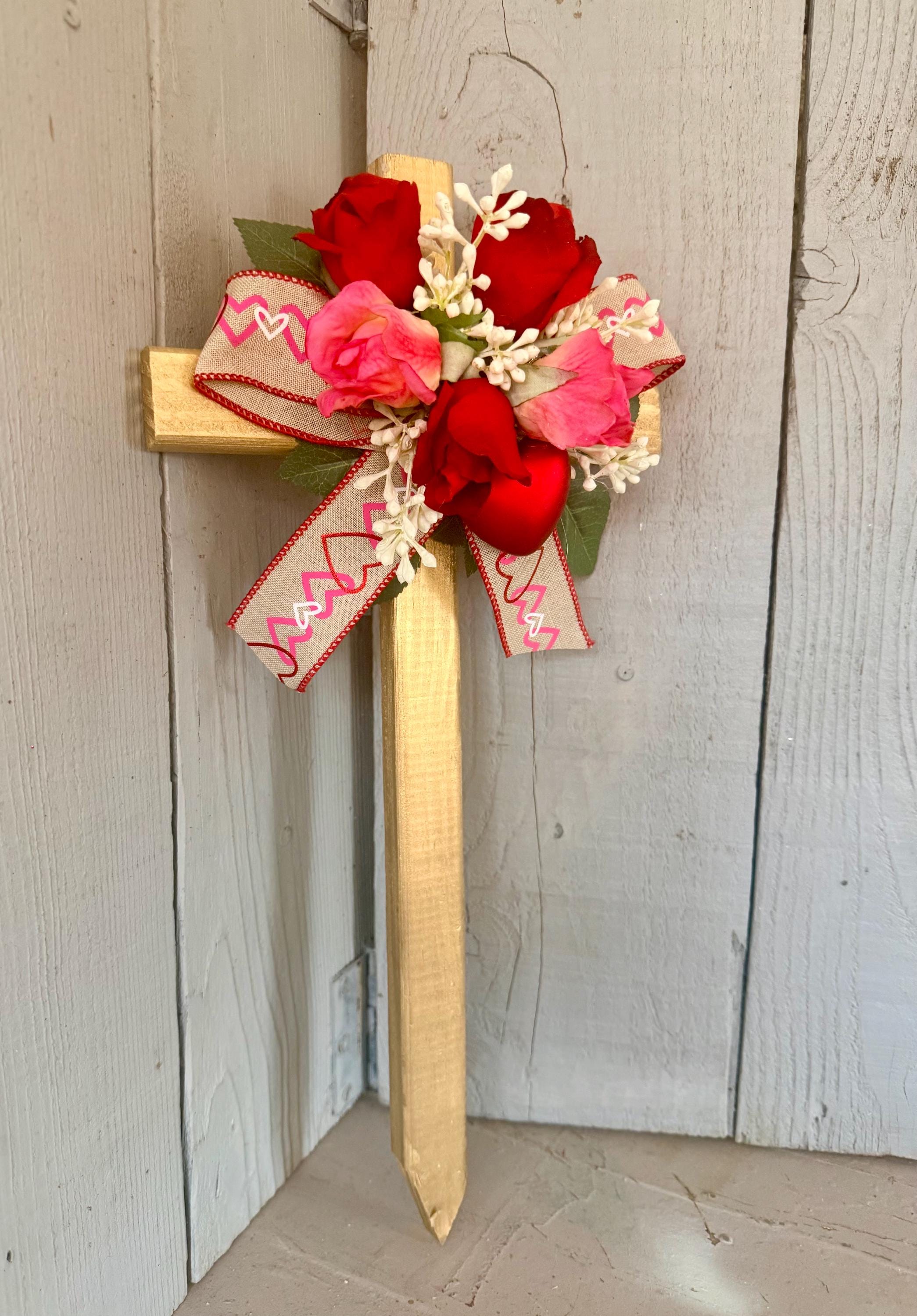 This 18” pine cross has been painted gold with three red rose buds, two pink rose buds , rose leaves, white babys breath picks, red heart pick attached to the front, and Valentine ribbon.