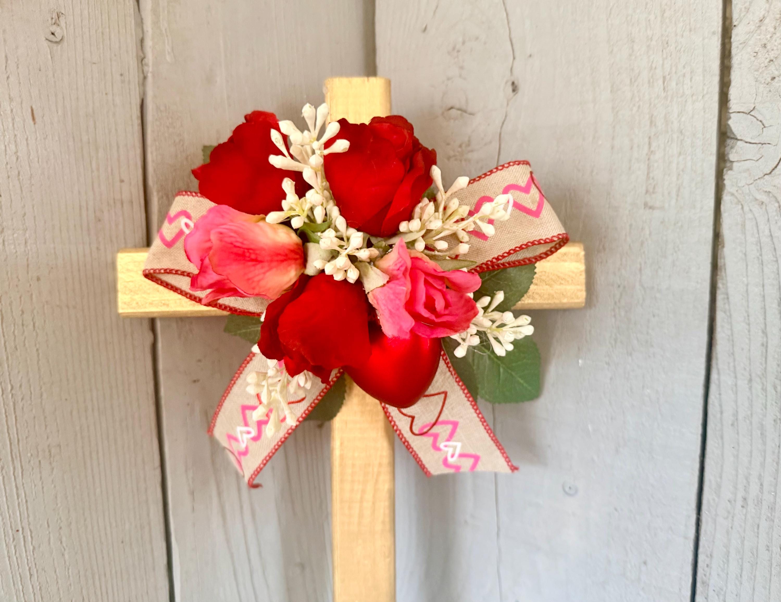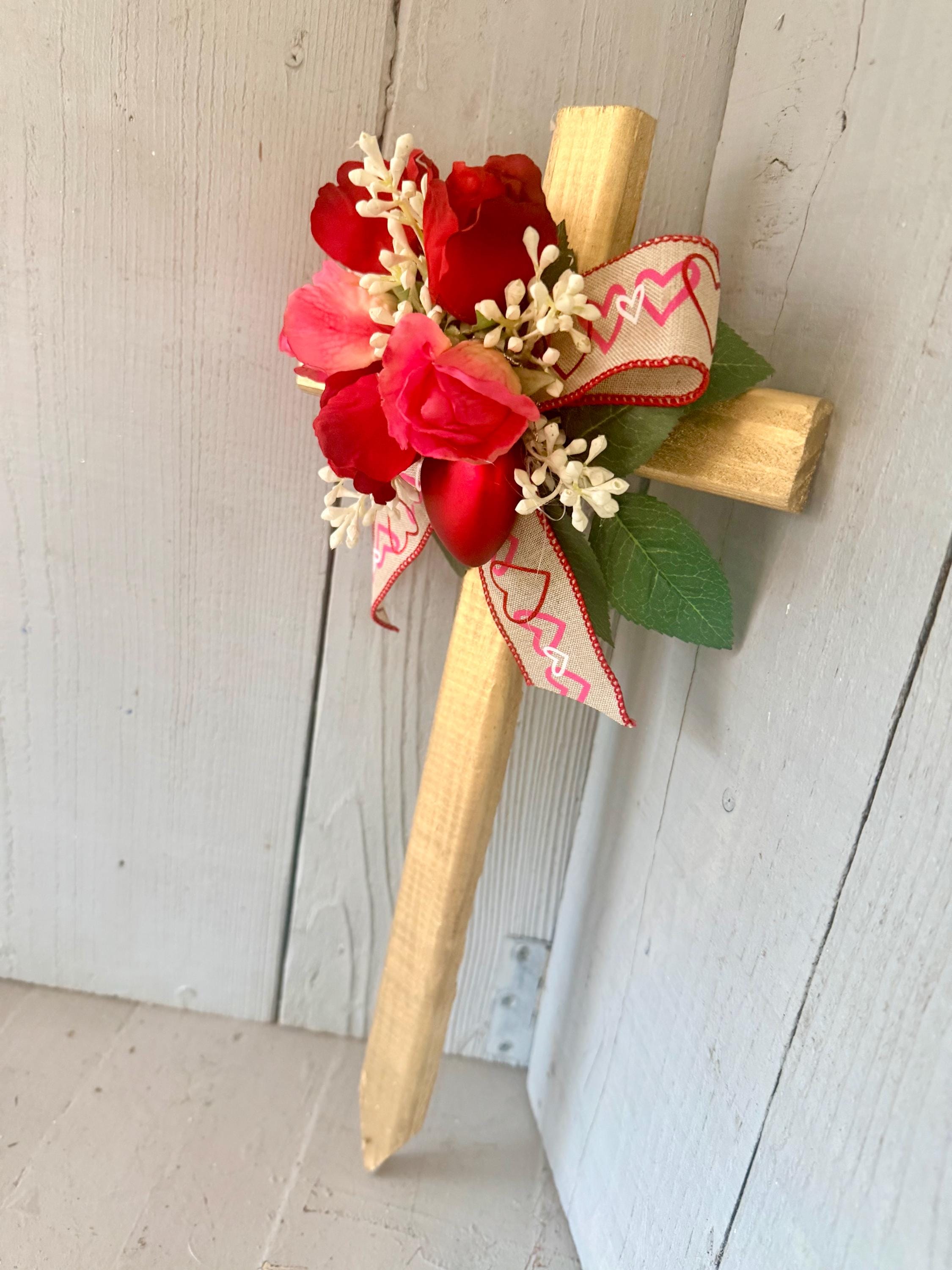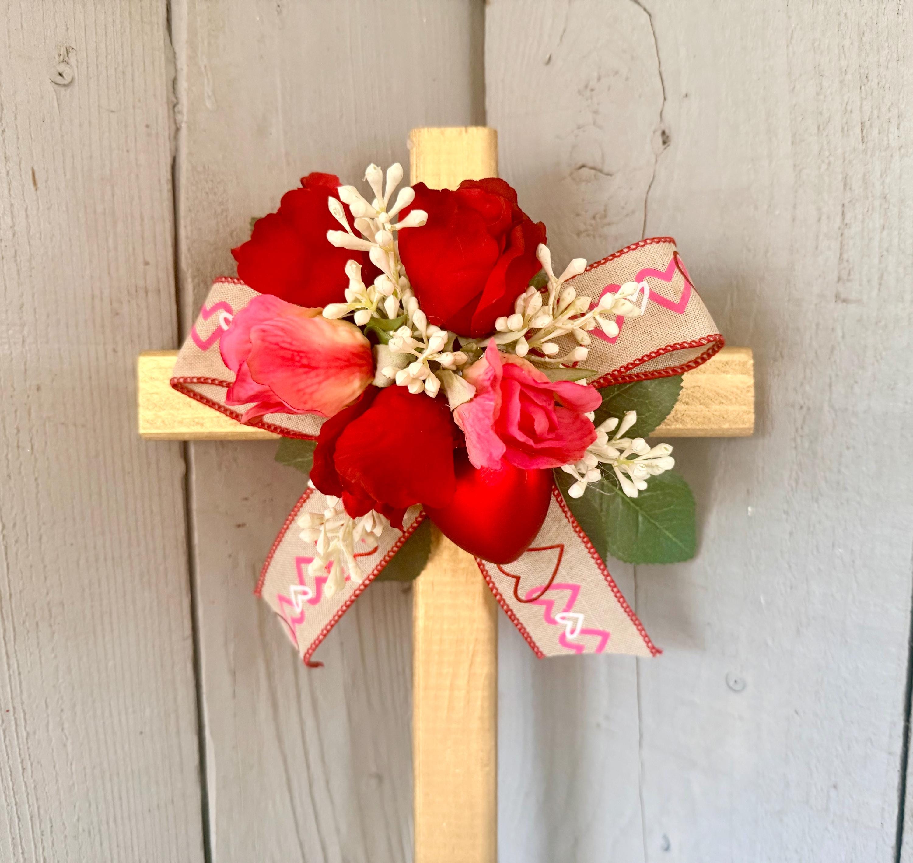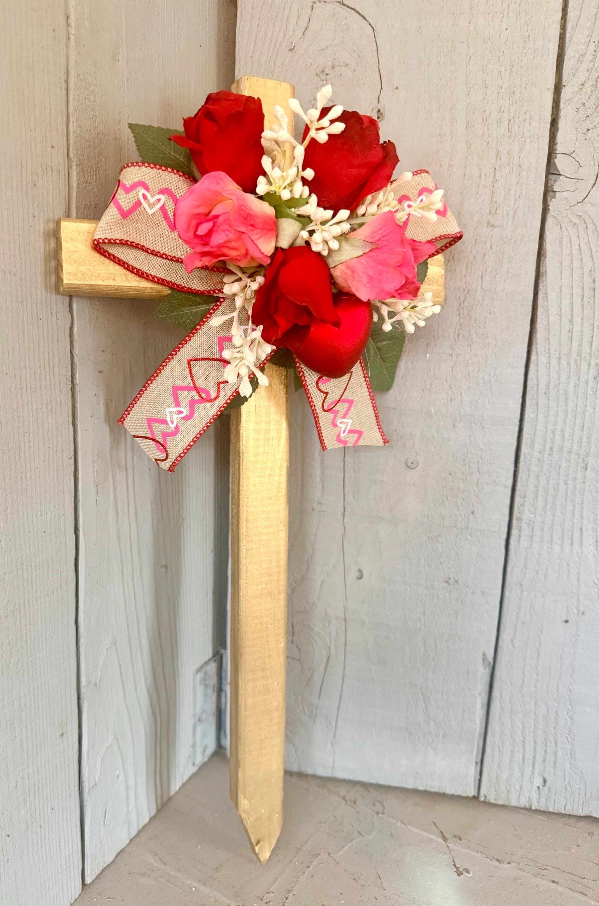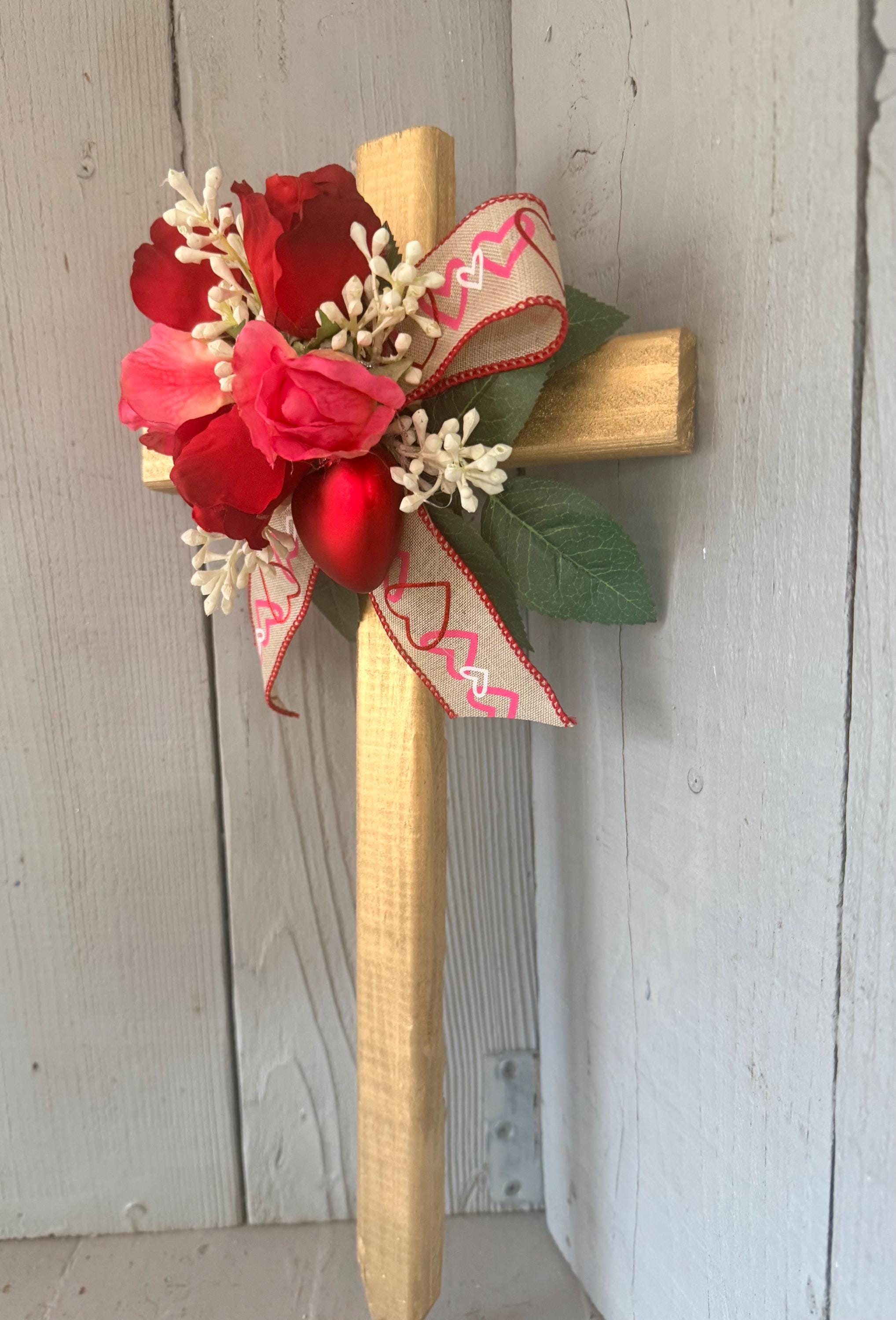 This 18” pine cross has been painted gold with three red rose buds, two pink rose buds , rose leaves, white babys breath picks, red heart pick attached to the front, and Valentine ribbon.
