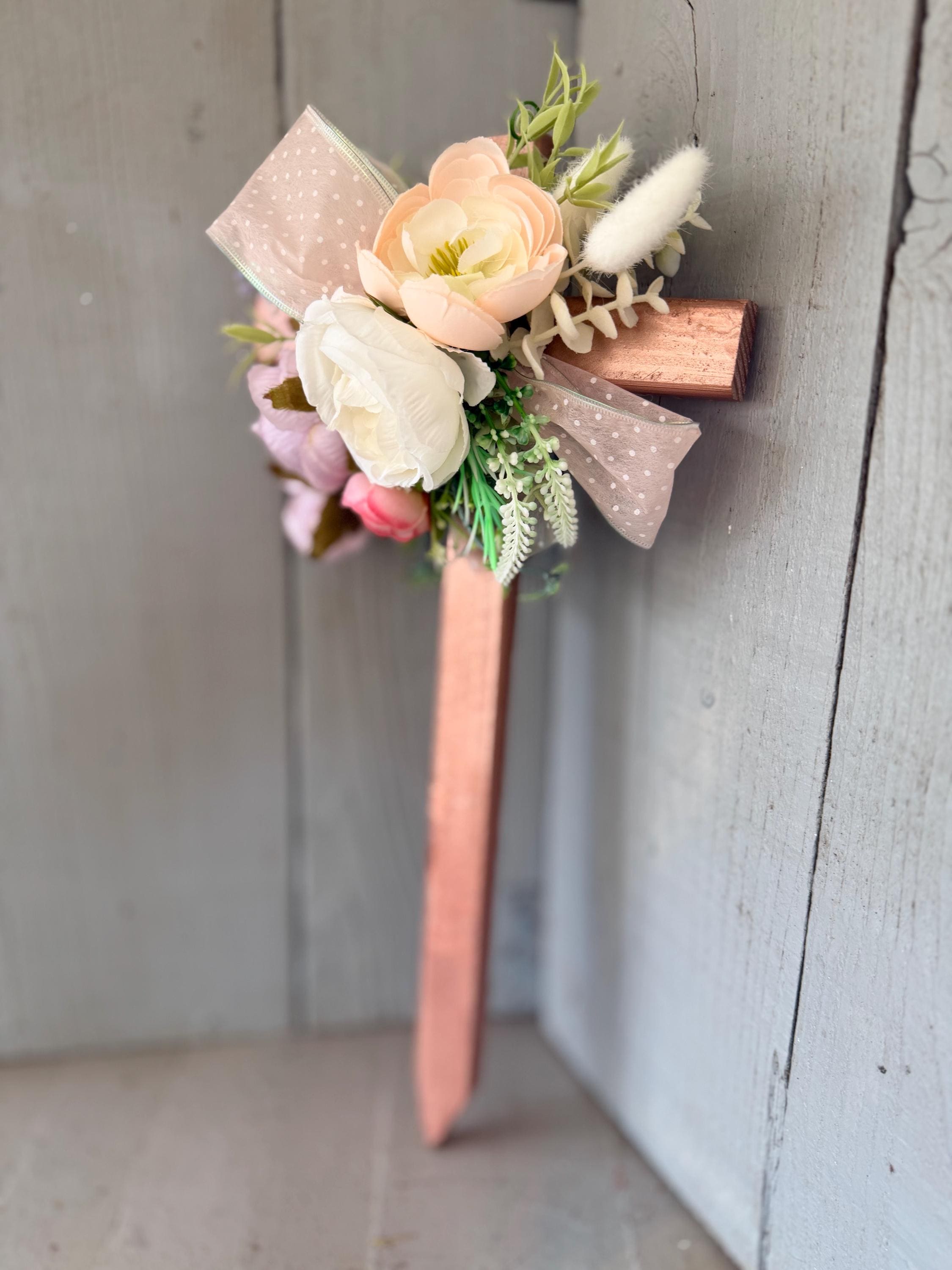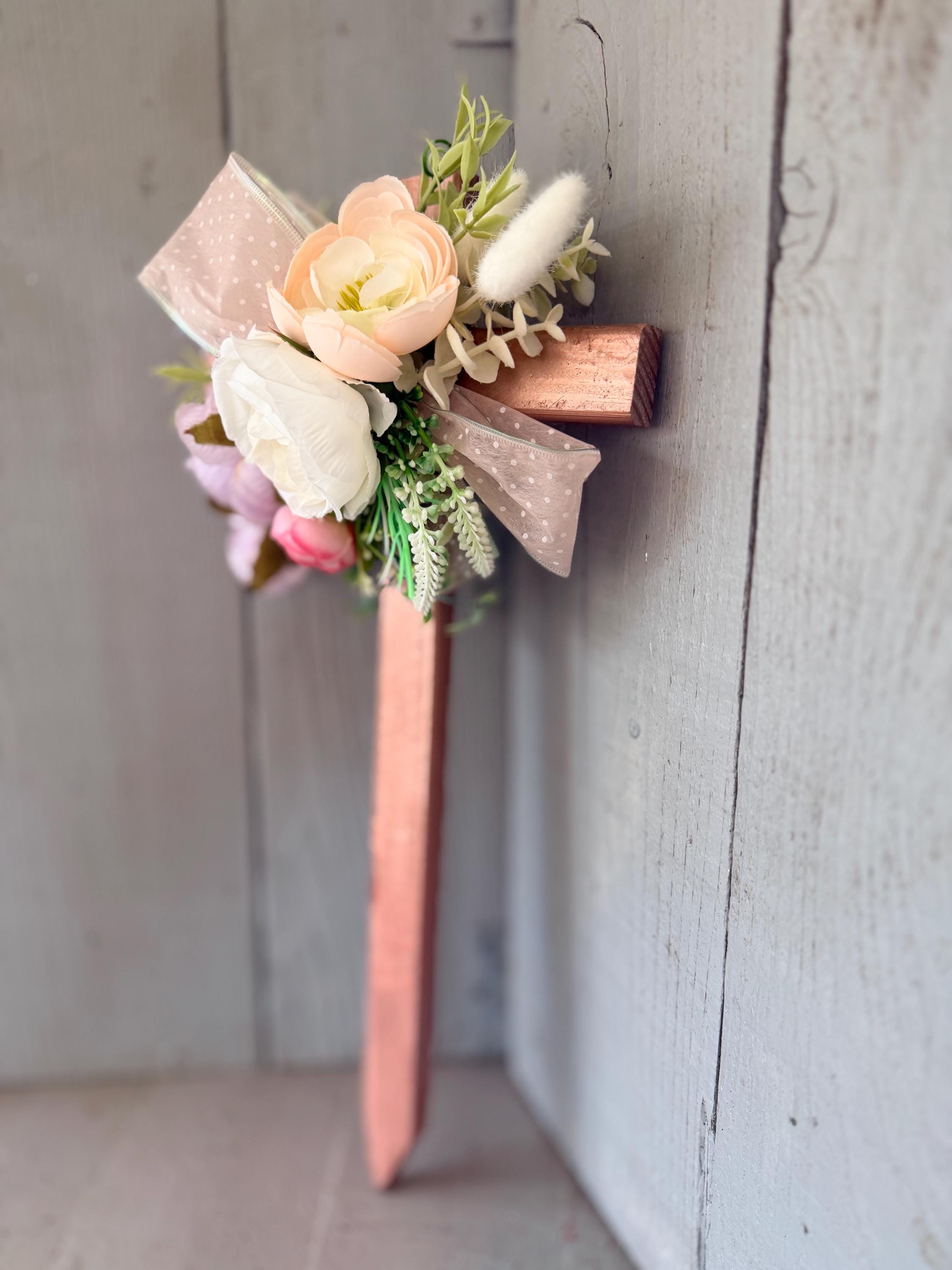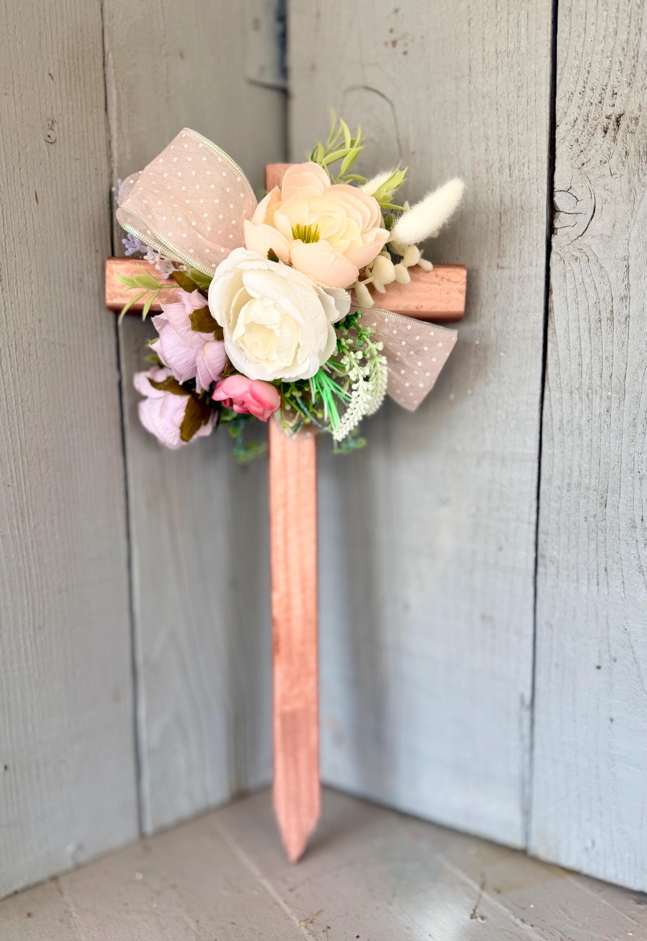 The cross has a pointed end for easy ground insertion. Every cross is sprayed with a coat of clear polyurethane to protect the ribbon and silk flowers from outdoor elements.