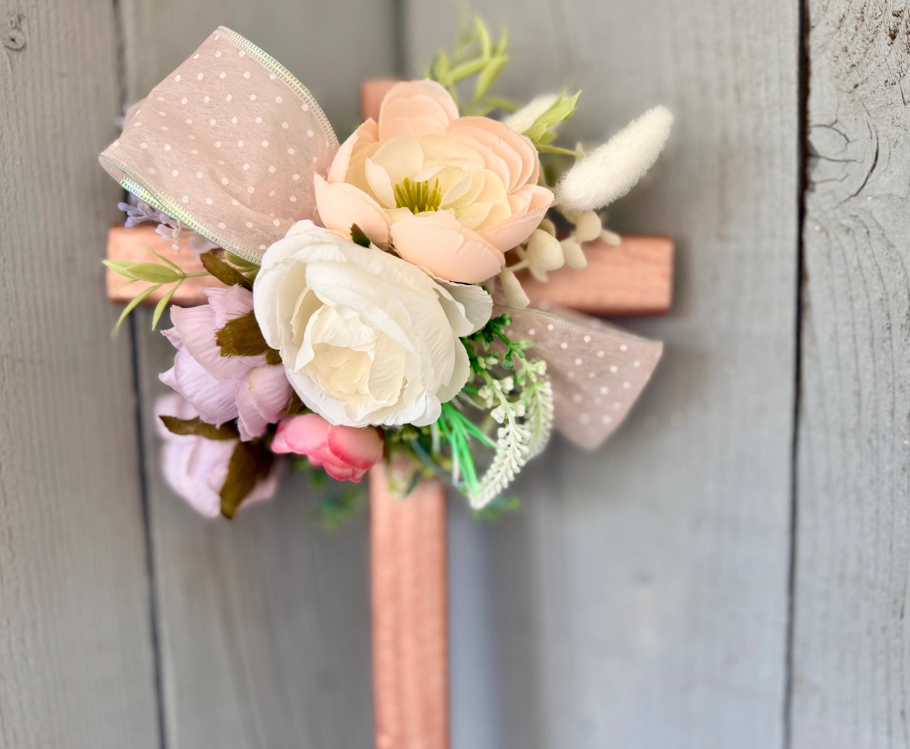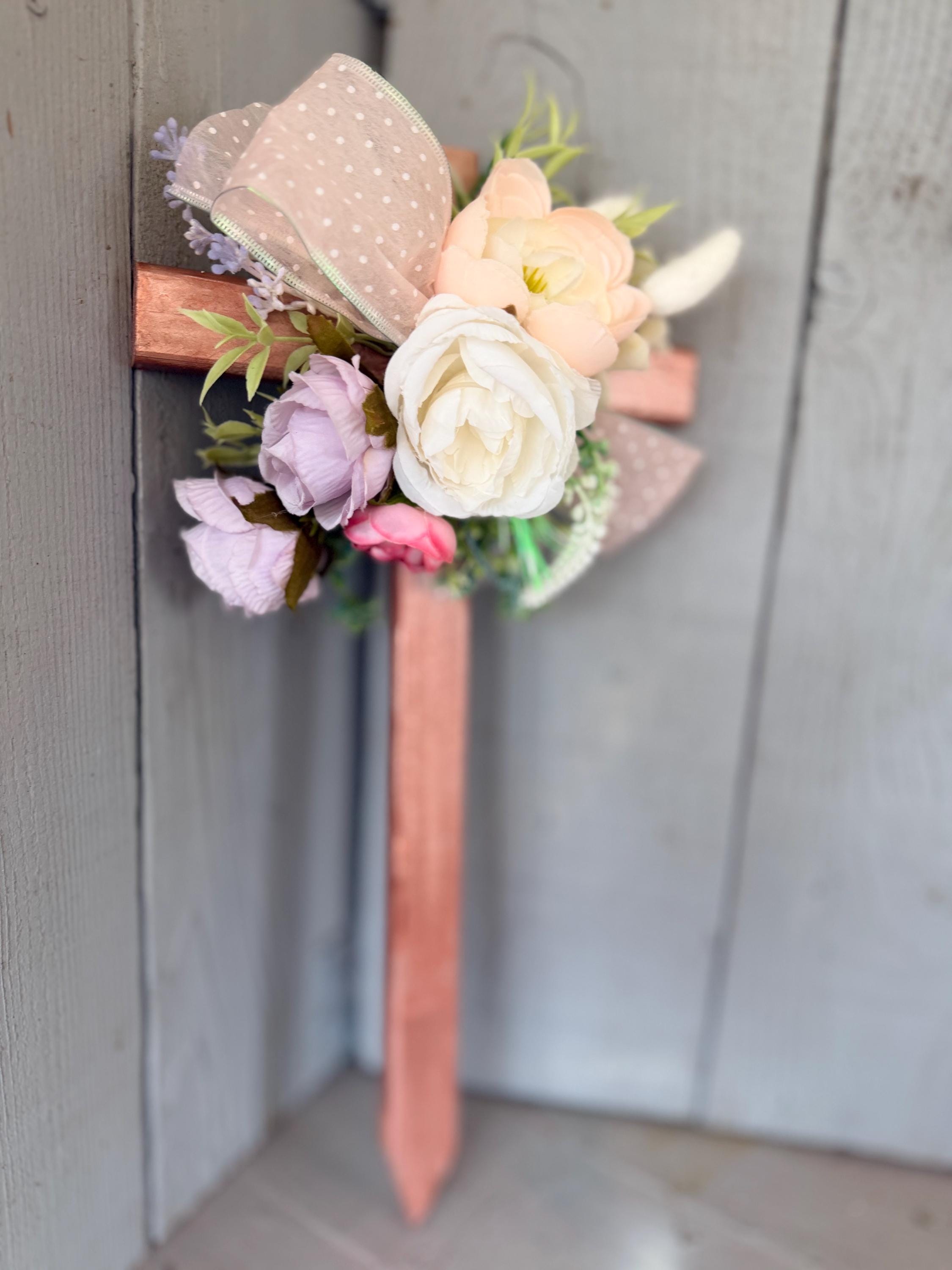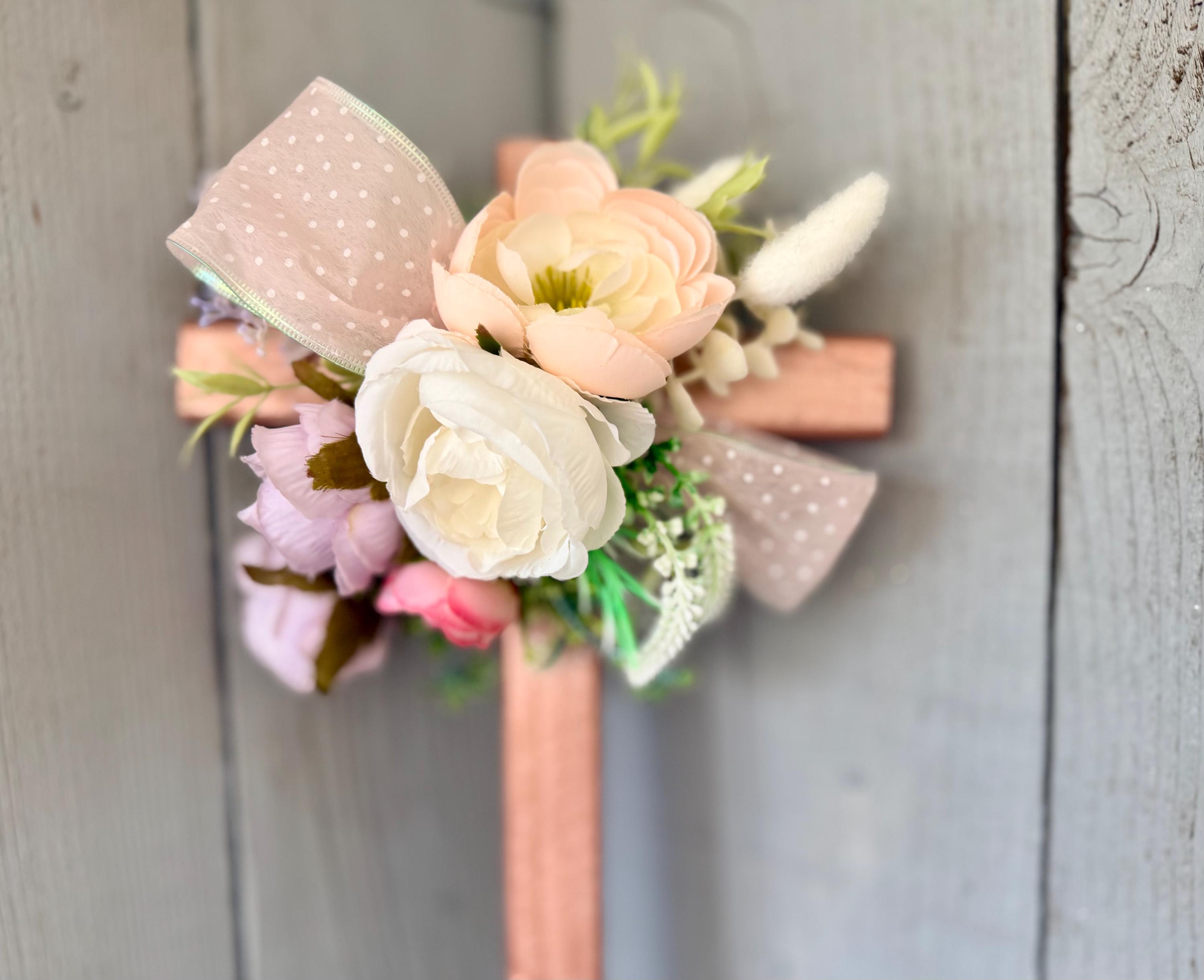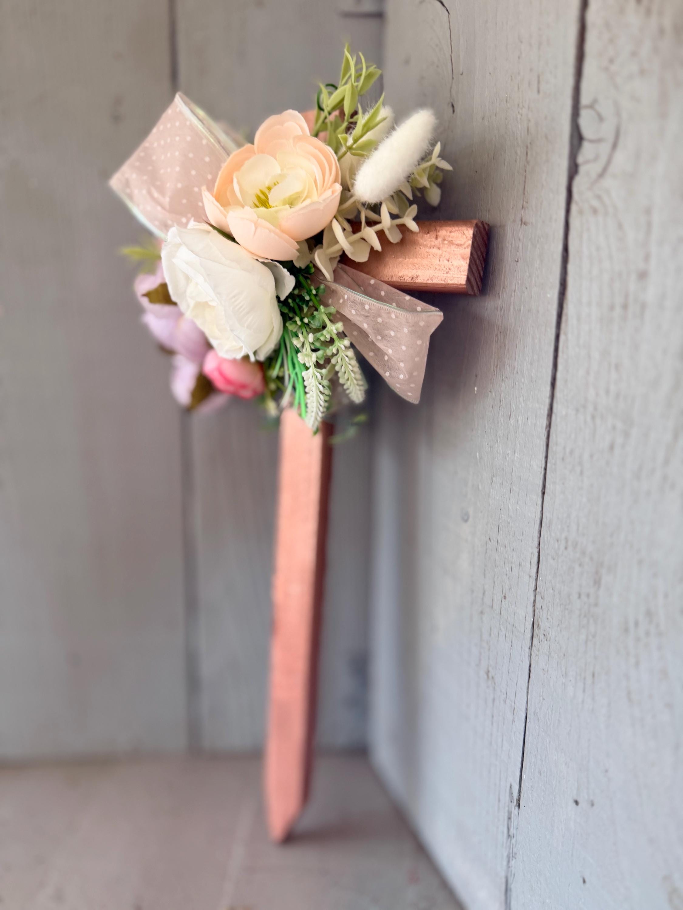 The cross has a pointed end for easy ground insertion. Every cross is sprayed with a coat of clear polyurethane to protect the ribbon and silk flowers from outdoor elements.