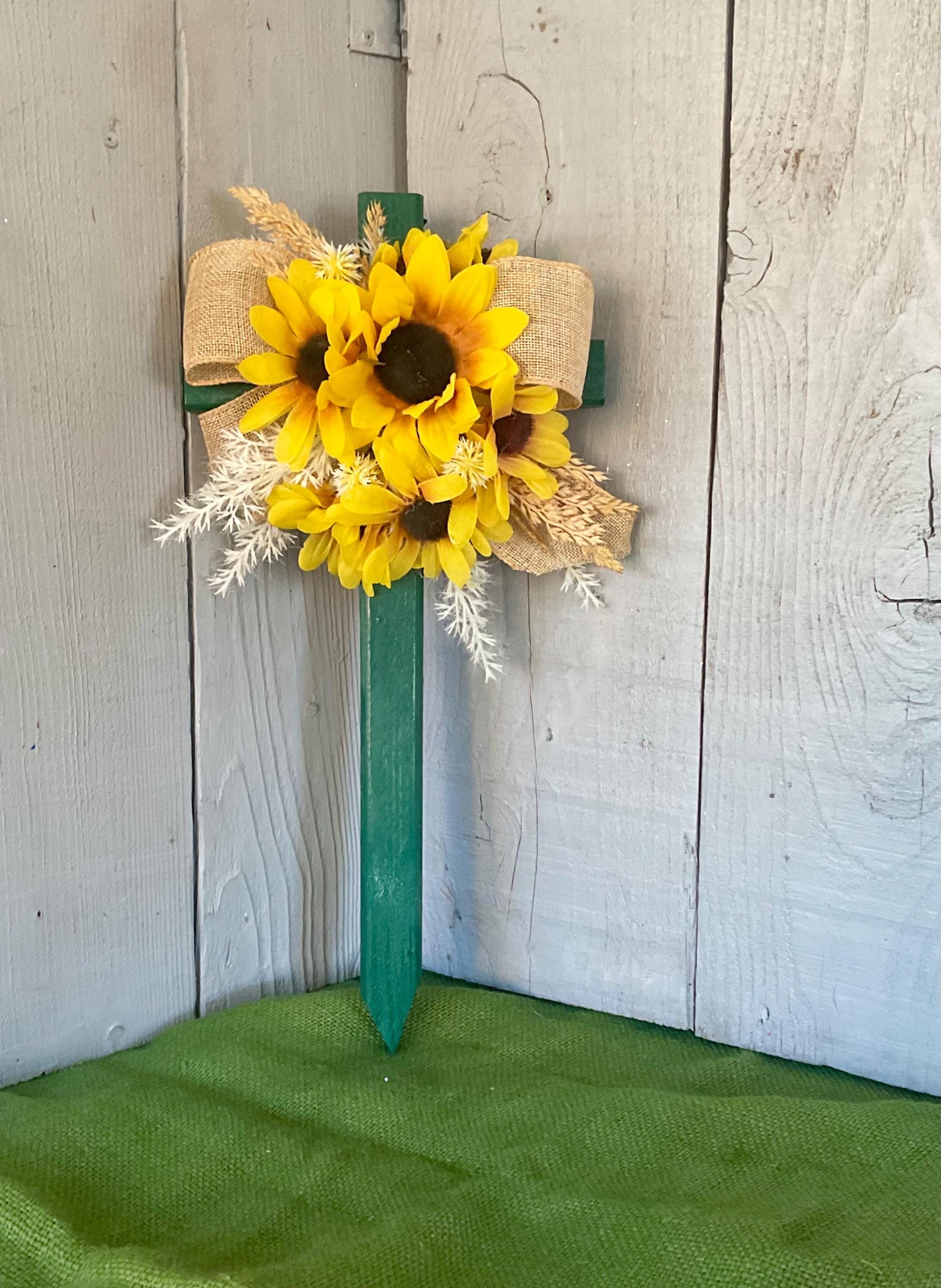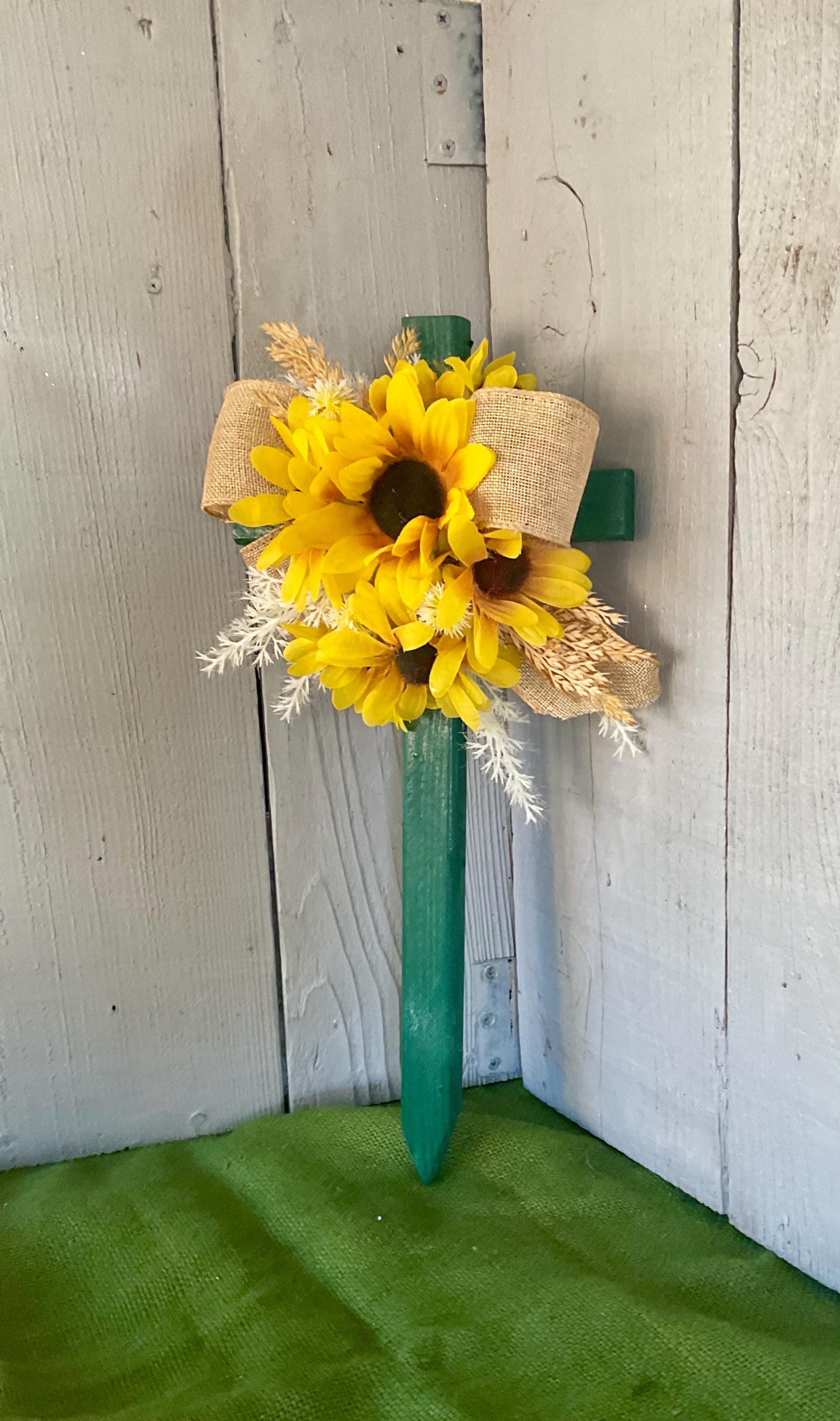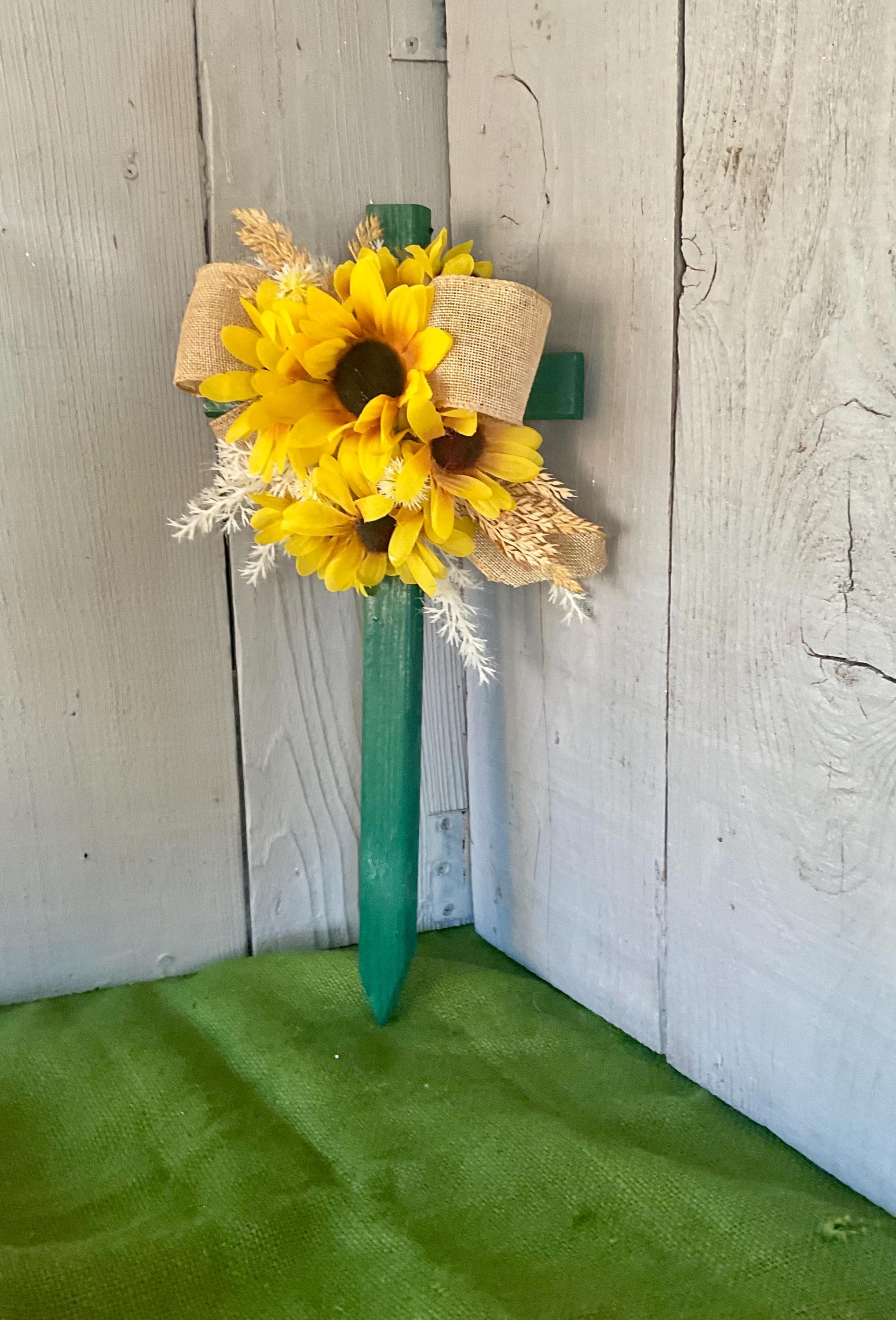 Enhance the beauty of your loved one's resting place with this 18” pine cemetery cross. Expertly hand-painted green and adorned with a cascade of sunflowers in various sizes, branches of natural grasses in beige and brown and natural brown burlap ribbon. A heartfelt tribute that radiates peace and love. The cross has a pointed end for easy ground insertion. Every cross is sprayed with a coat of clear polyurethane to protect the ribbon and silk flowers from outdoor elements.