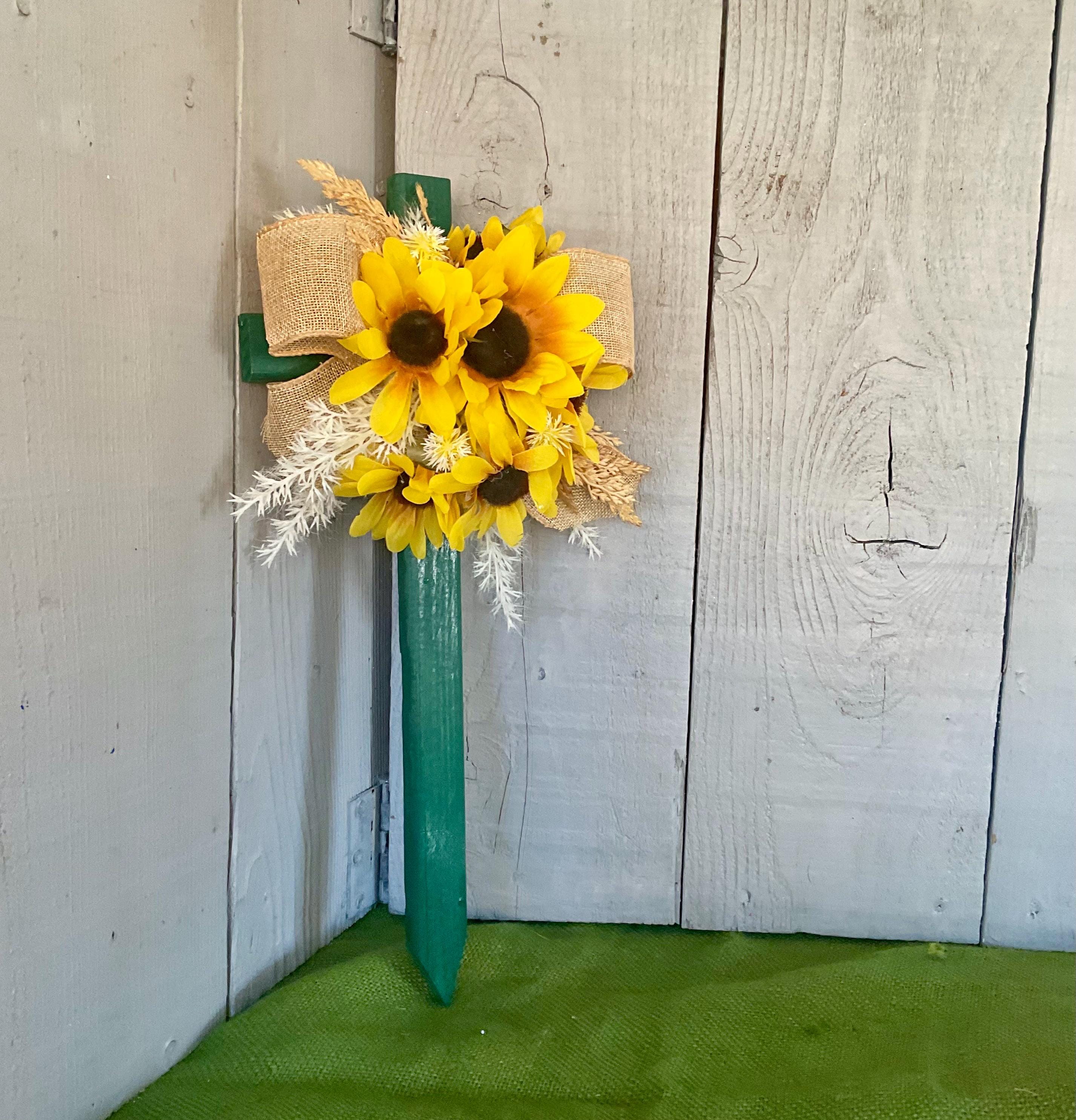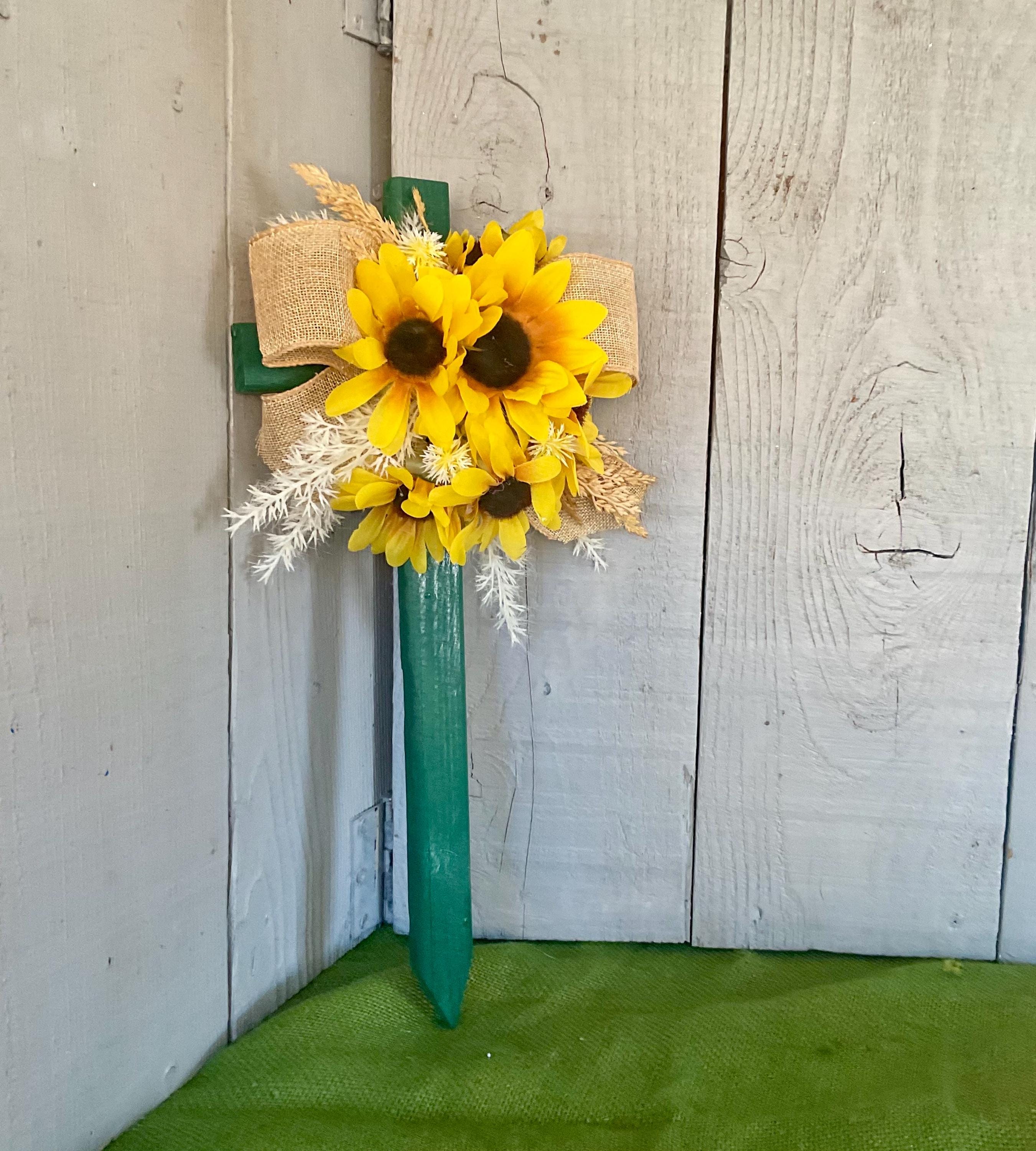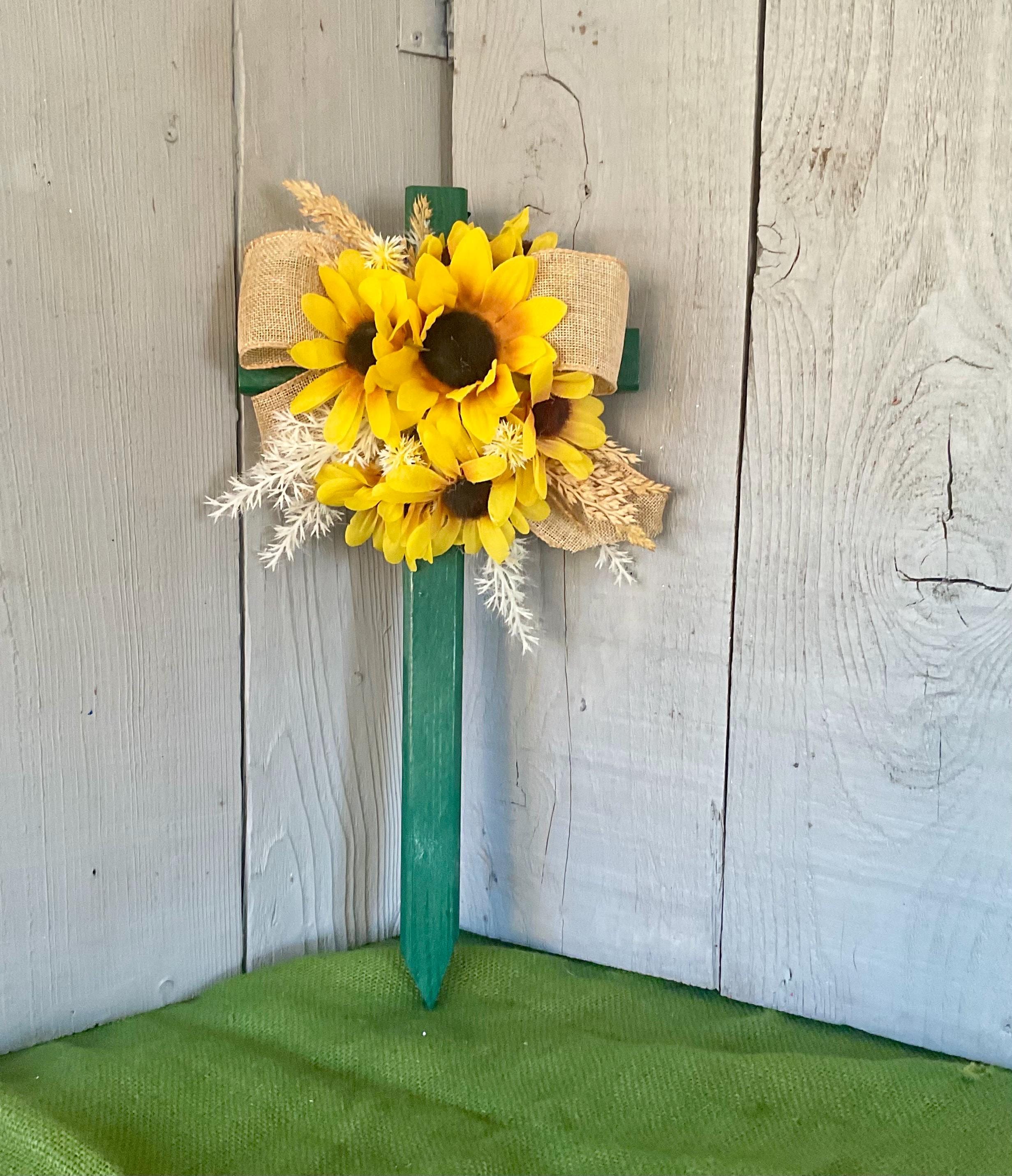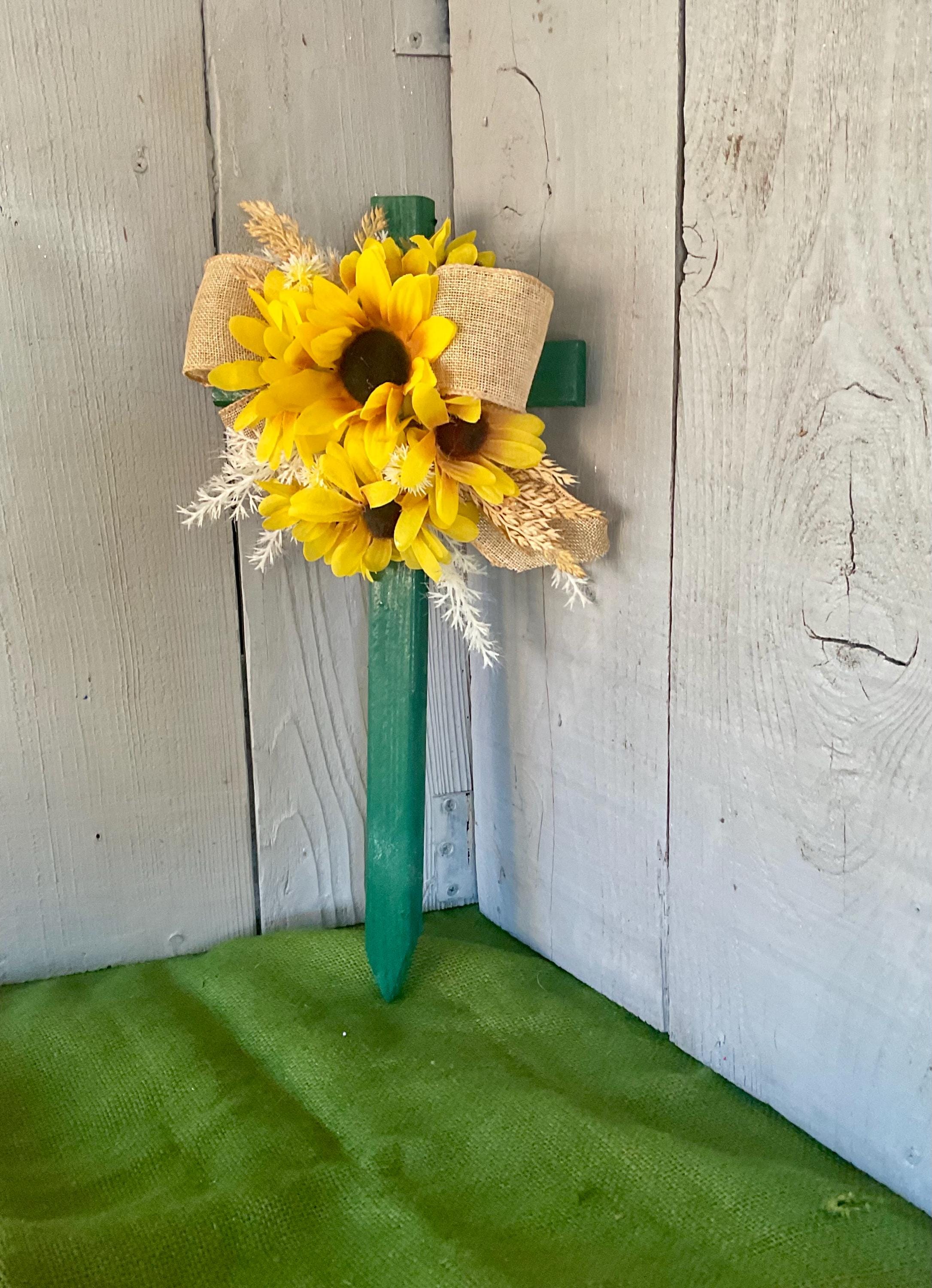Enhance the beauty of your loved one's resting place with this 18” pine cemetery cross. Expertly hand-painted green and adorned with a cascade of sunflowers in various sizes, branches of natural grasses in beige and brown and natural brown burlap ribbon. A heartfelt tribute that radiates peace and love. The cross has a pointed end for easy ground insertion. Every cross is sprayed with a coat of clear polyurethane to protect the ribbon and silk flowers from outdoor elements.
