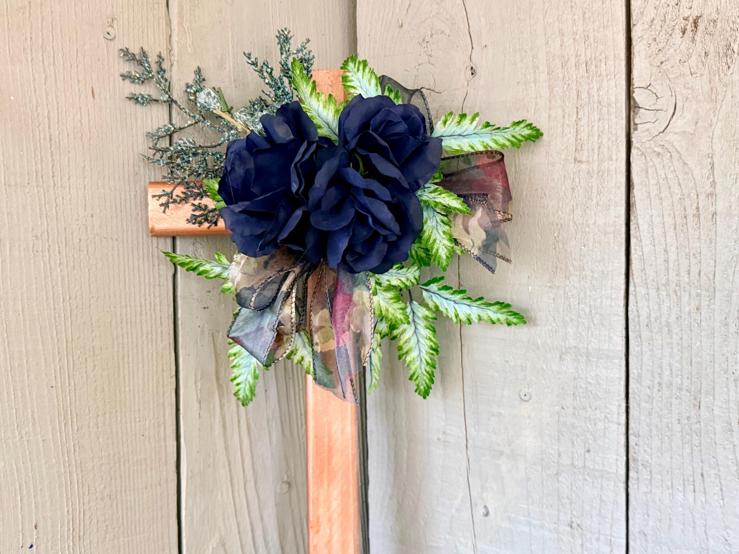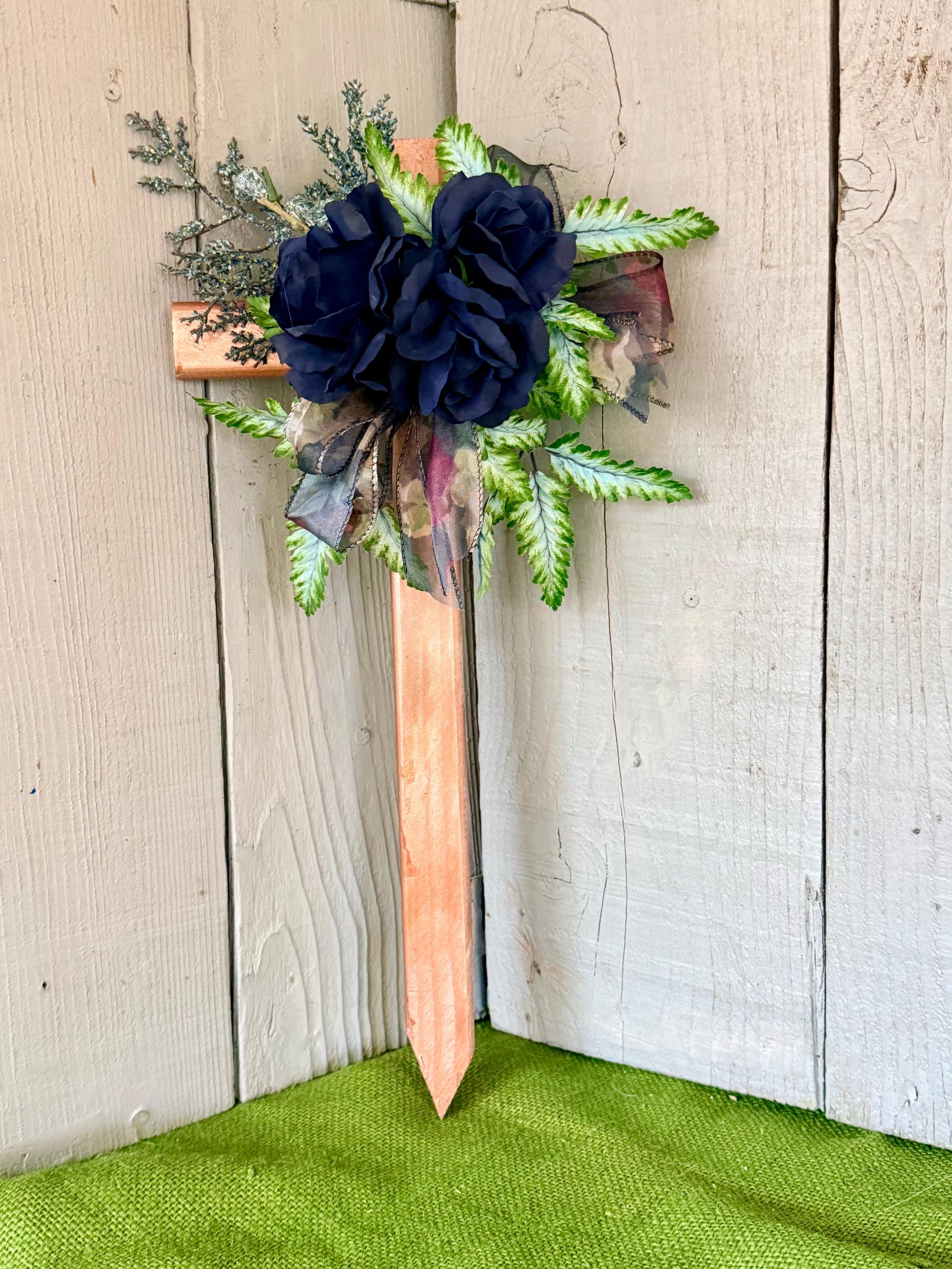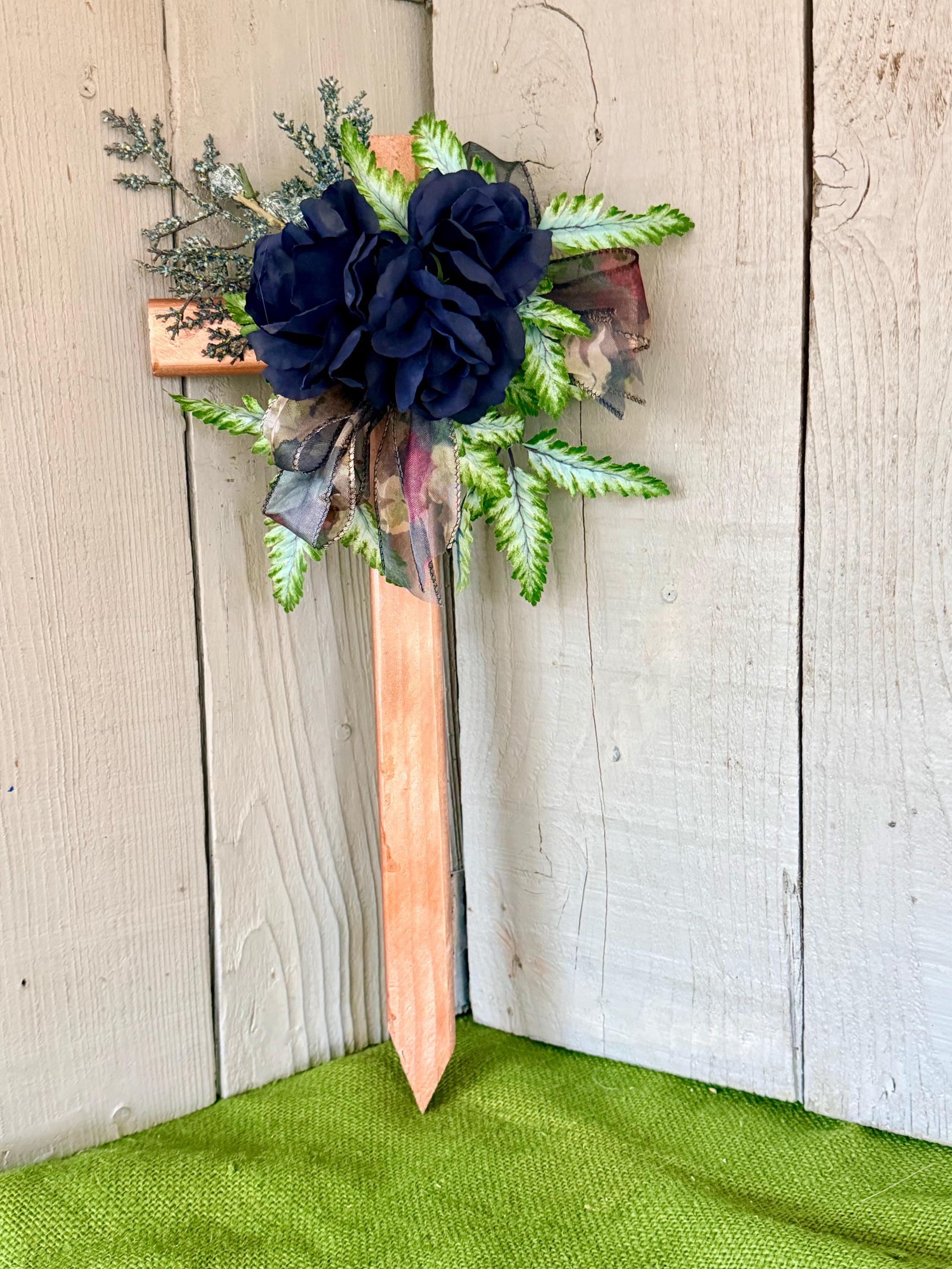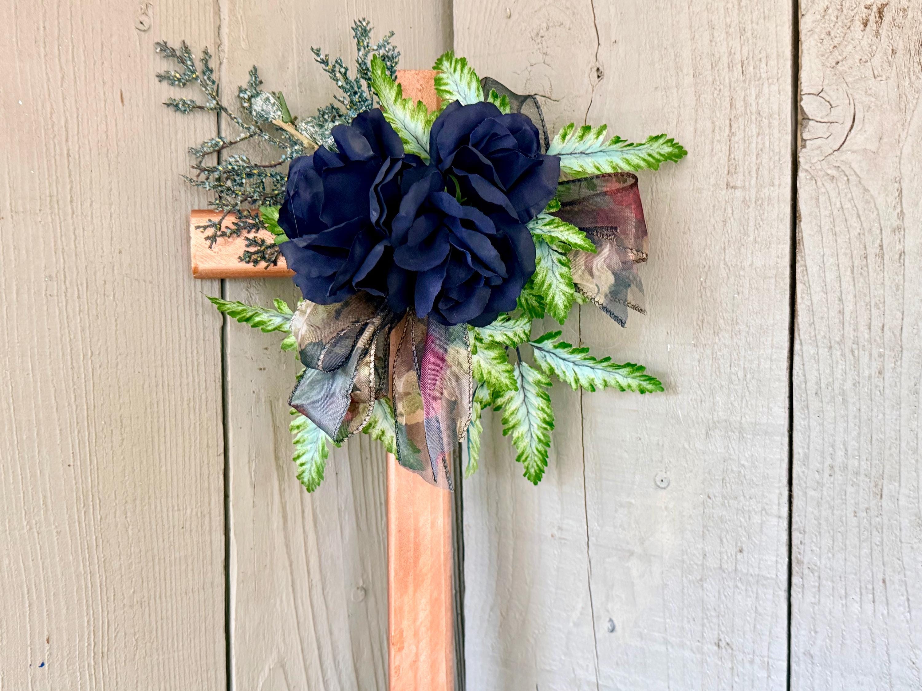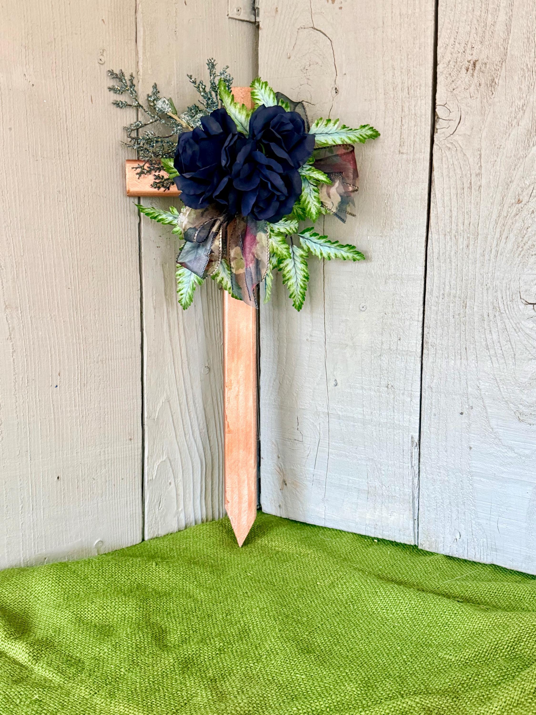 This 18” rustic pine cemetery cross has been painted copper with three blue roses, greenery, blue seeded branches, and dark blue sheer floral ribbon.