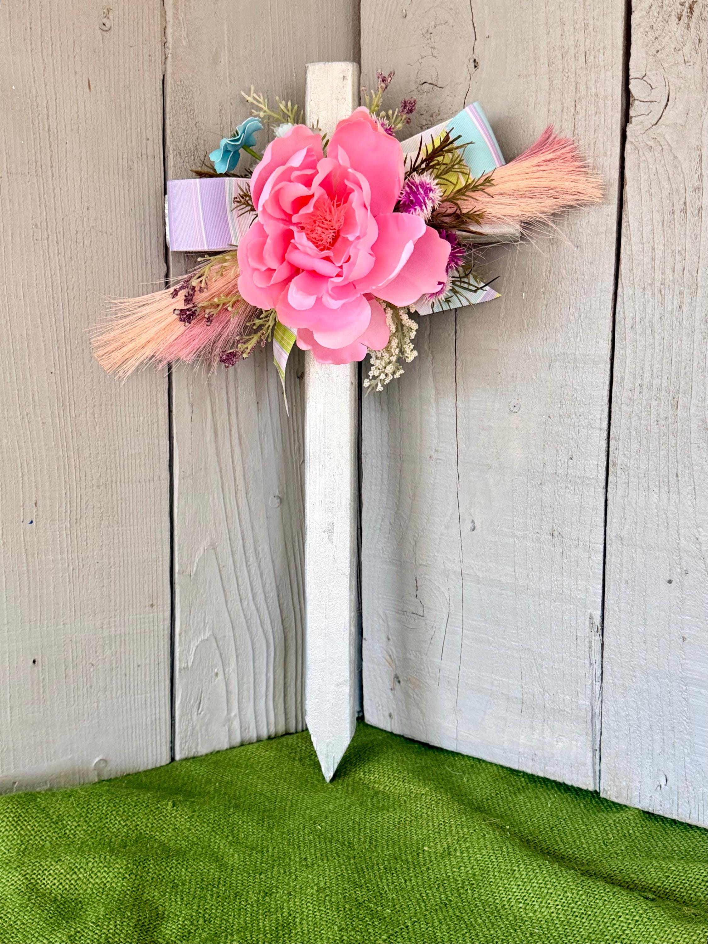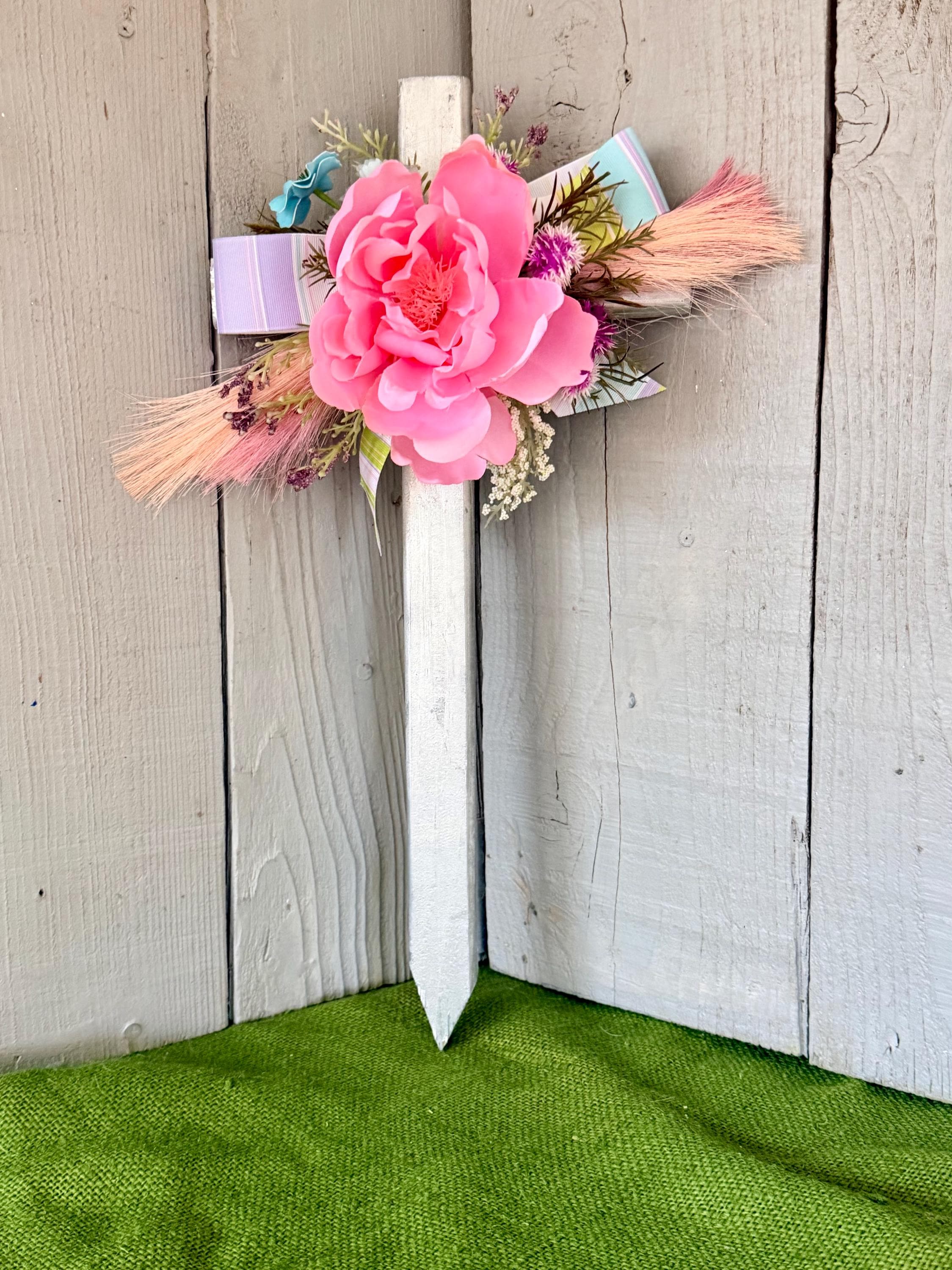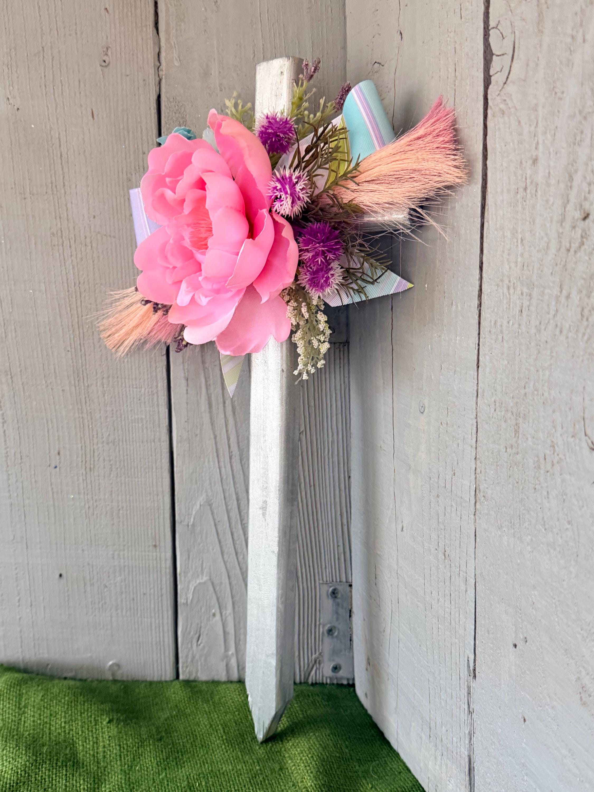 This 18” rustic pine cemetery cross has been painted silver with a pink peony centered, mini blue wildflowers, pink pampas grass, white seeded branches, and striped pastel ribbon.