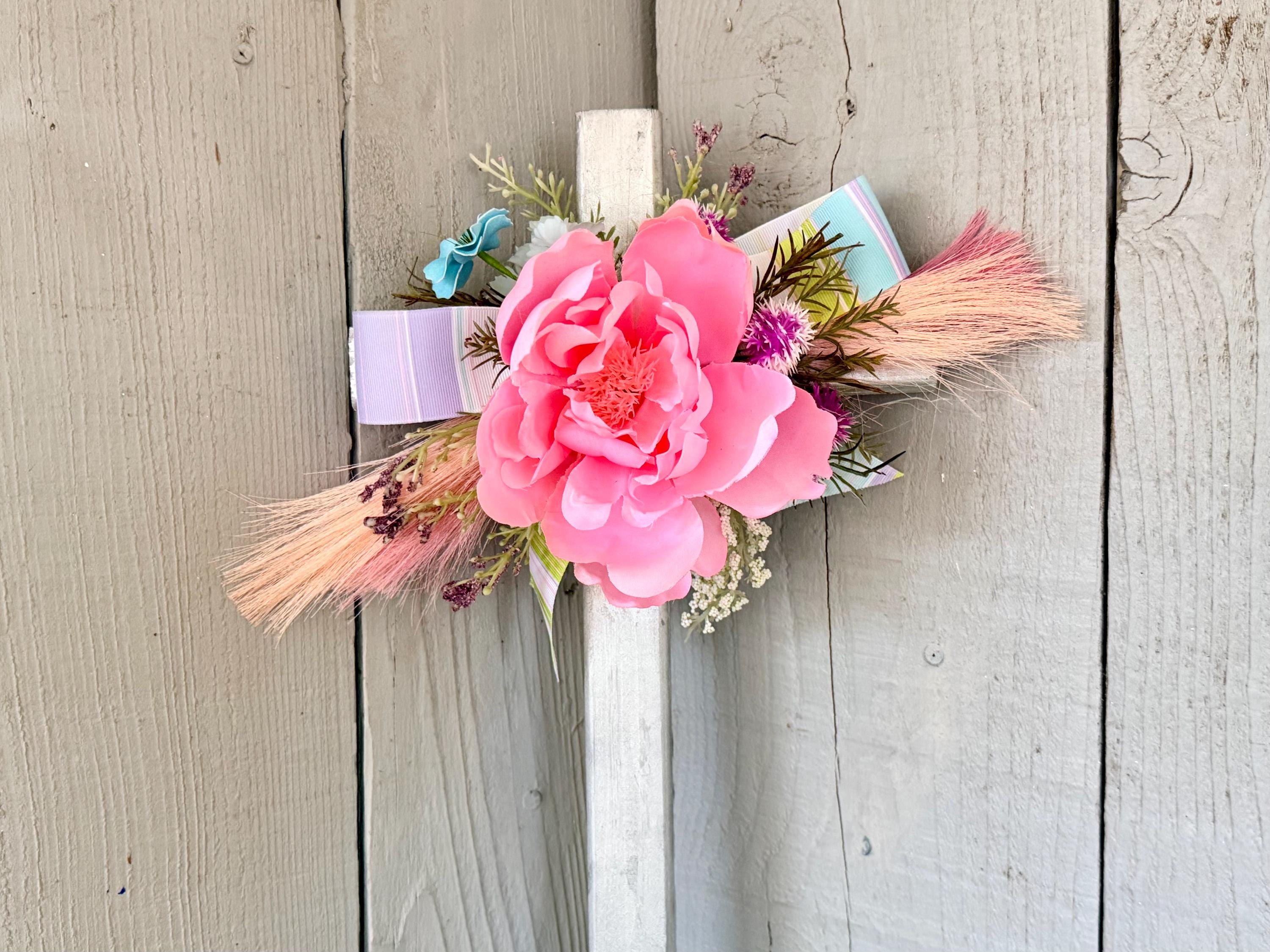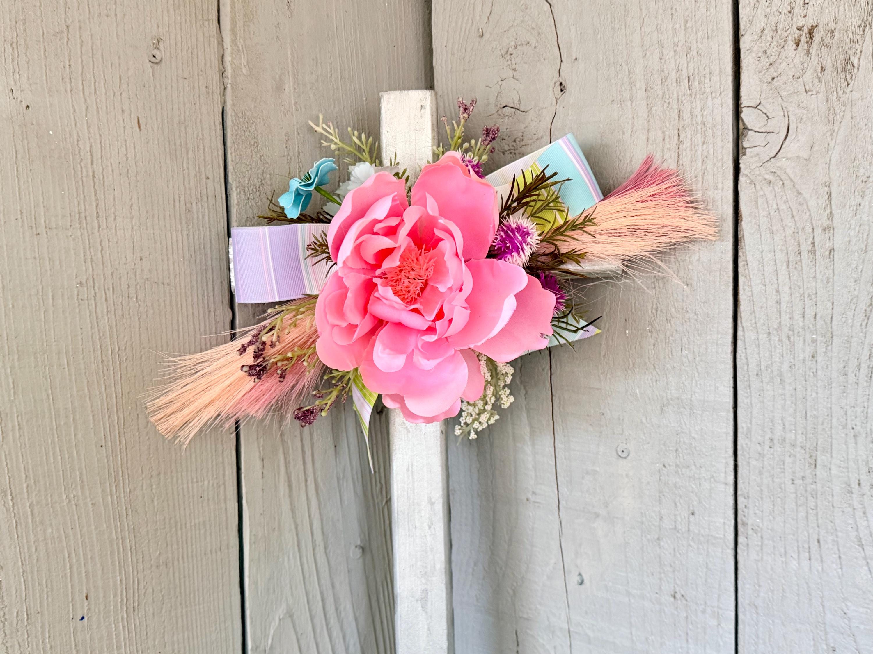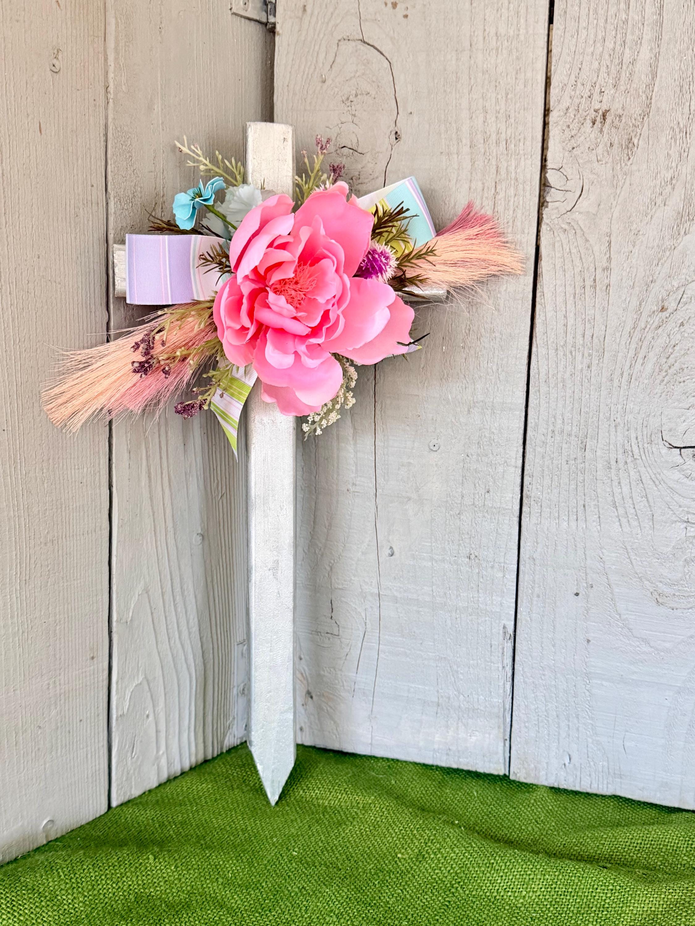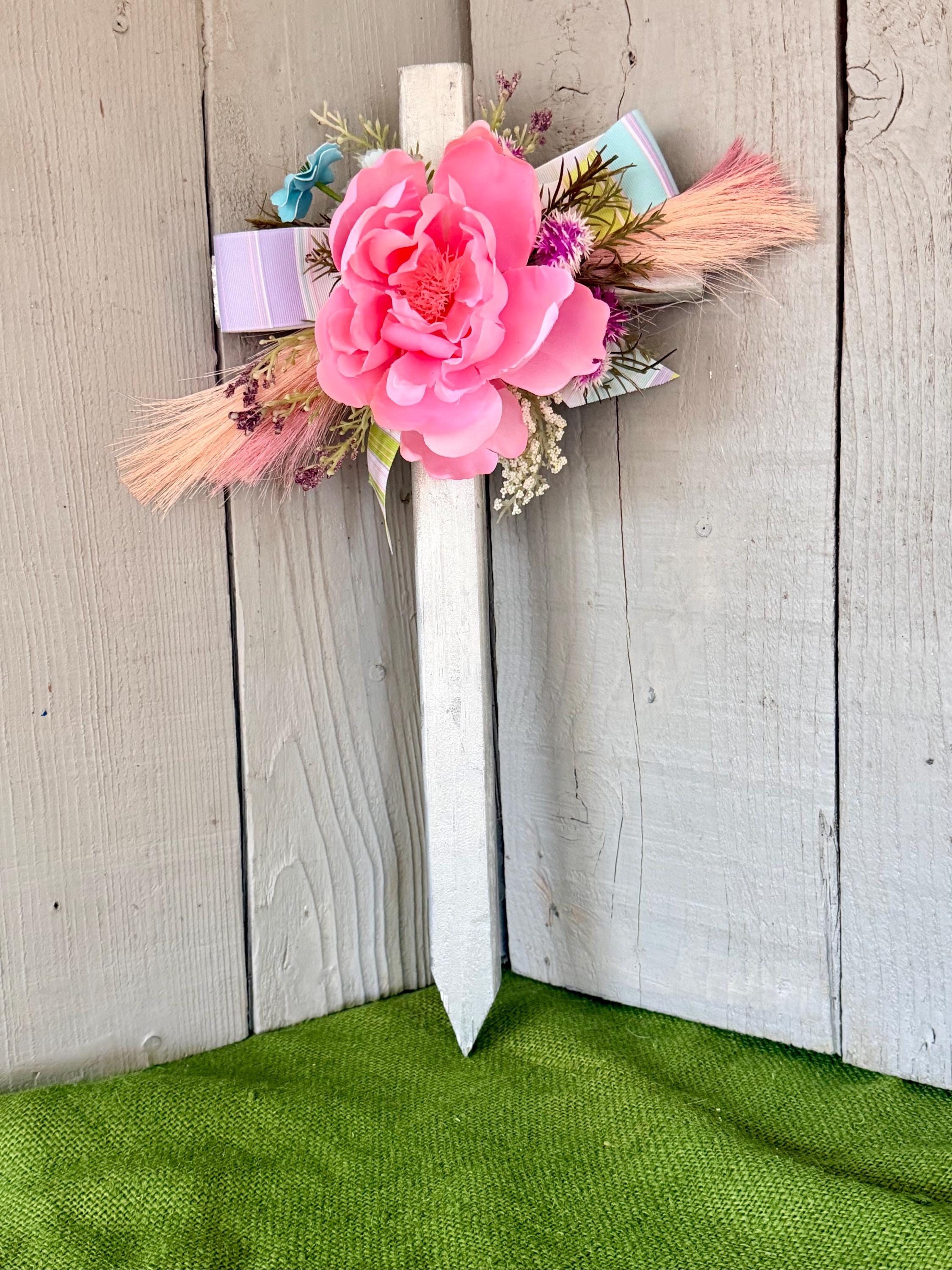 This 18” rustic pine cemetery cross has been painted silver with a pink peony centered, mini blue wildflowers, pink pampas grass, white seeded branches, and striped pastel ribbon.