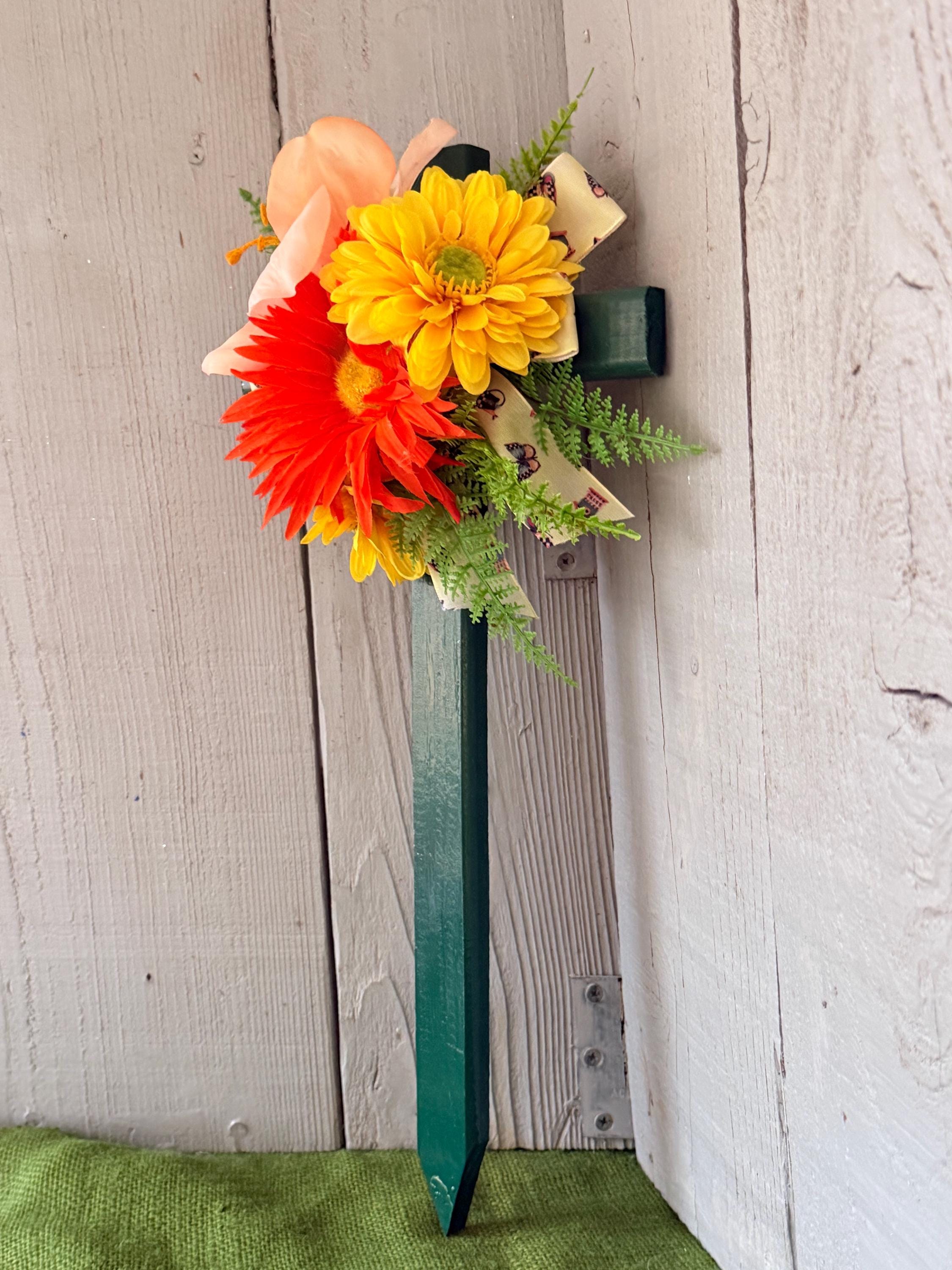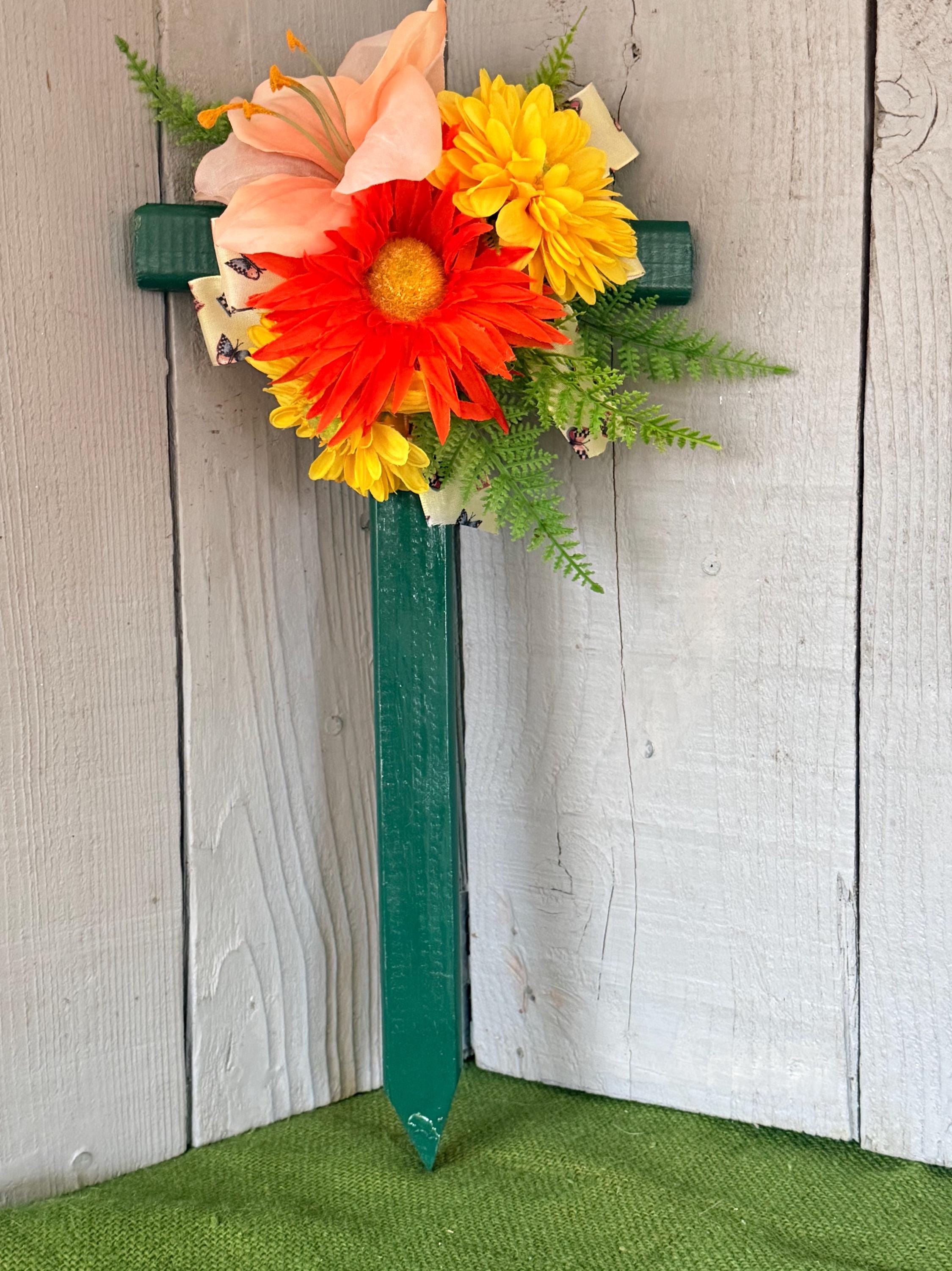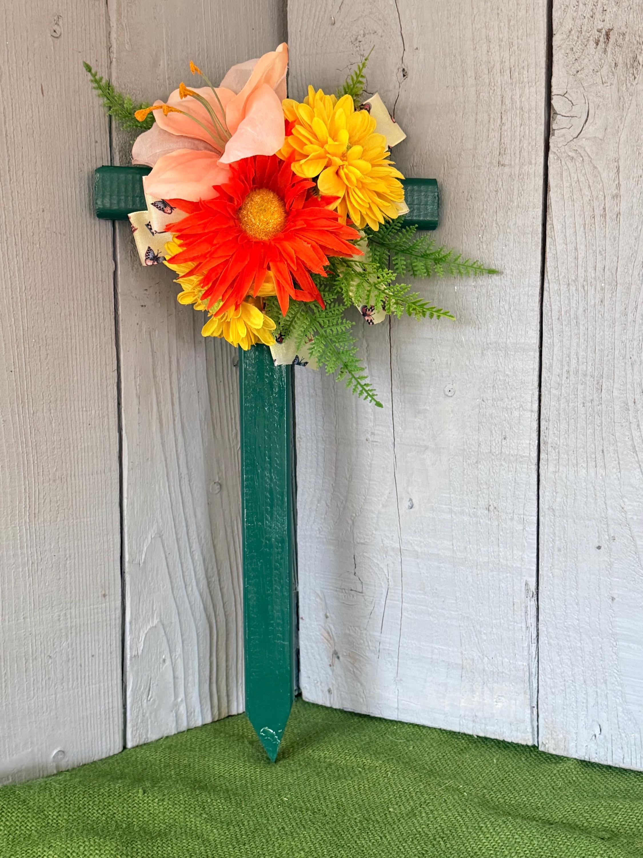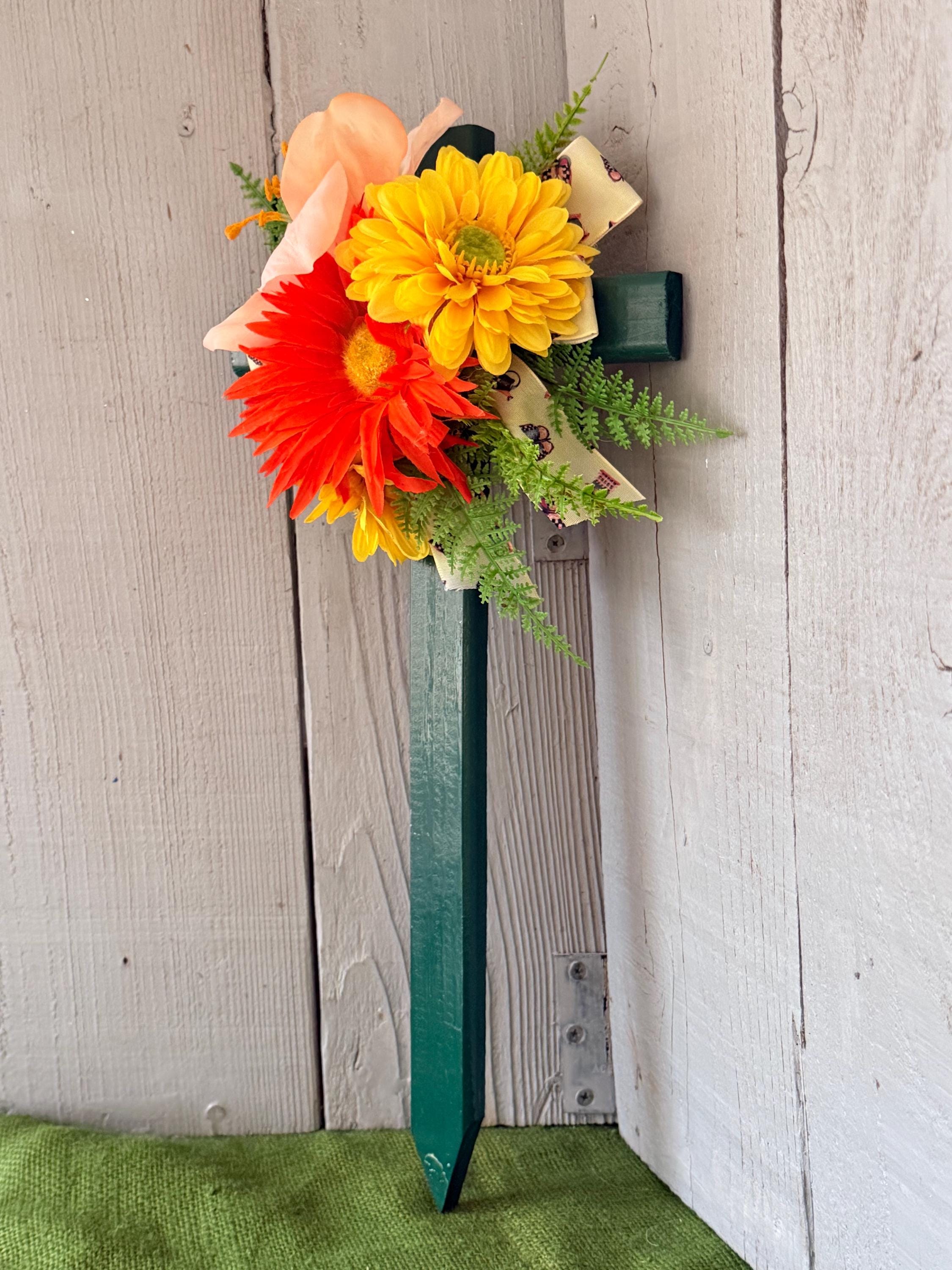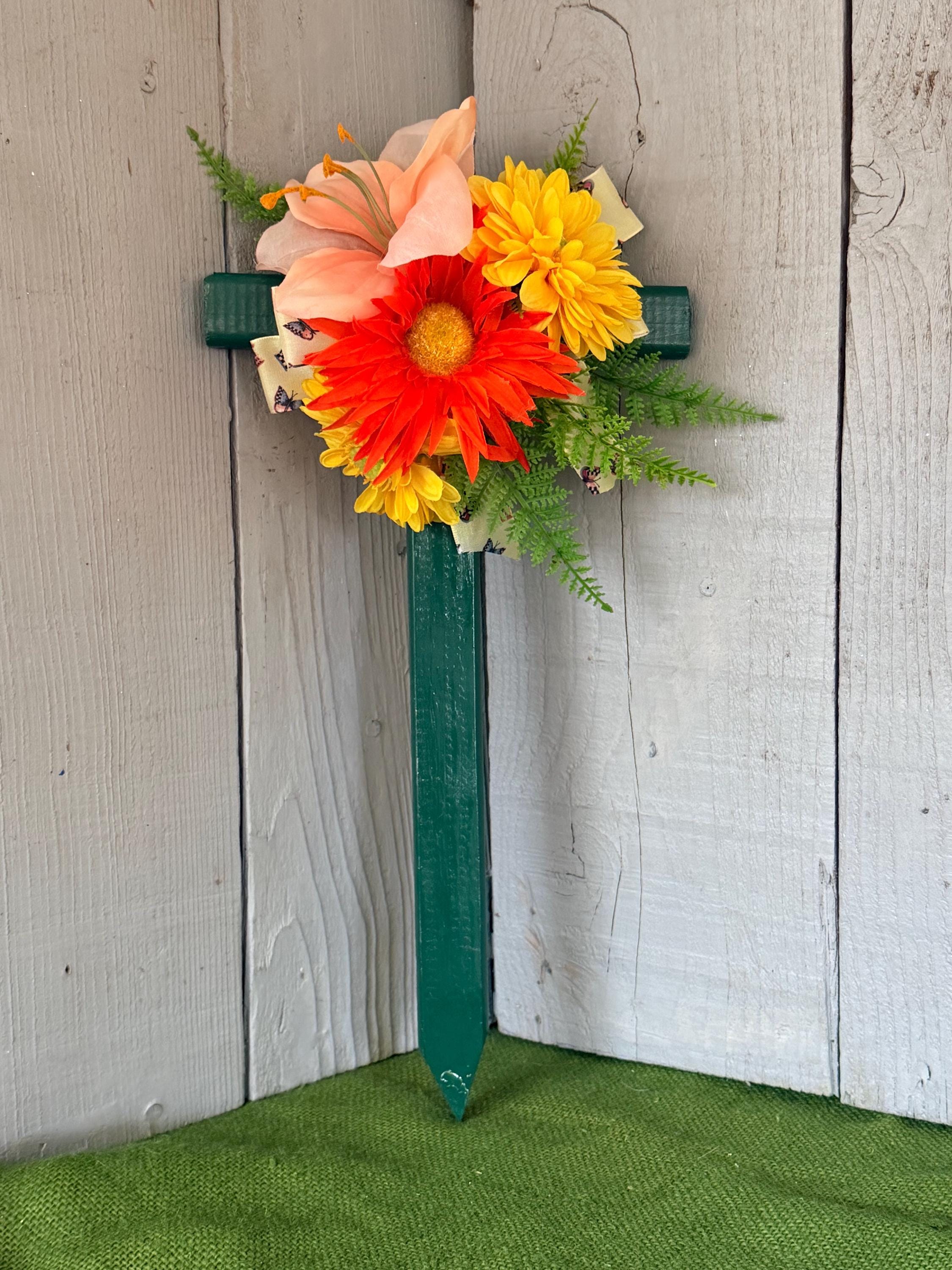 Enhance the beauty of your loved one's resting place with this 18” pine cemetery cross. Expertly hand-painted green adorned bright yellow and orange flowers, layers of greenery,and matching floral ribbon. A heartfelt tribute that radiates peace and love. The cross has a pointed end for easy ground insertion. Every cross is sprayed with a coat of clear polyurethane to protect the ribbon and silk flowers from outdoor elements.