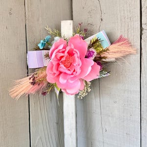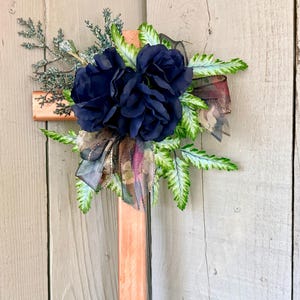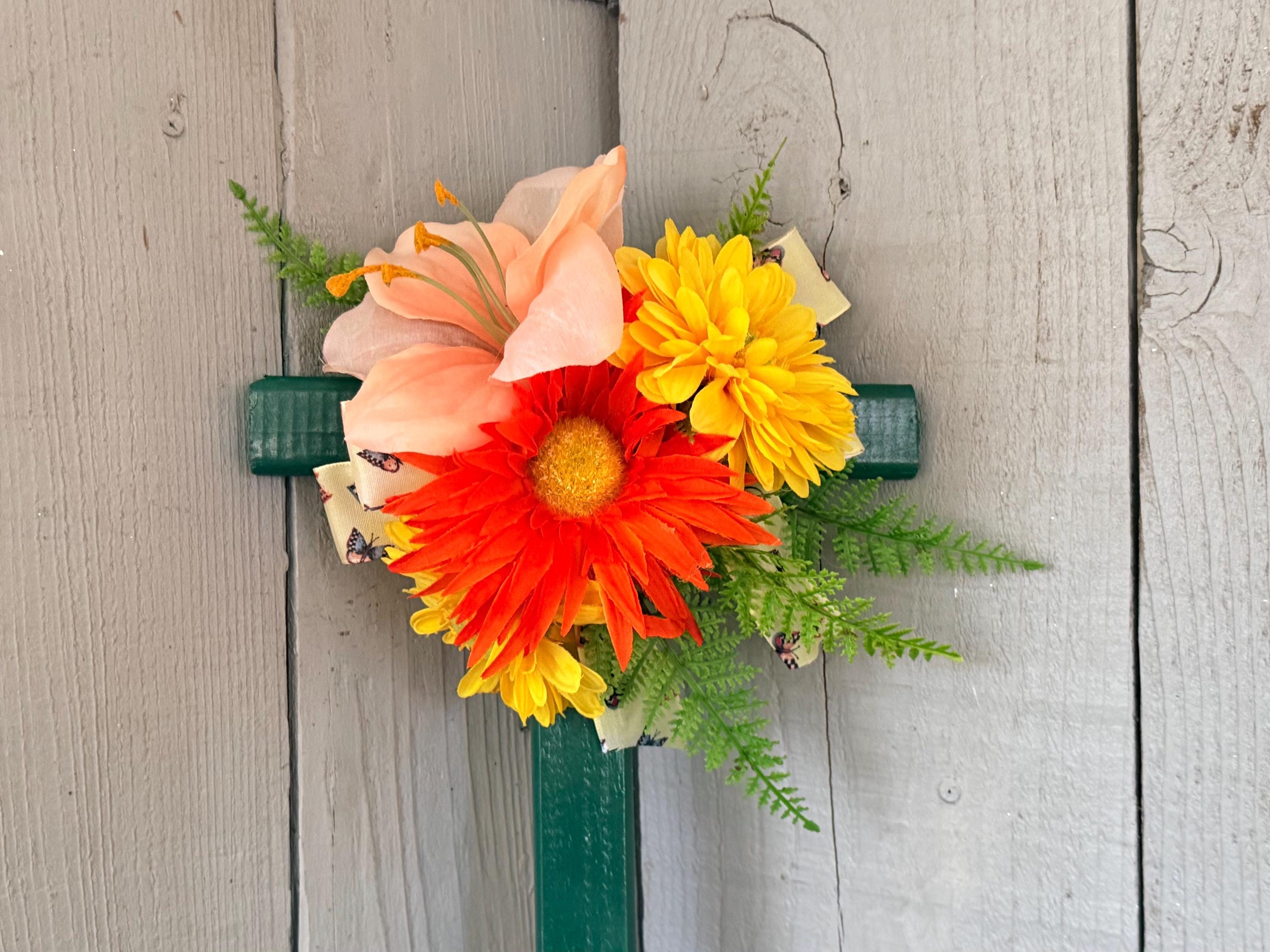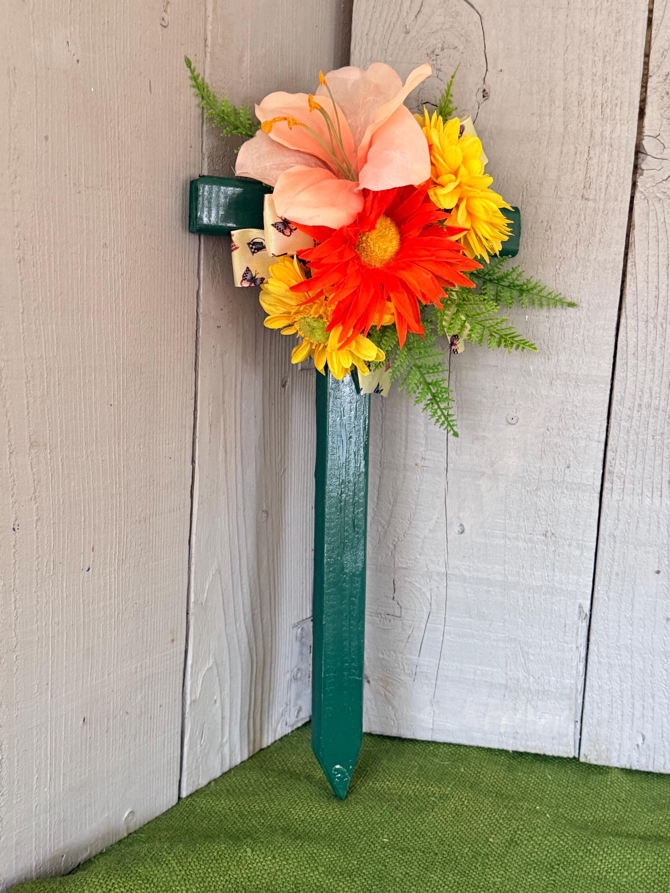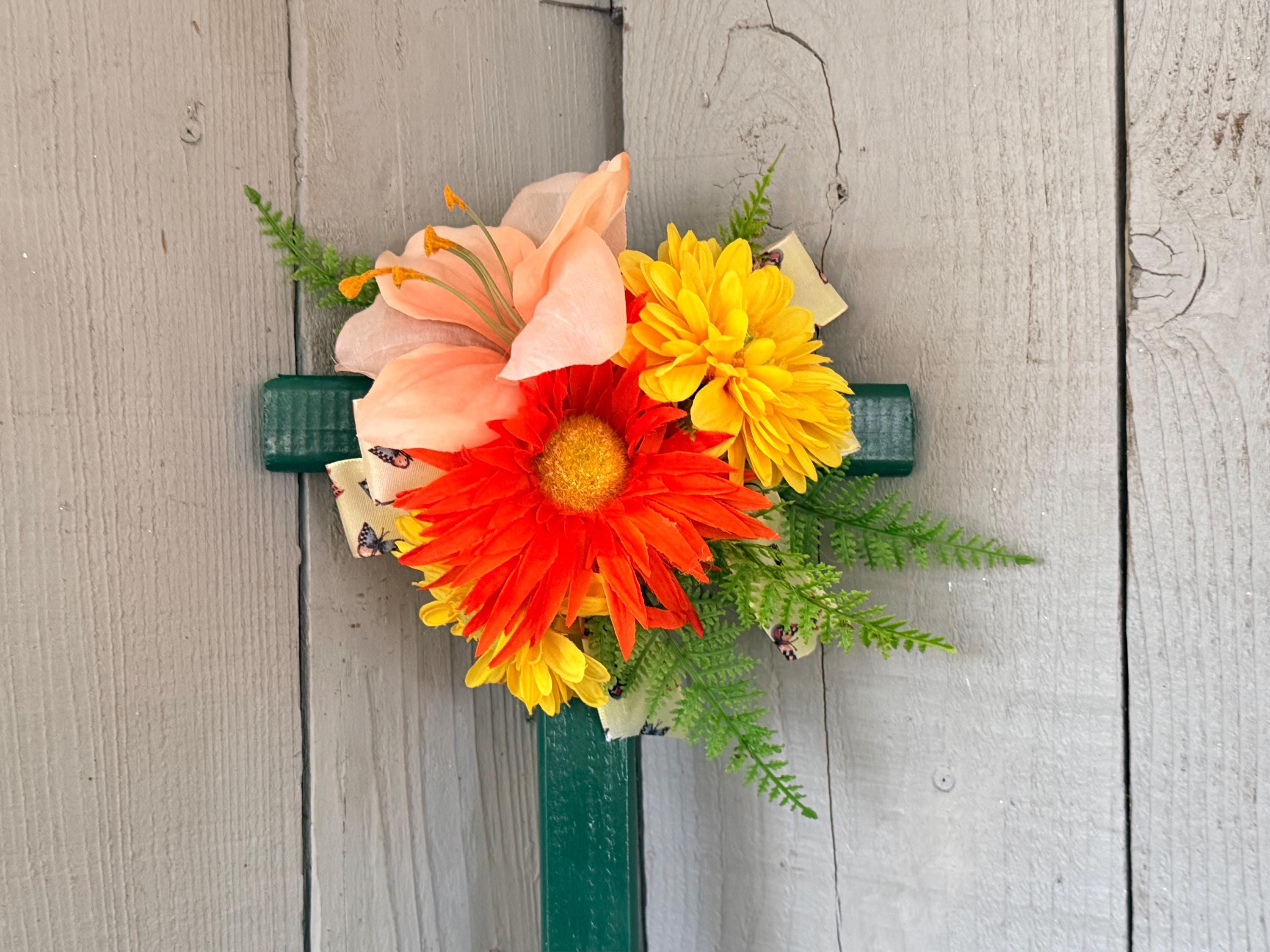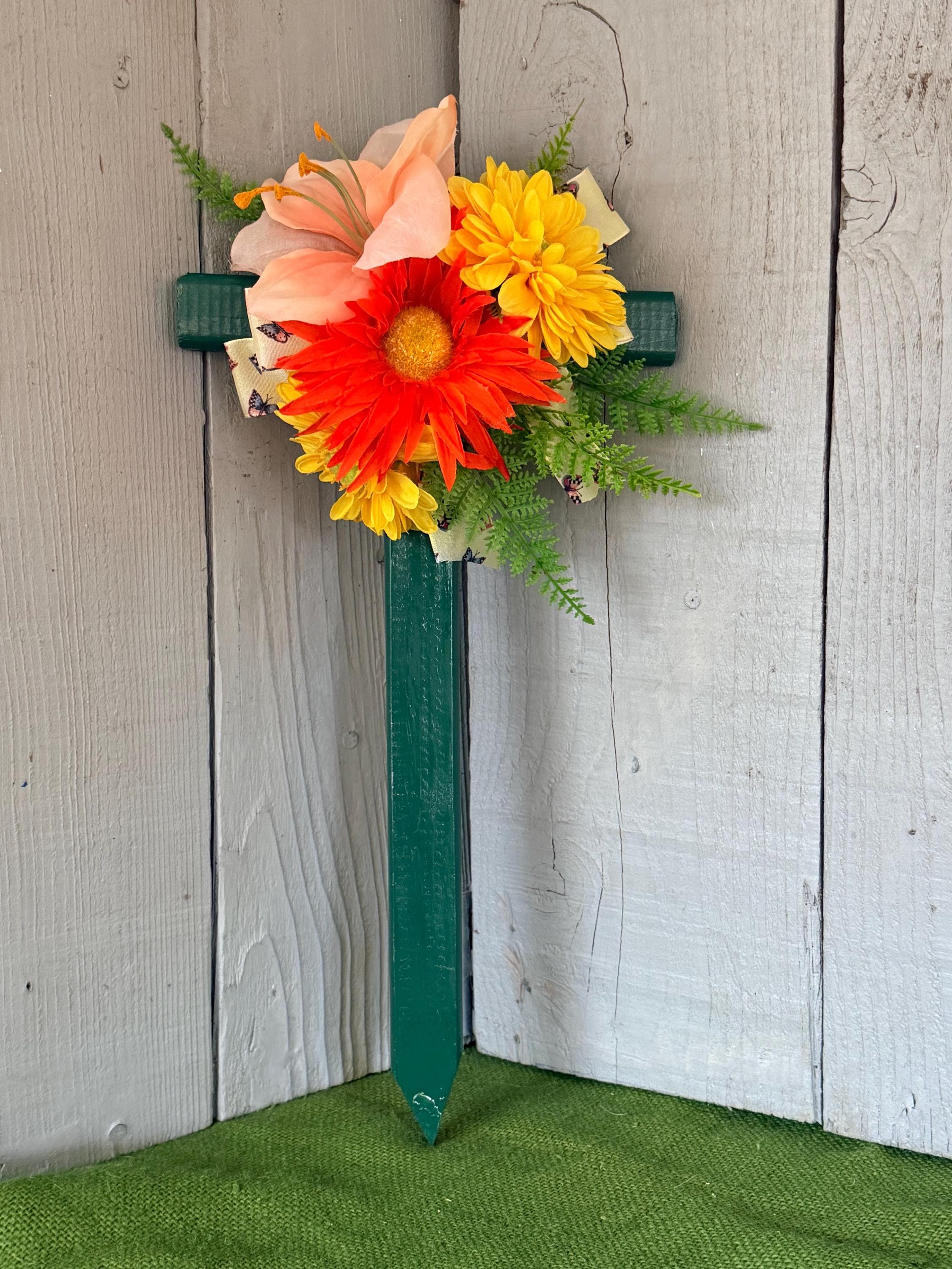 Enhance the beauty of your loved one's resting place with this 18” pine cemetery cross. Expertly hand-painted green adorned bright yellow and orange flowers, layers of greenery,and matching floral ribbon. A heartfelt tribute that radiates peace and love. The cross has a pointed end for easy ground insertion. Every cross is sprayed with a coat of clear polyurethane to protect the ribbon and silk flowers from outdoor elements.