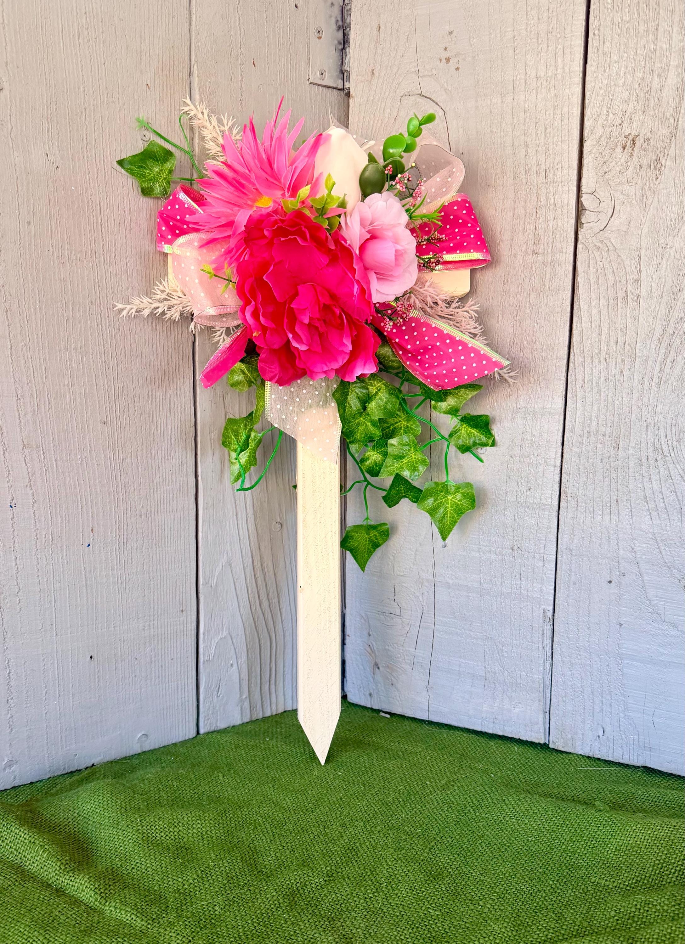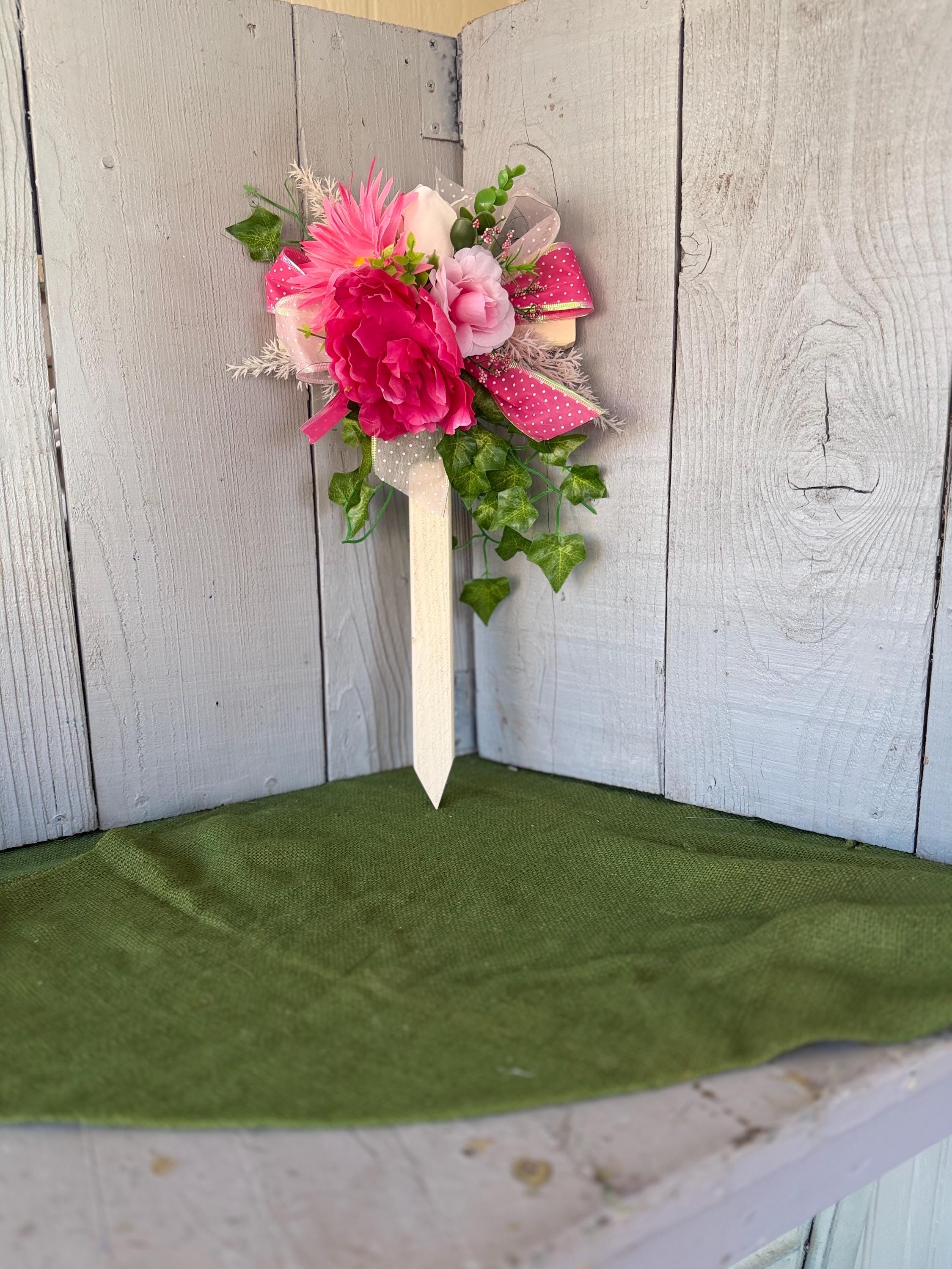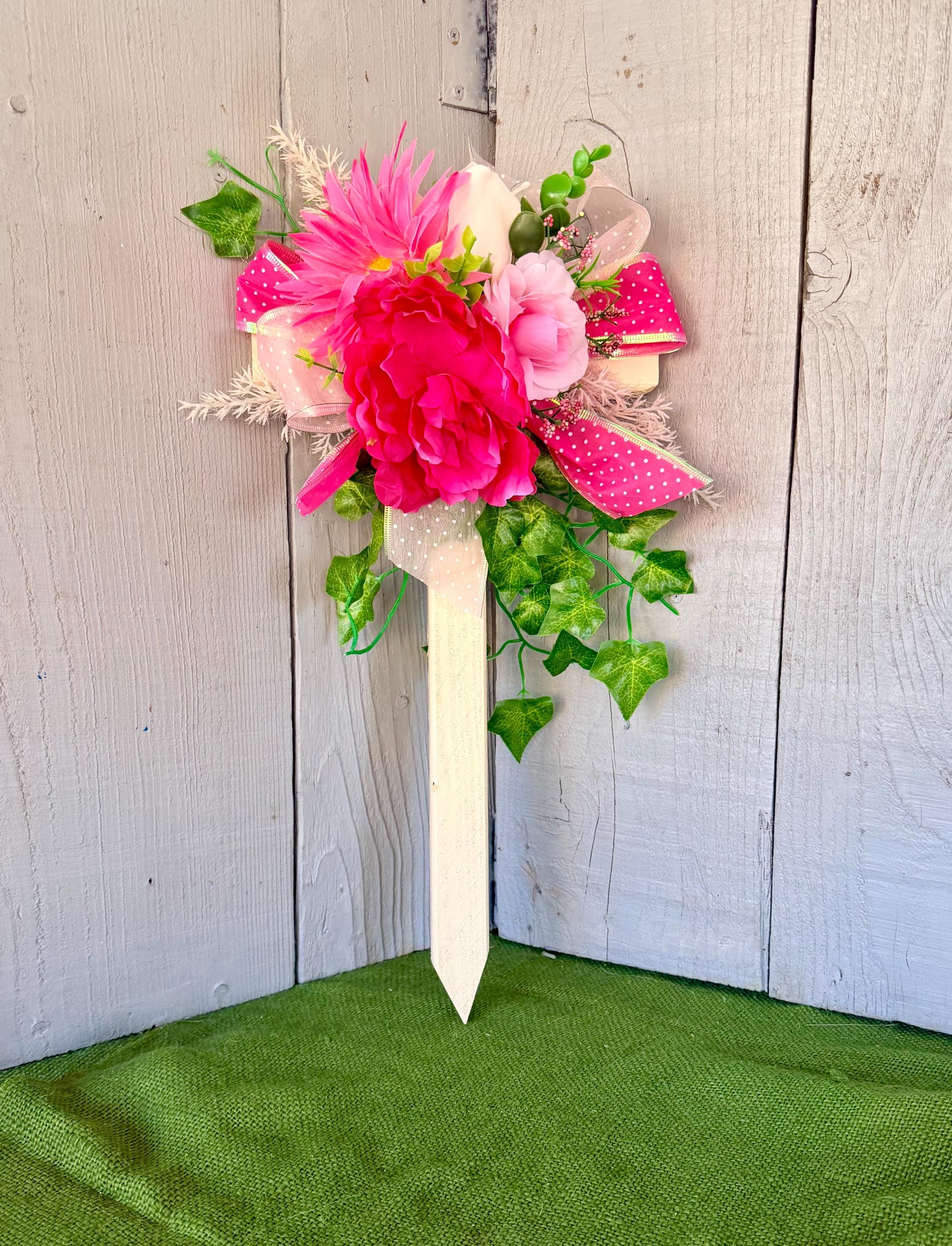 The cross has a pointed end for easy ground insertion. Every cross is sprayed with a coat of clear polyurethane to protect the ribbon and silk flowers from outdoor elements.