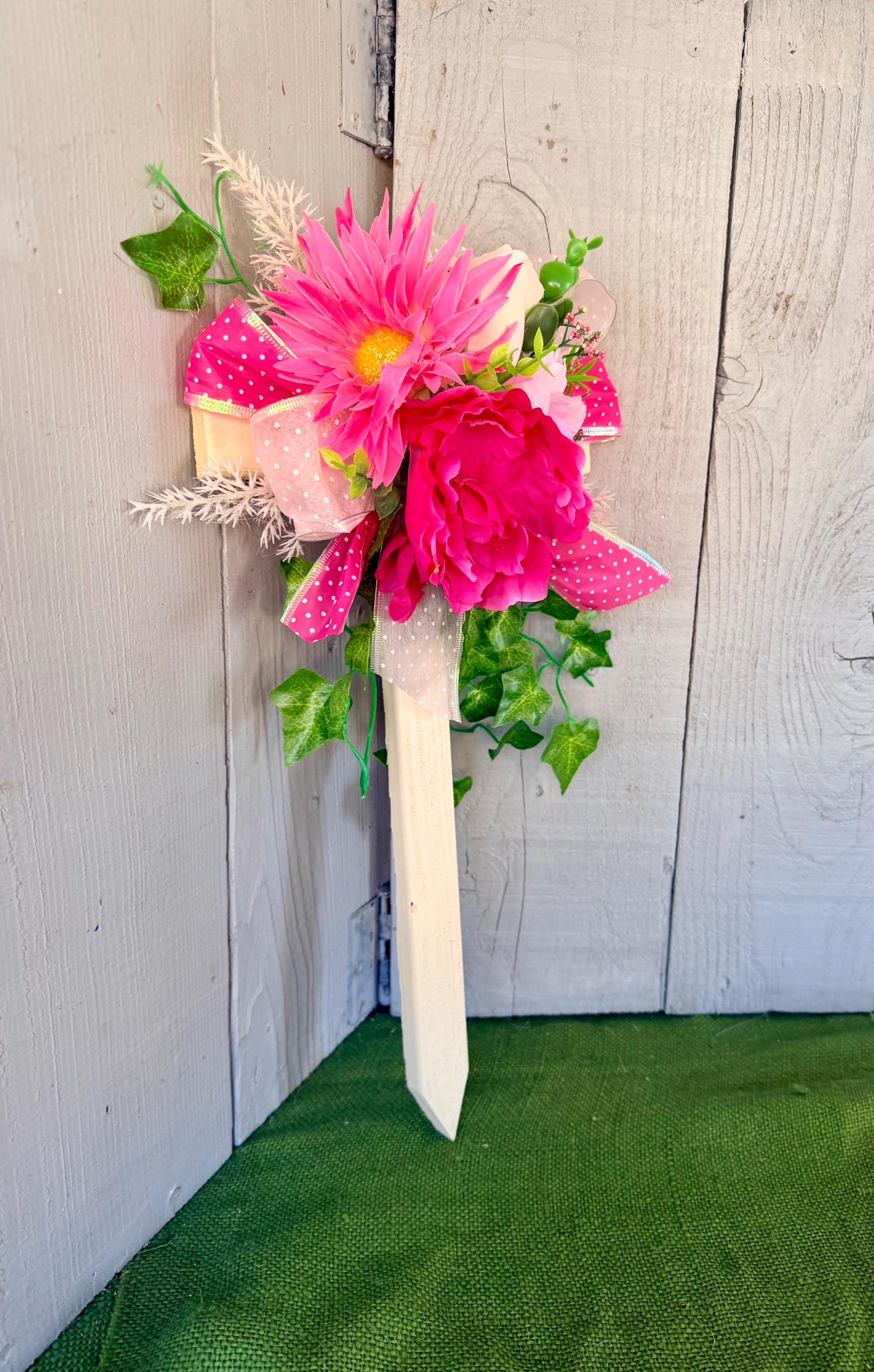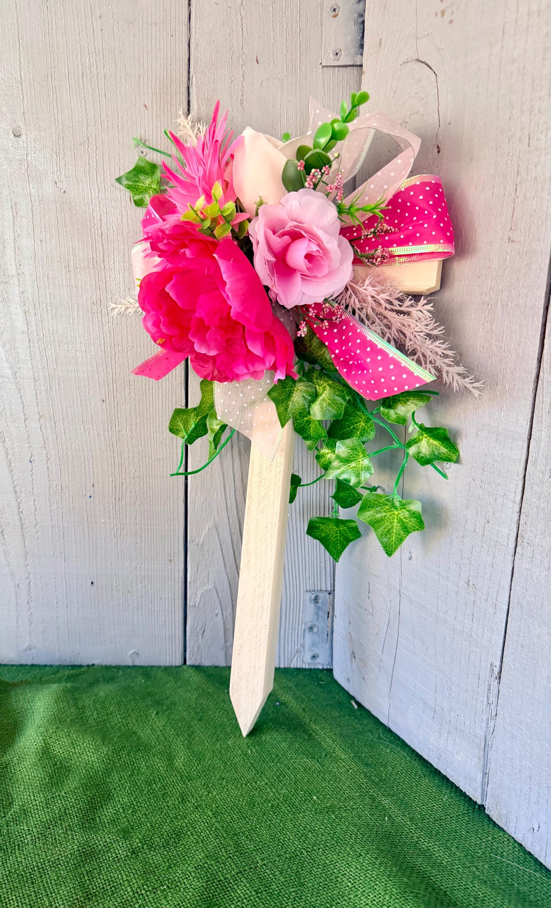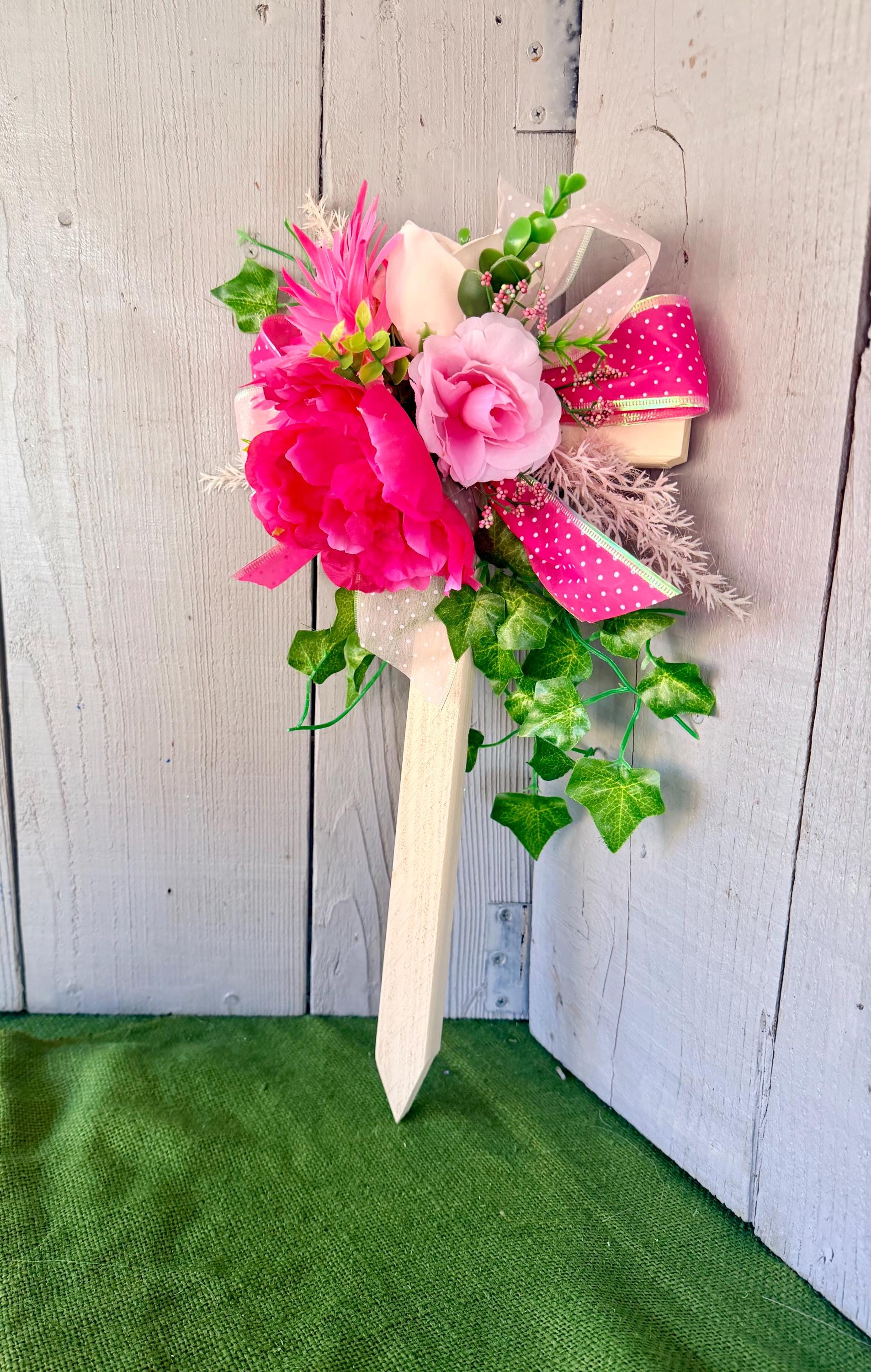The cross has a pointed end for easy ground insertion. Every cross is sprayed with a coat of clear polyurethane to protect the ribbon and silk flowers from outdoor elements.