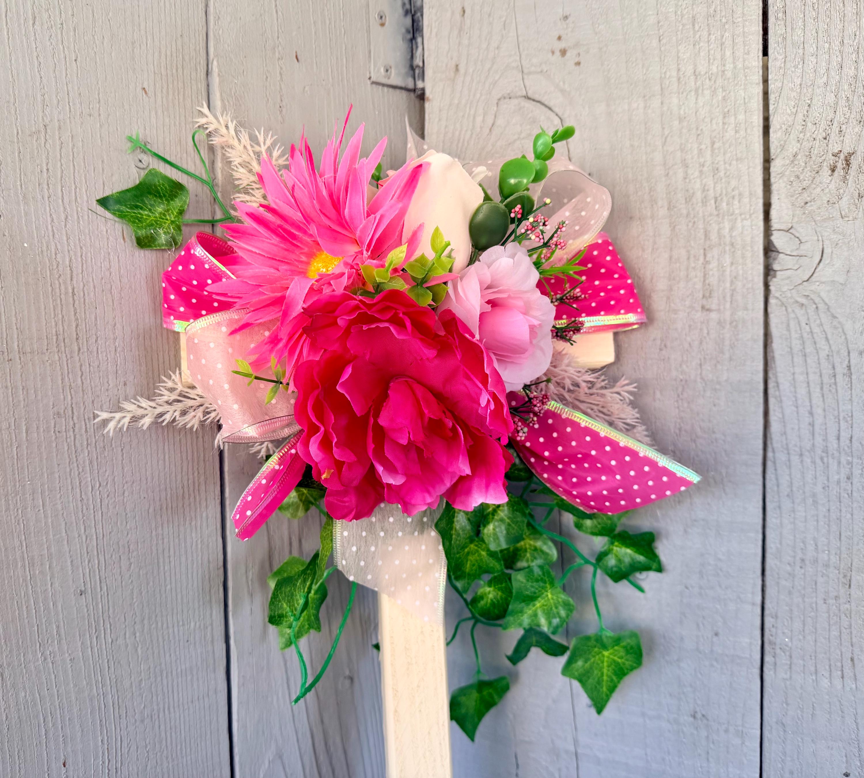 This 18” pine cemetery cross has been painted a cream color with pink roses, pink daisy, pink peony, layers of greenery and vine, white and pale pink pampas grass, and pale pink and