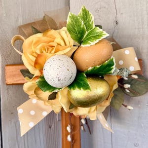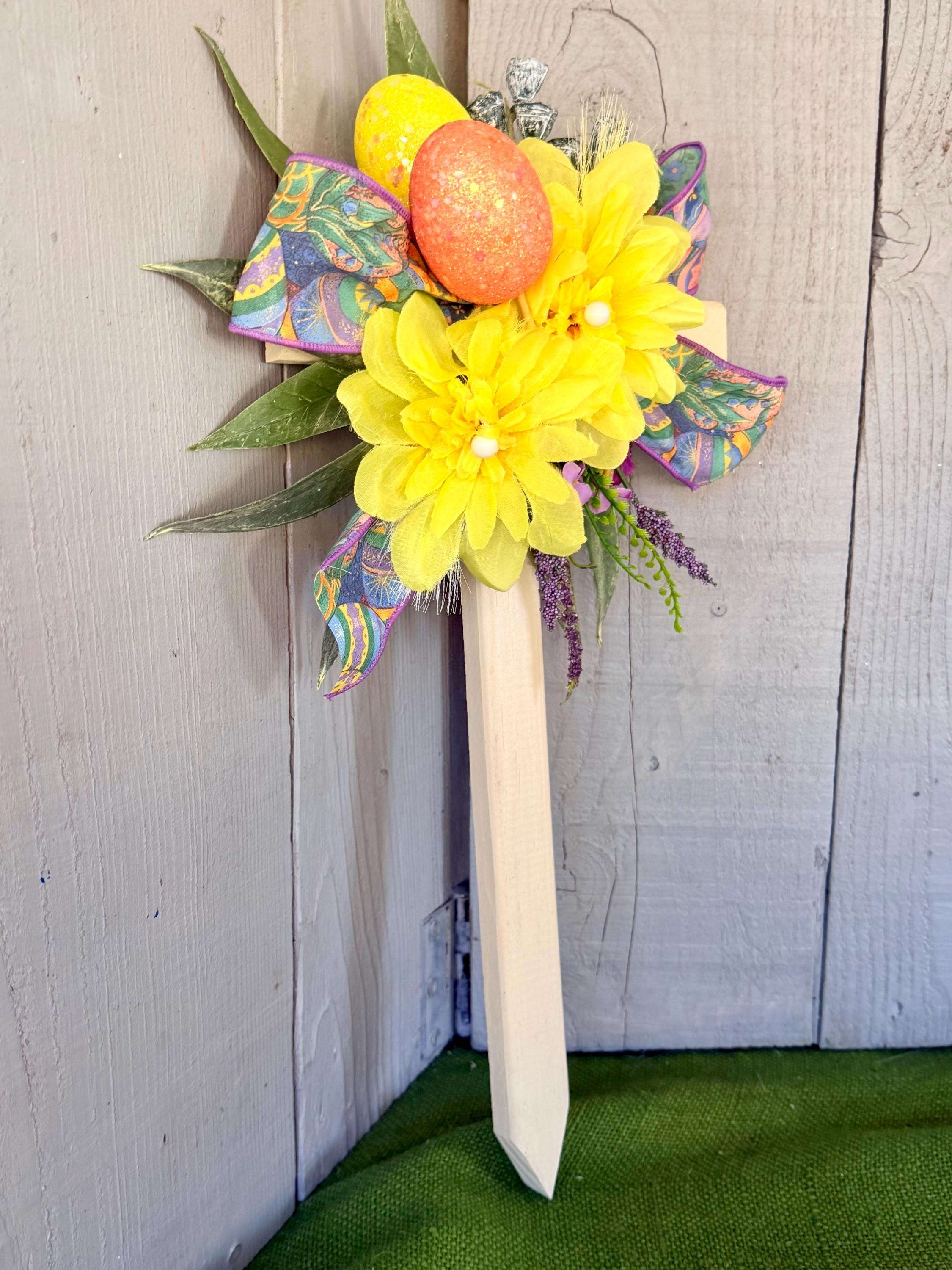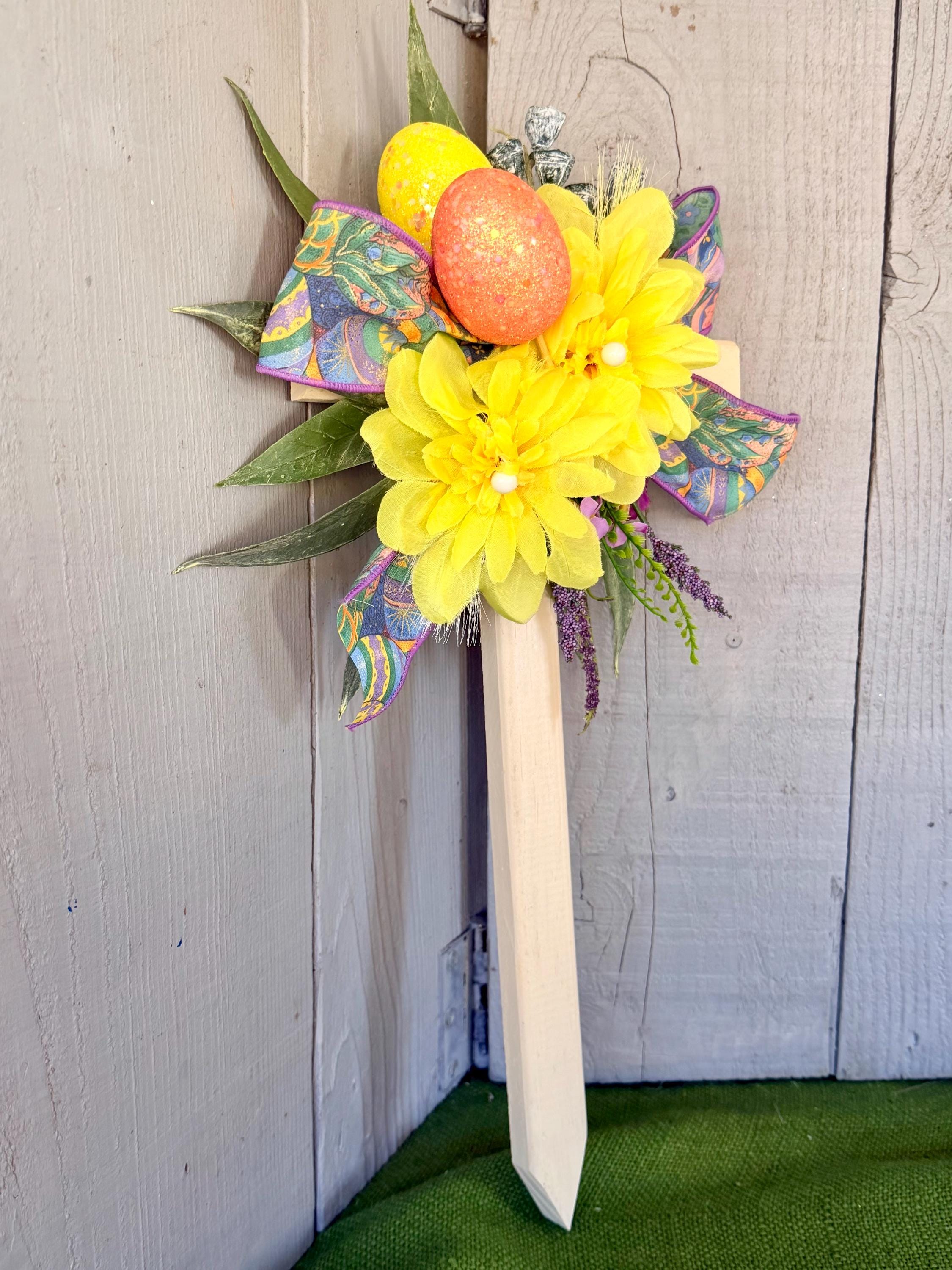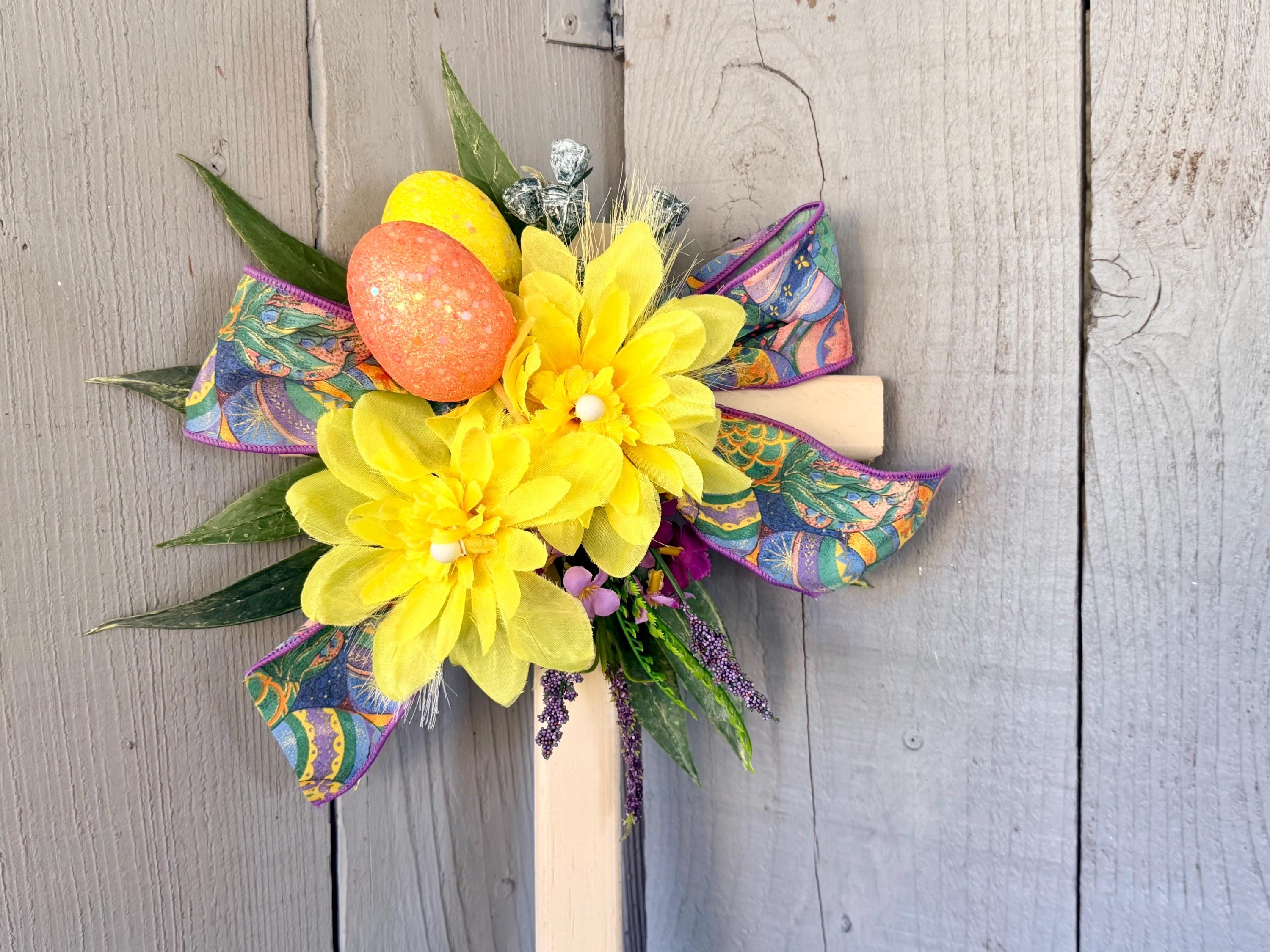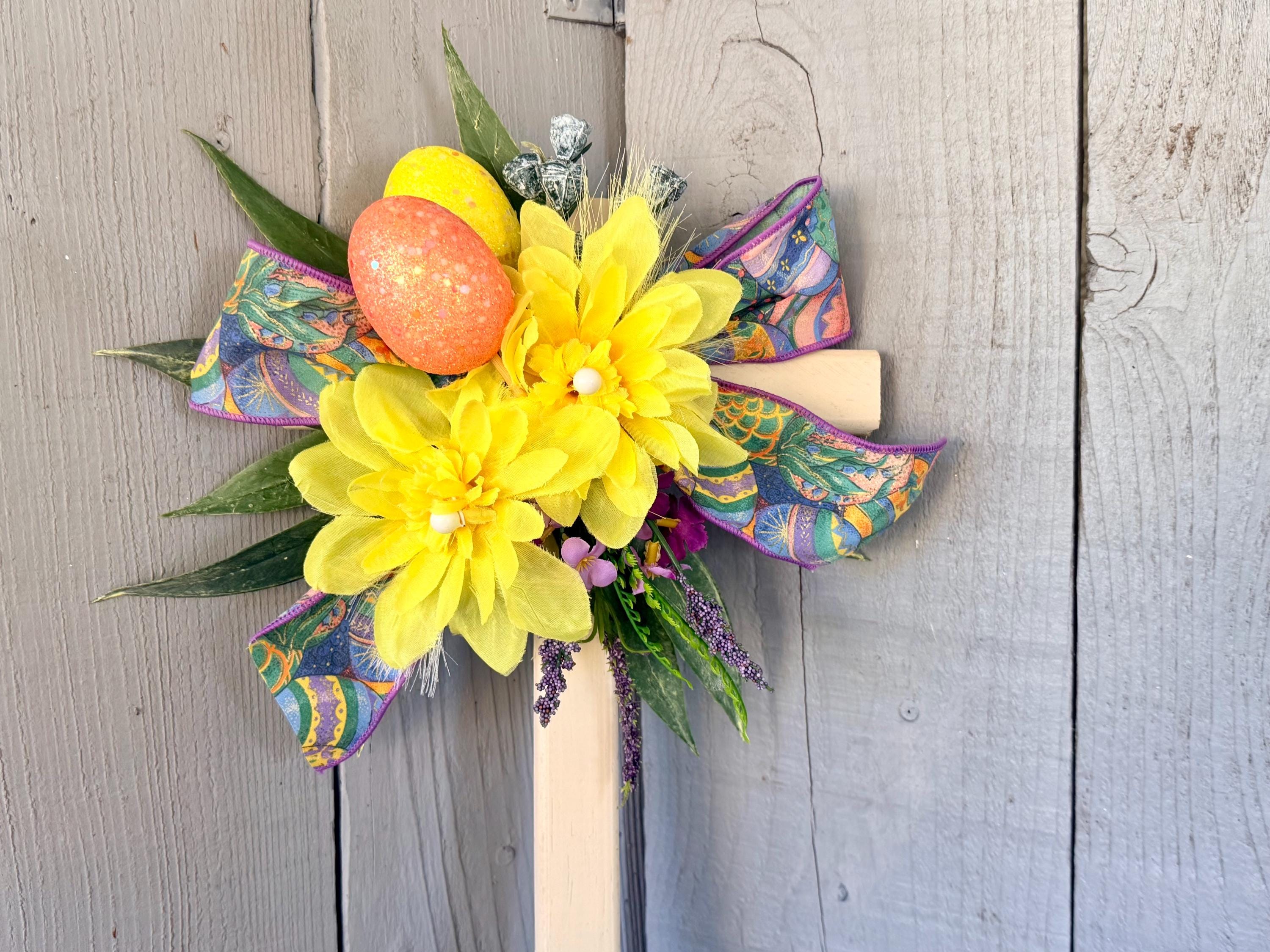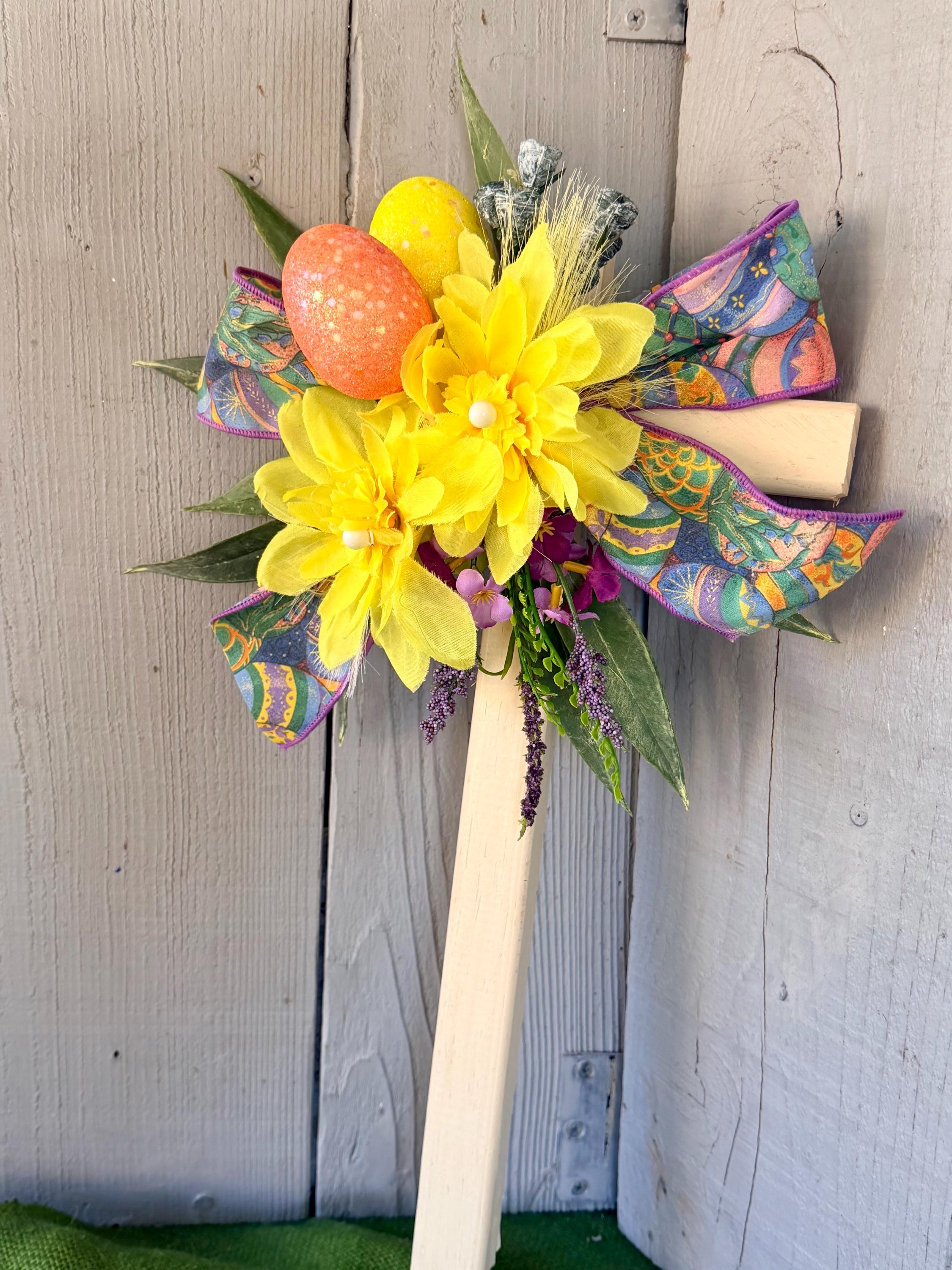 color with two large yellow mums, layers of greenery, purple wildflowers, two glitter Easter eggs -yellow orange , and Easter ribbon.