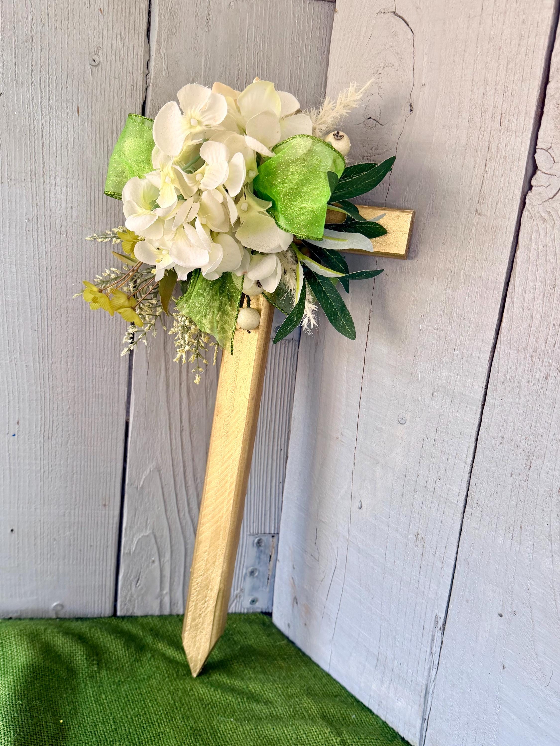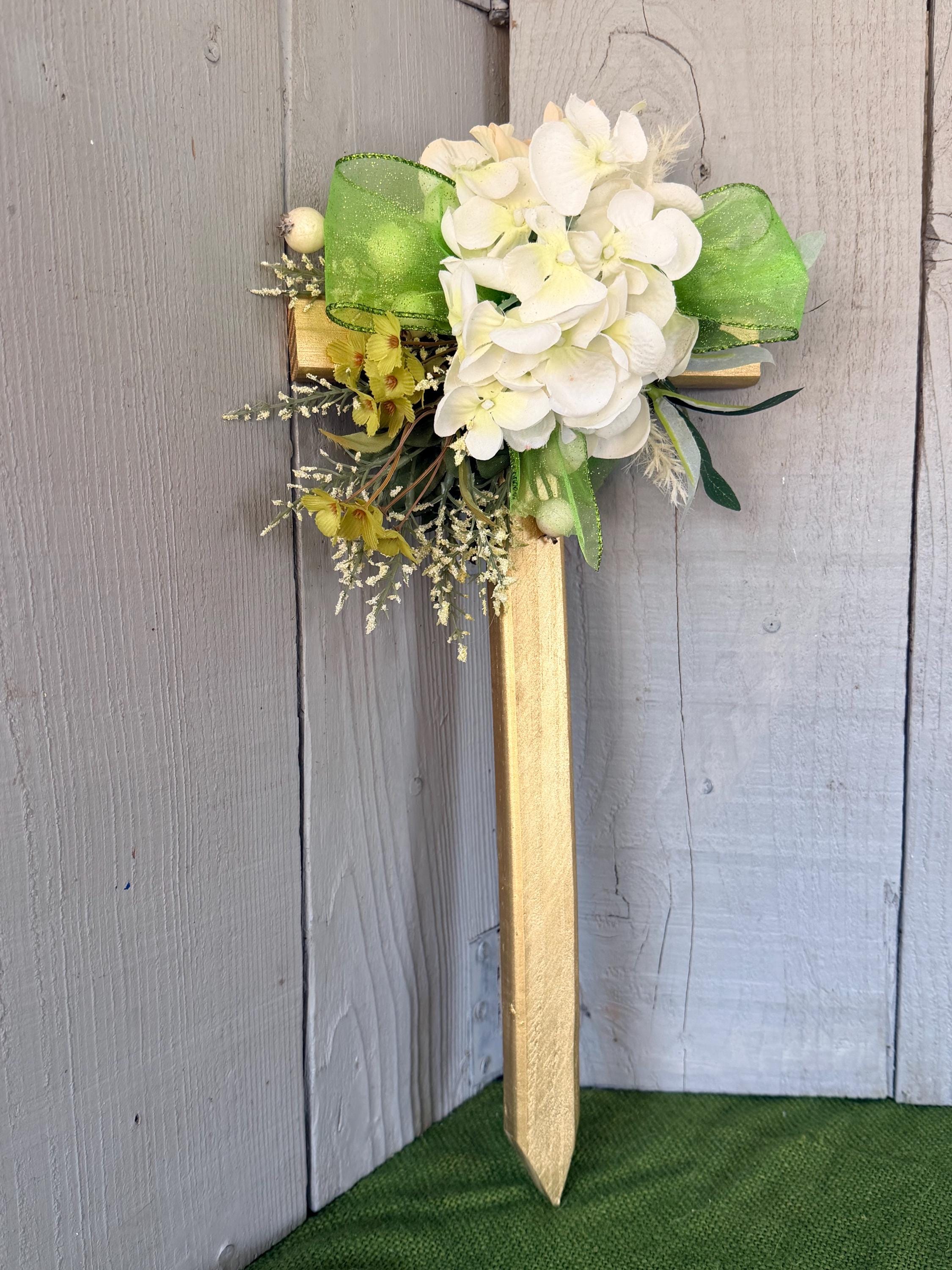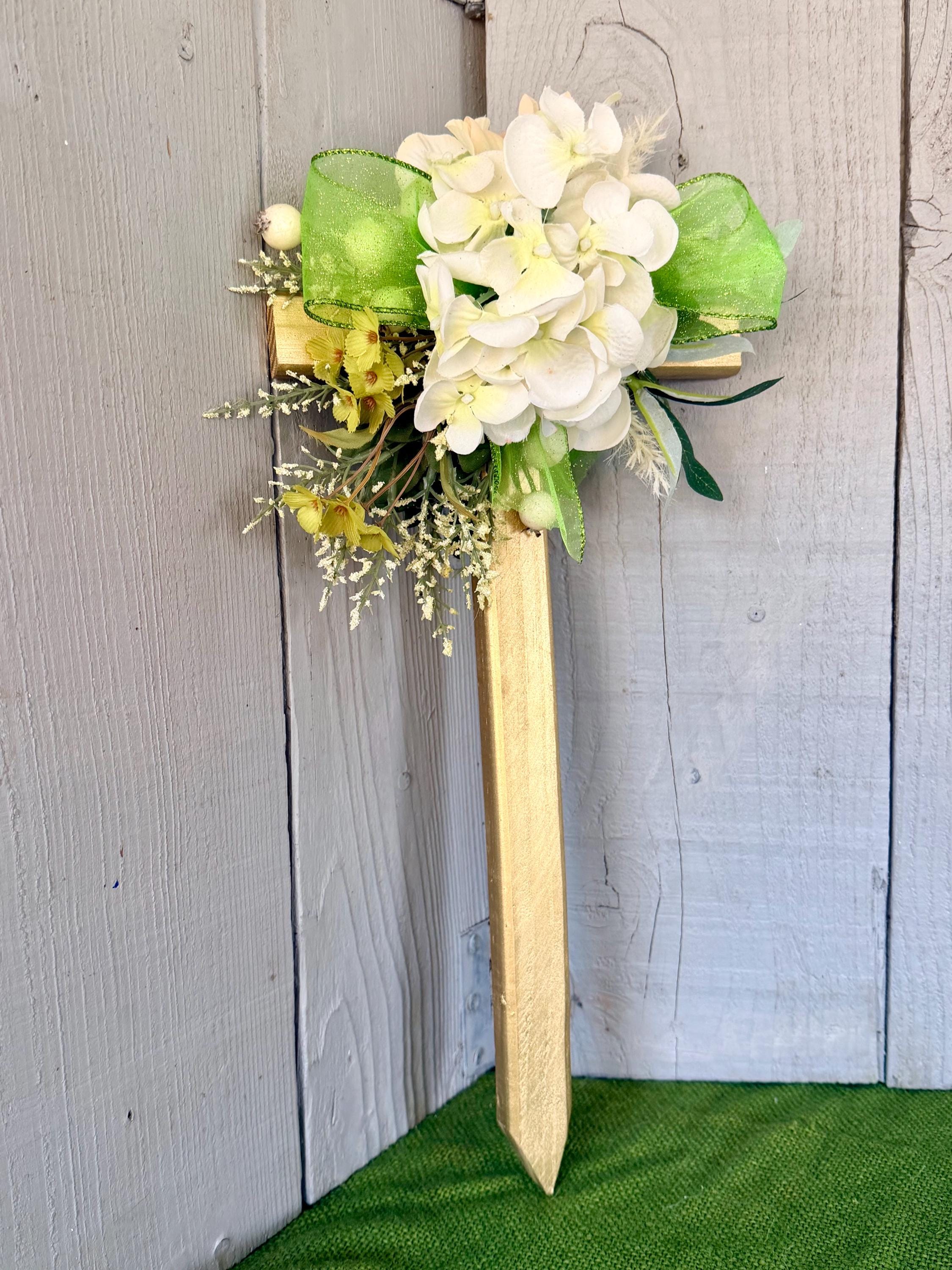 This 18” pine cemetery cross has been painted gold with pale green geraniums, off white baby breath branches, cream colored berries, layers of greenery, and bright green glittered ribbon. The cross has a pointed end for easy ground insertion. Every cross is sprayed with a coat of clear polyurethane to protect the ribbon and silk flowers from outdoor elements.