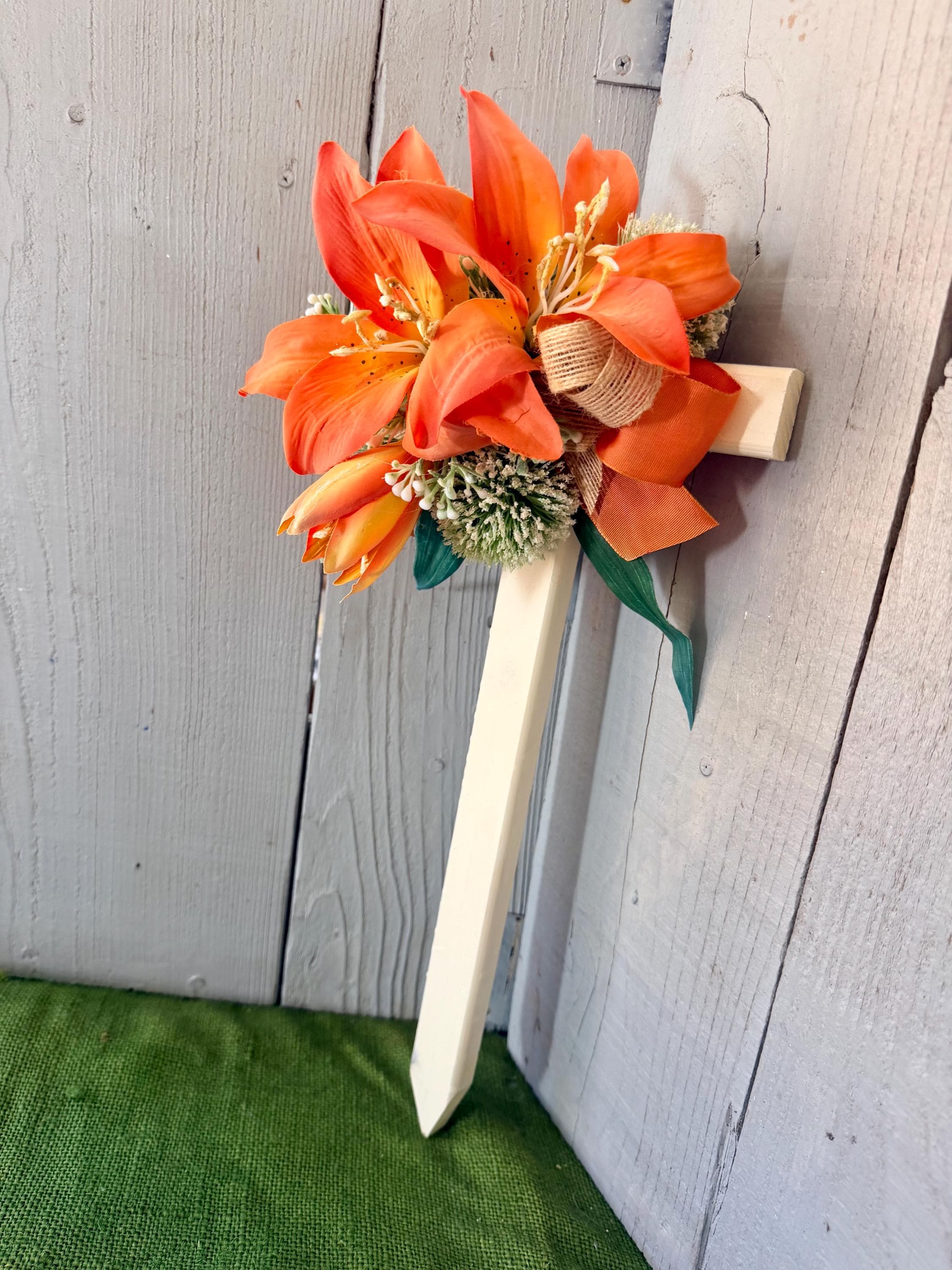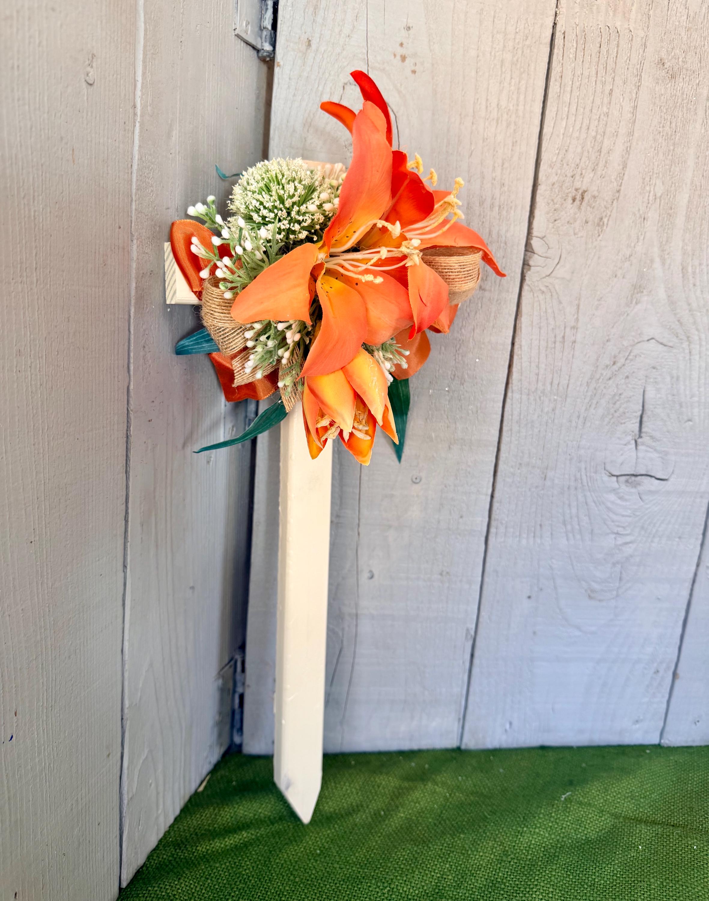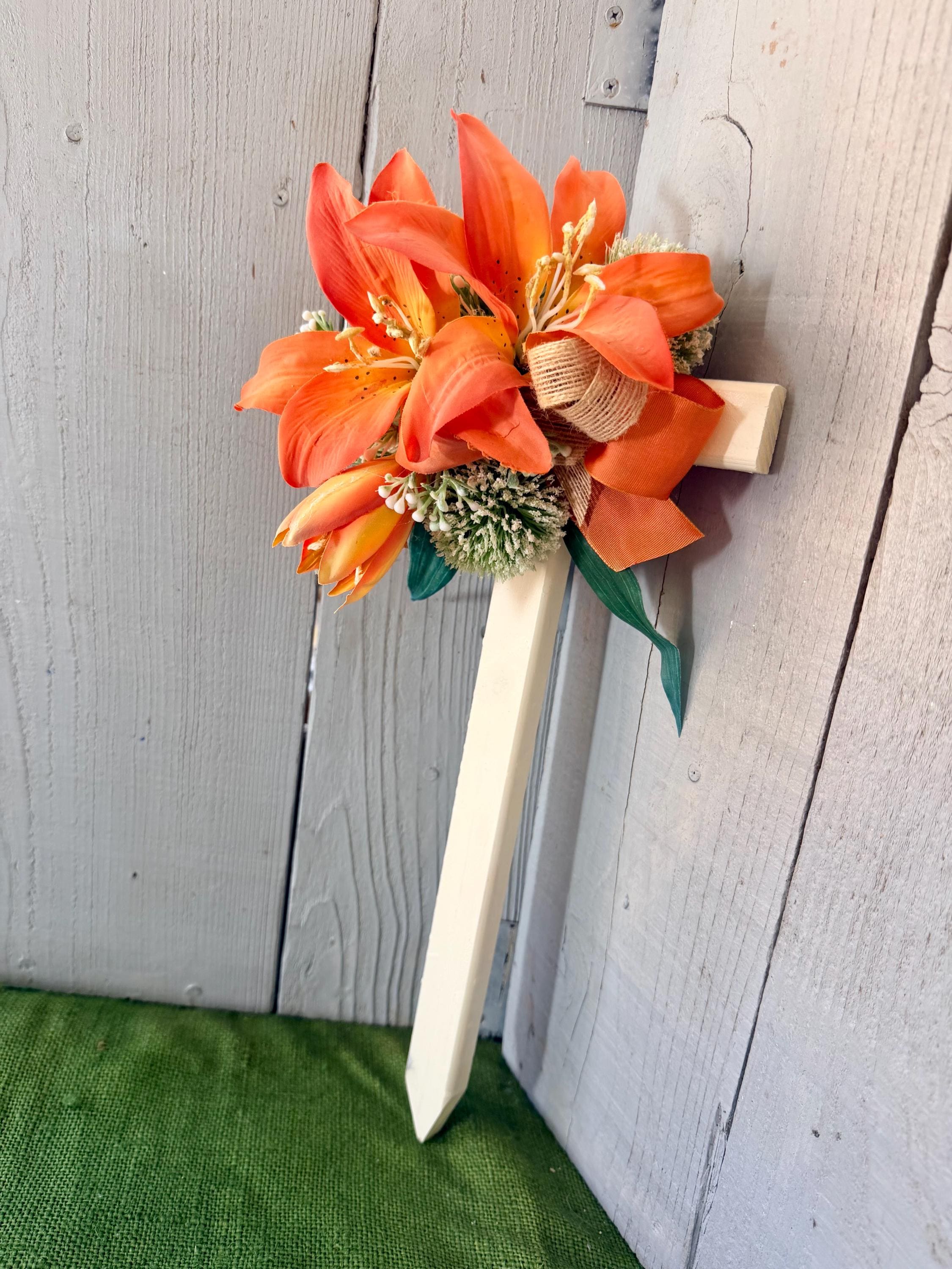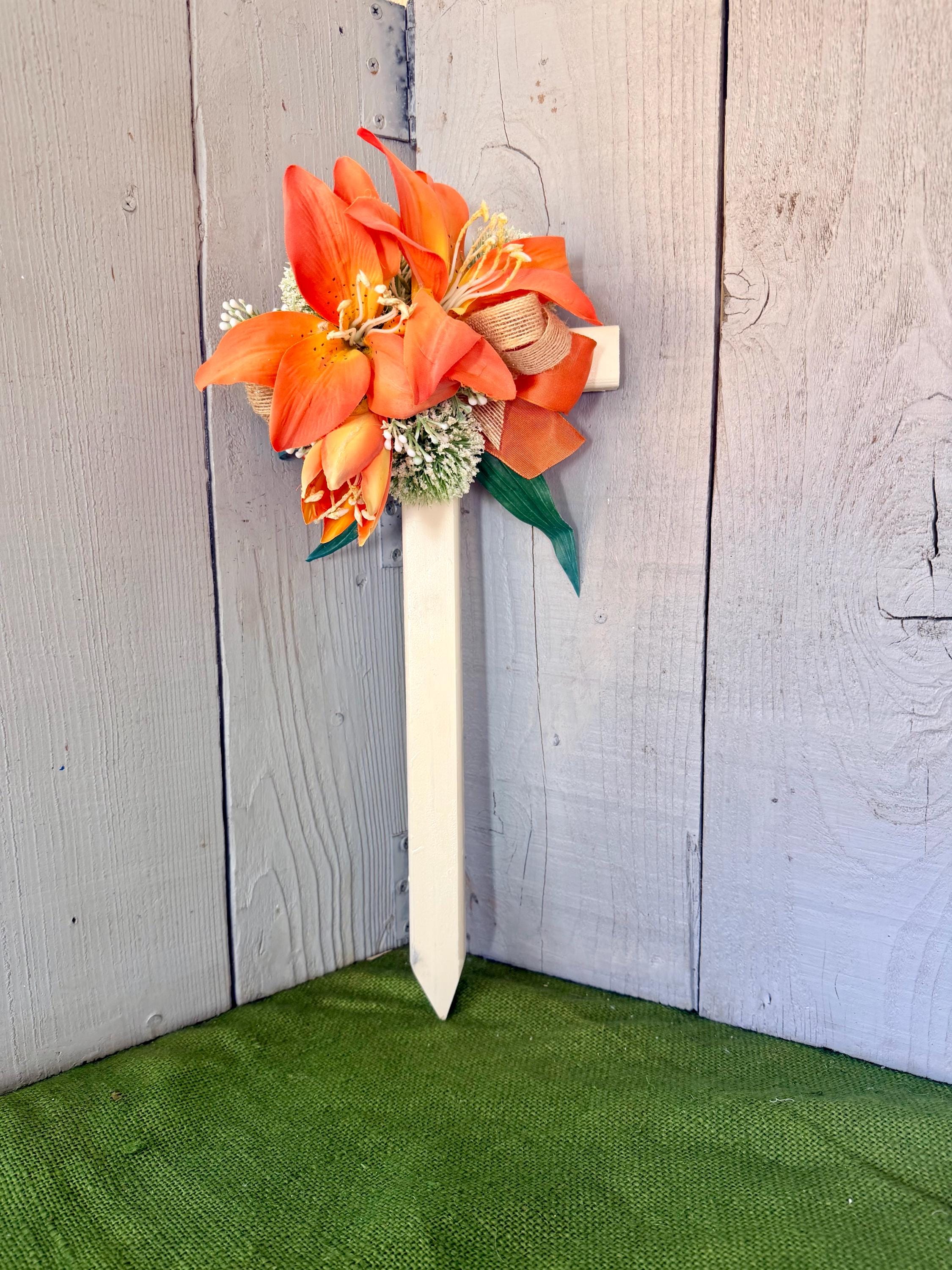 This 18” pine cemetery cross has been painted ivory with three large orange lillies, white pom poms, layers or greenery, orange ribbon ,and thin burlap ribbon. The cross has a pointed end for easy ground insertion. Every cross is sprayed with a coat of clear polyurethane to protect the ribbon and silk flowers from outdoor elements.