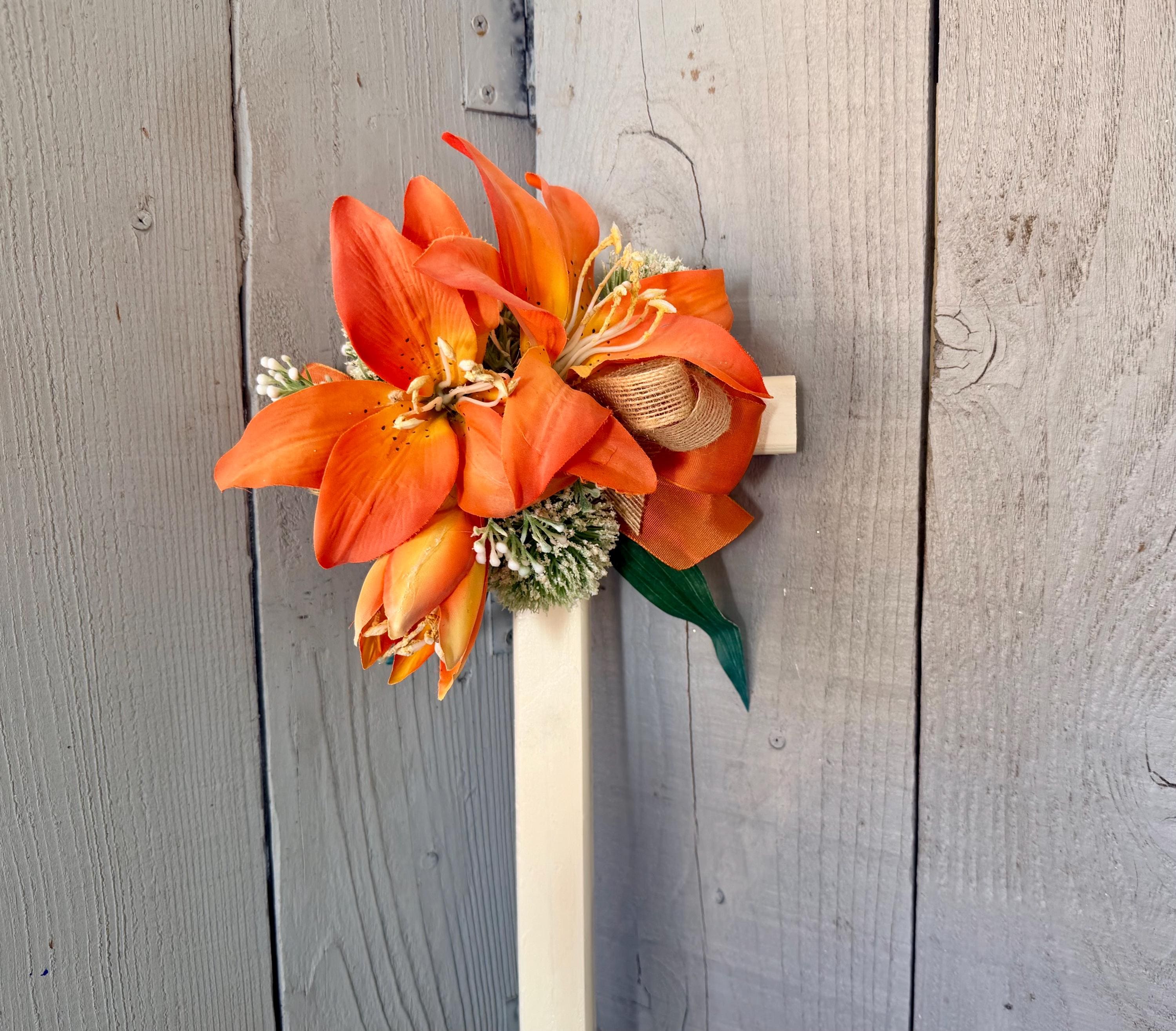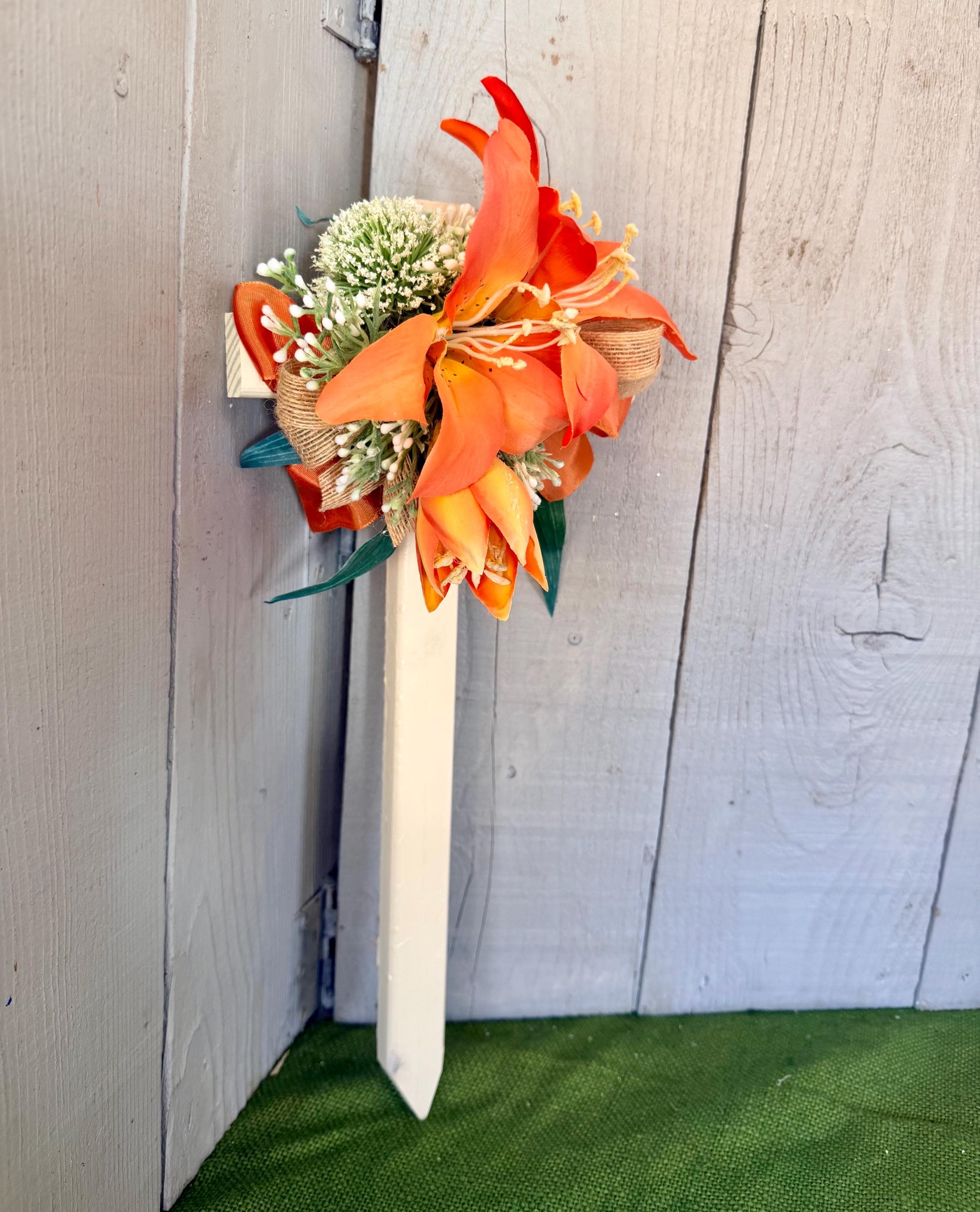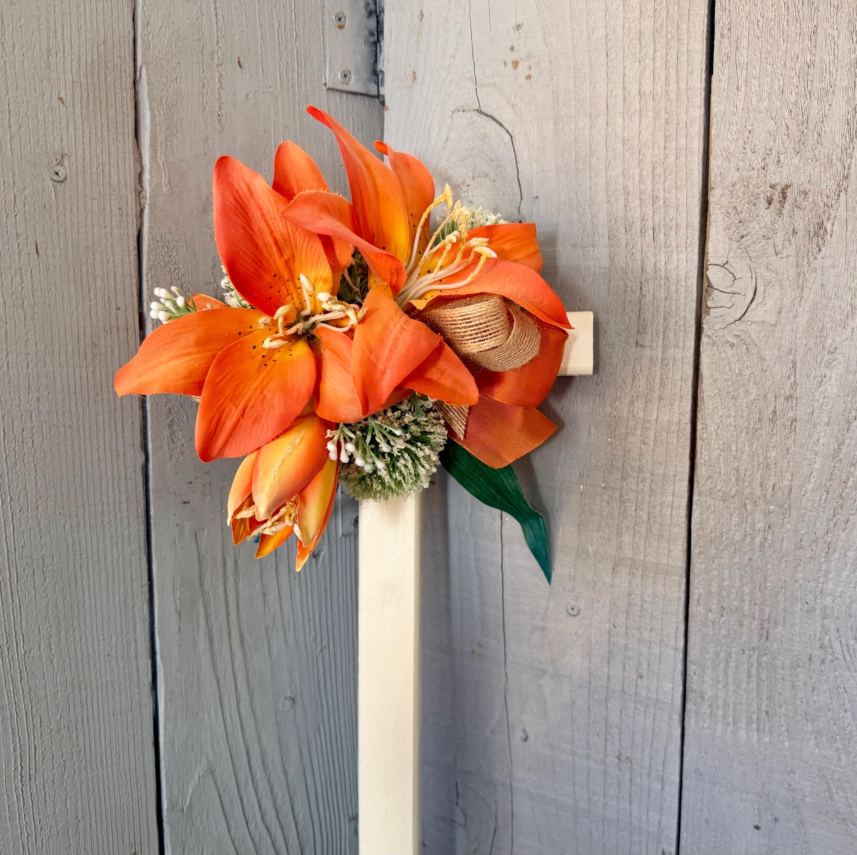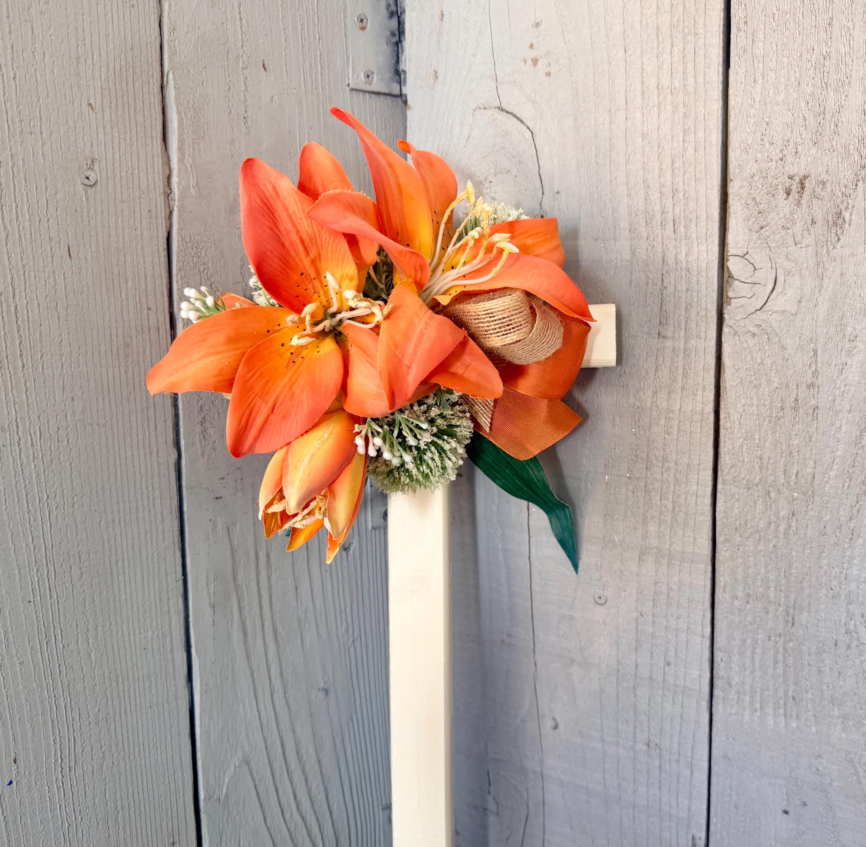 This 18” pine cemetery cross has been painted ivory with three large orange lillies, white pom poms, layers or greenery, orange ribbon ,and thin burlap ribbon. The cross has a pointed end for easy ground insertion. Every cross is sprayed with a coat of clear polyurethane to protect the ribbon and silk flowers from outdoor elements.