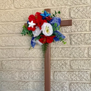 This NEW 24” pine cemetery cross has been painted silver with a large blue silver centered daisy, red and white mini rosebuds, ivy greenery, a red star on the front of the cross, and blue- silver edged ribbon. The cross has a pointed end for easy ground insertion. Every cross is sprayed with a coat of clear polyurethane to protect the ribbon and silk flowers from outdoor elements.