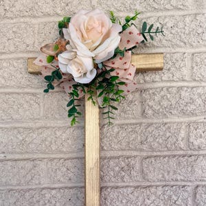Every cross is sprayed with a coat of clear polyurethane to protect the ribbon and silk flowers from outdoor elements.
