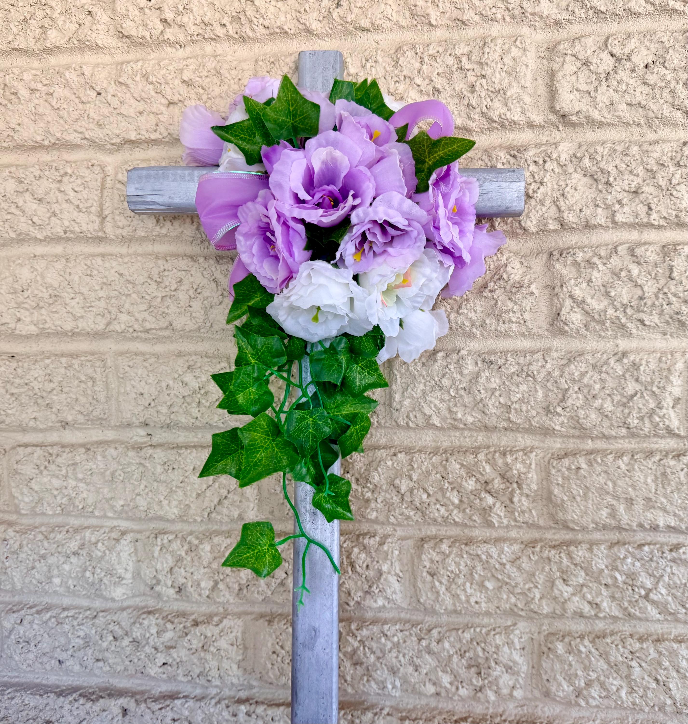 This NEW 24” pine cemetery cross has been painted silver with lavender and white flowers, bright green ivy intertwined with lavender/silver ribbon. The cross has a pointed end for easy ground insertion.