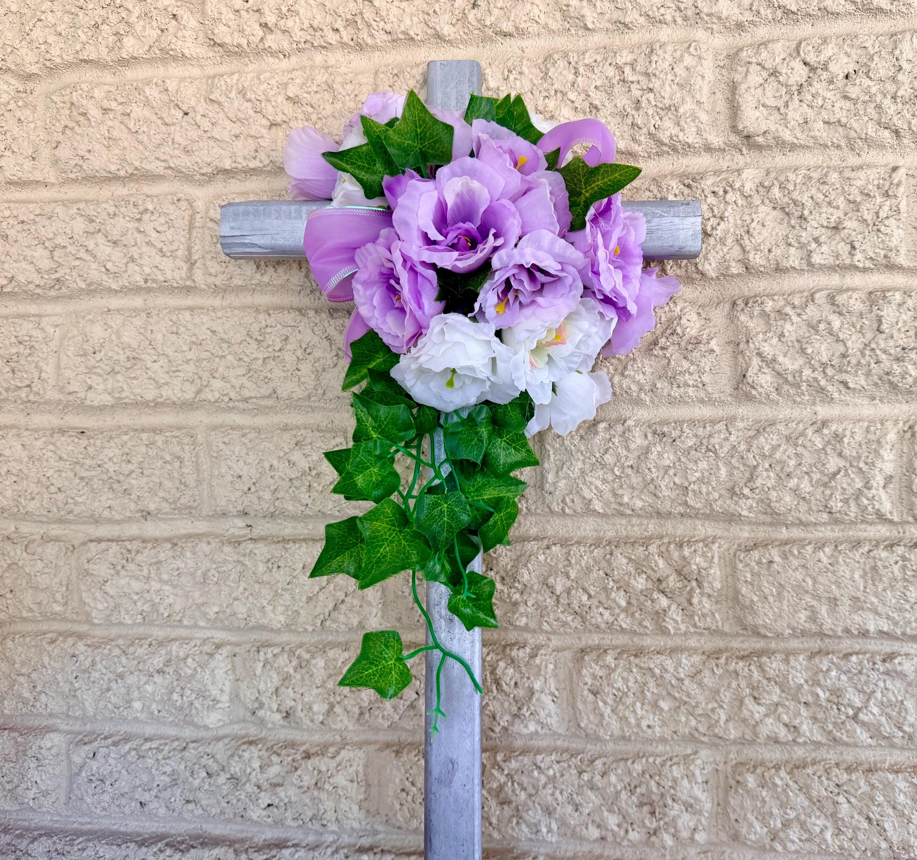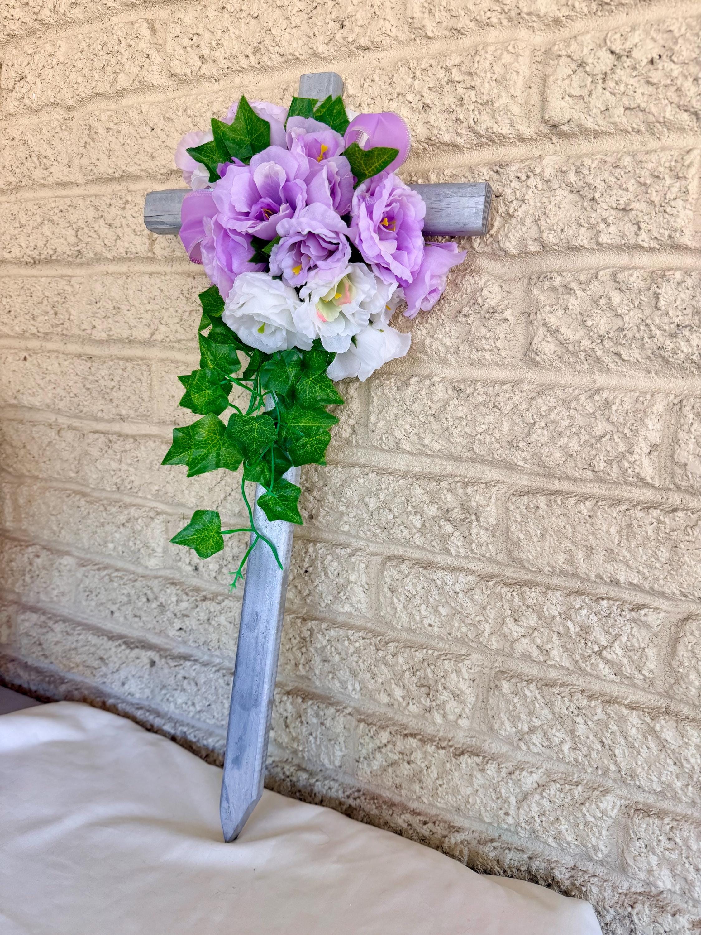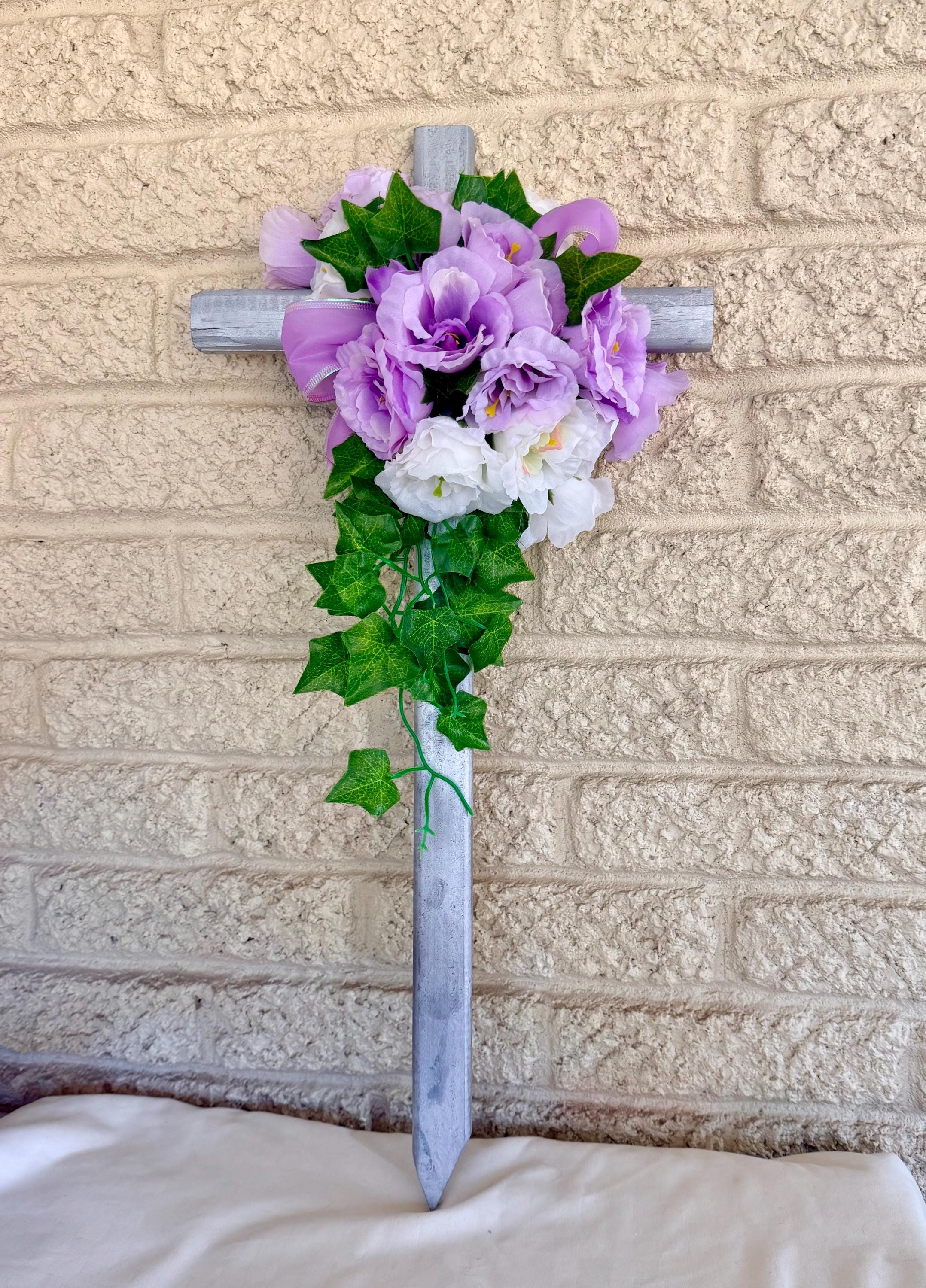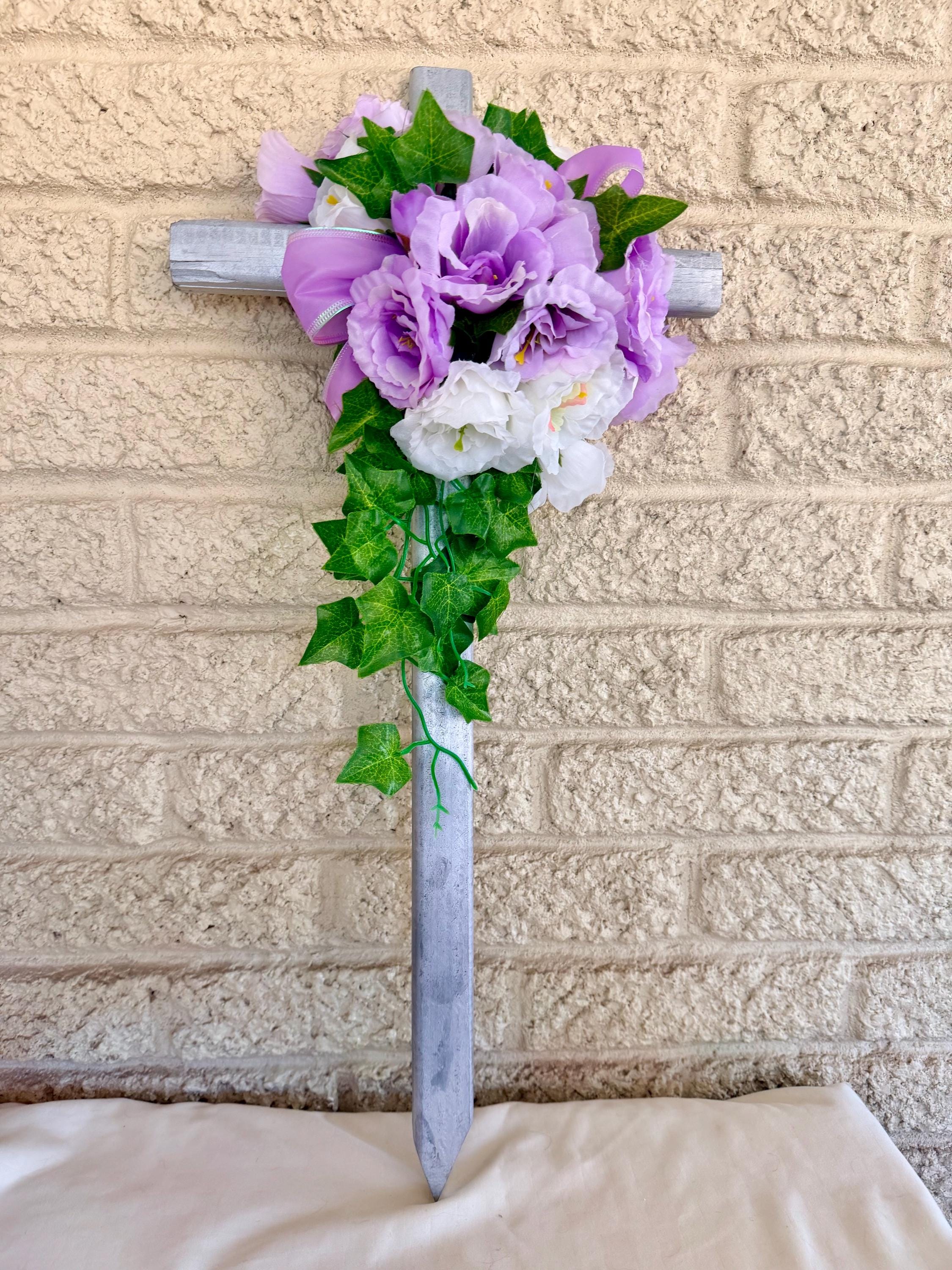 24" Silver Pine Cemetery Cross Decoration, Purple White, Floral Memorial Grave Arrangement