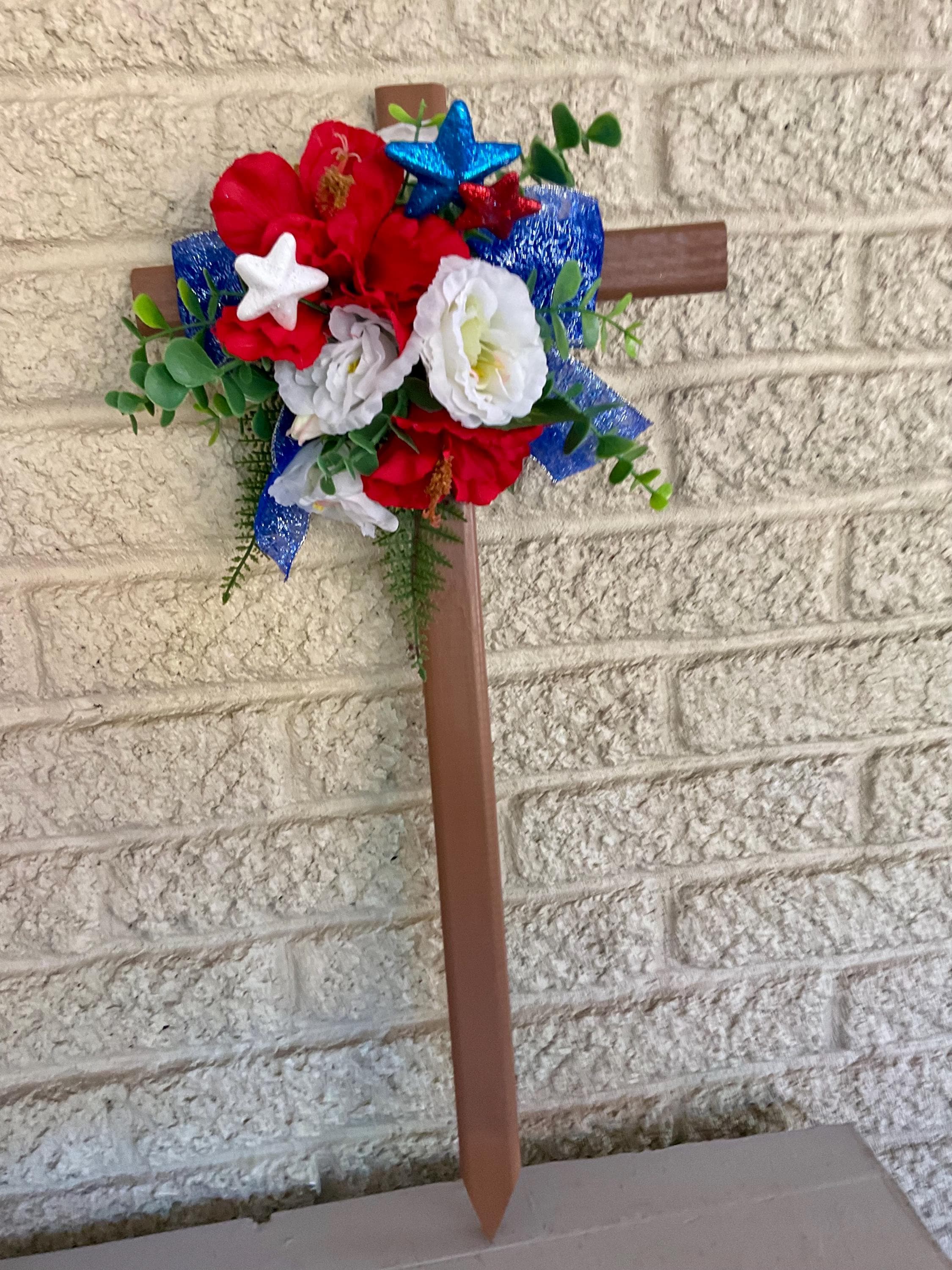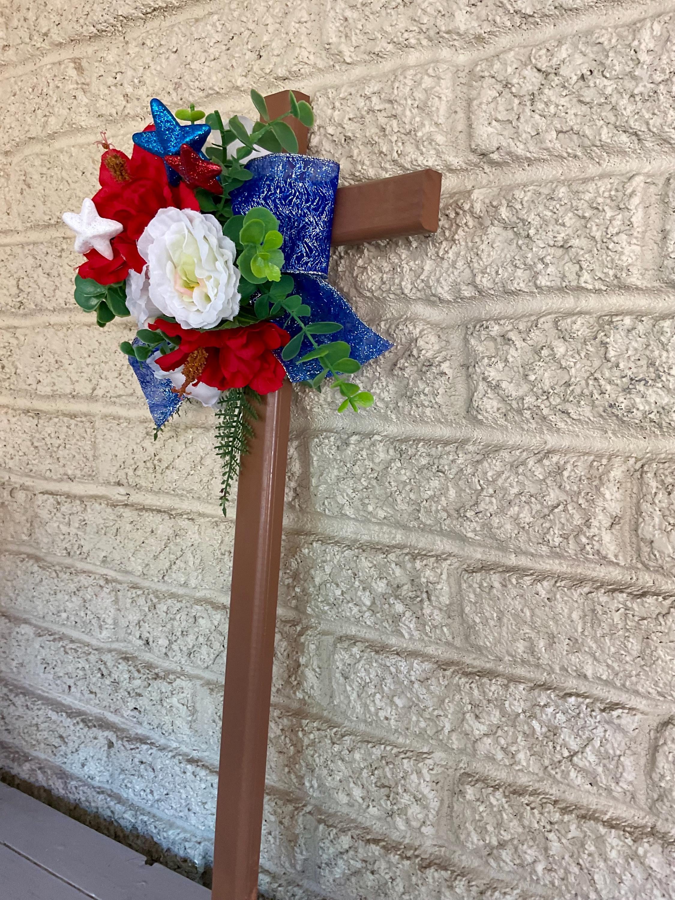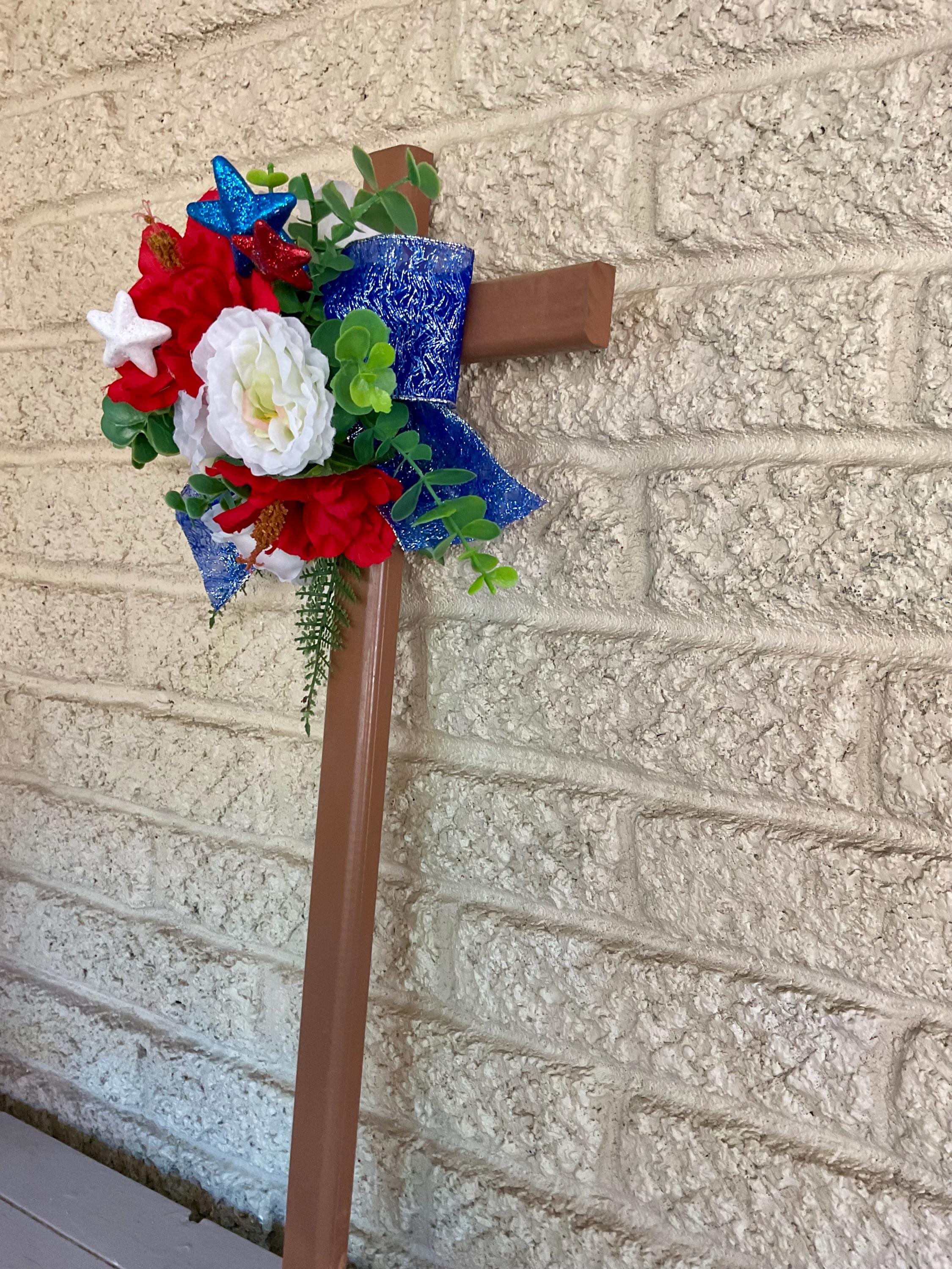 This NEW 24” pine cemetery cross has been painted brown with red poppies, white roses, red-white-blue glitter stars, layers of various greenery, and blue glitter ribbon. The cross has a pointed end for easy ground insertion. Every cross is sprayed with a coat of clear polyurethane to protect the ribbon and silk flowers from outdoor elements.