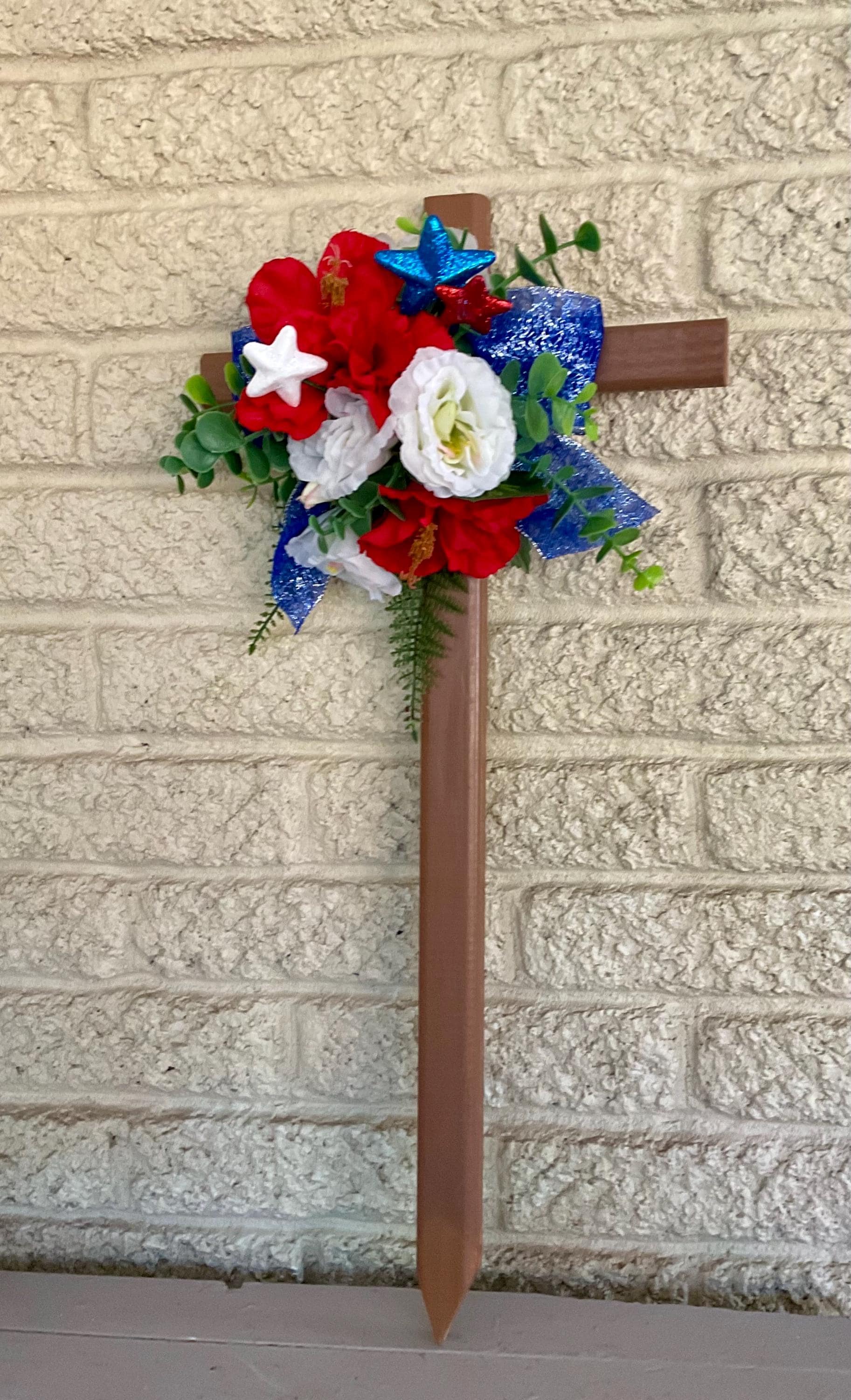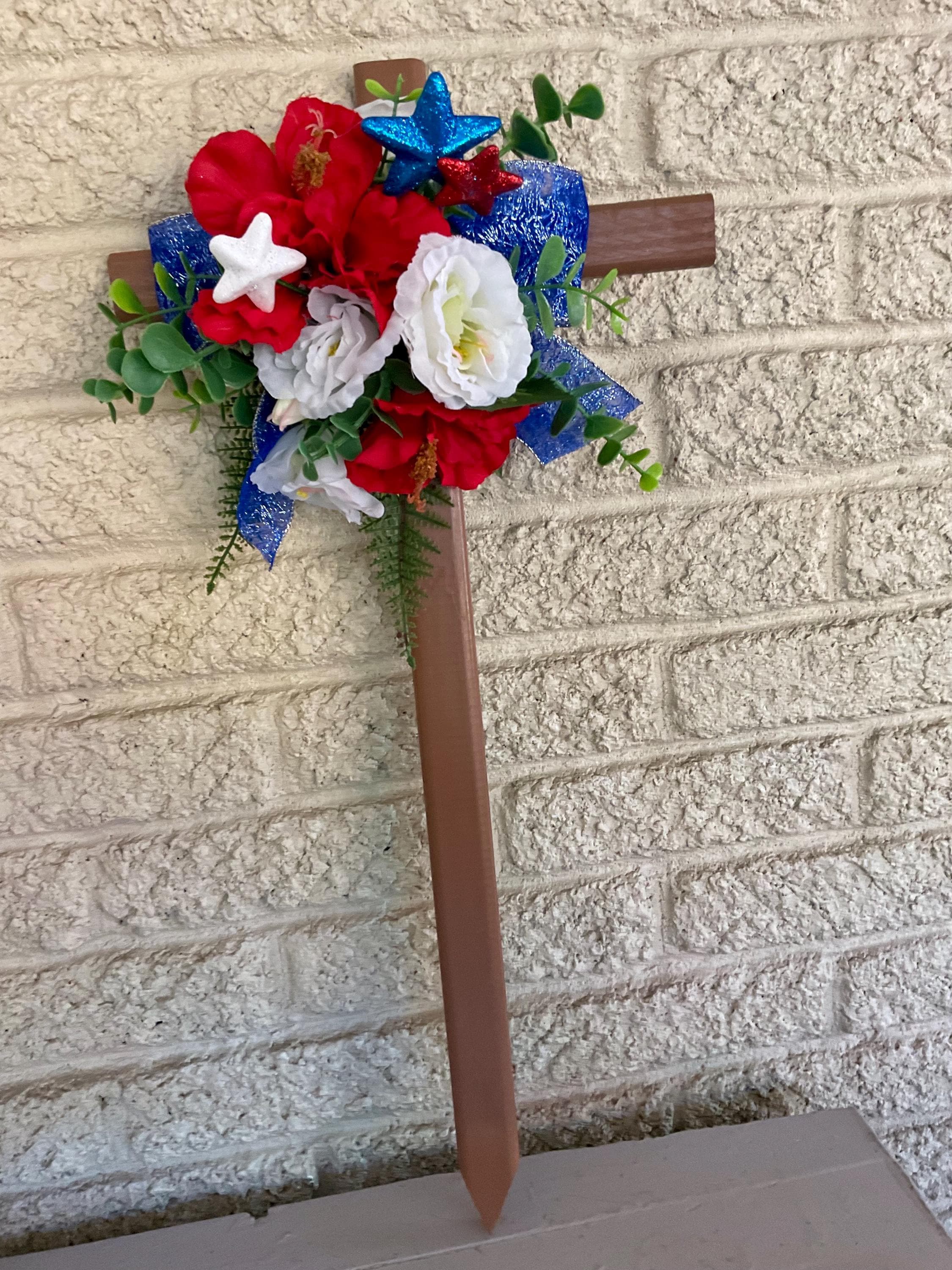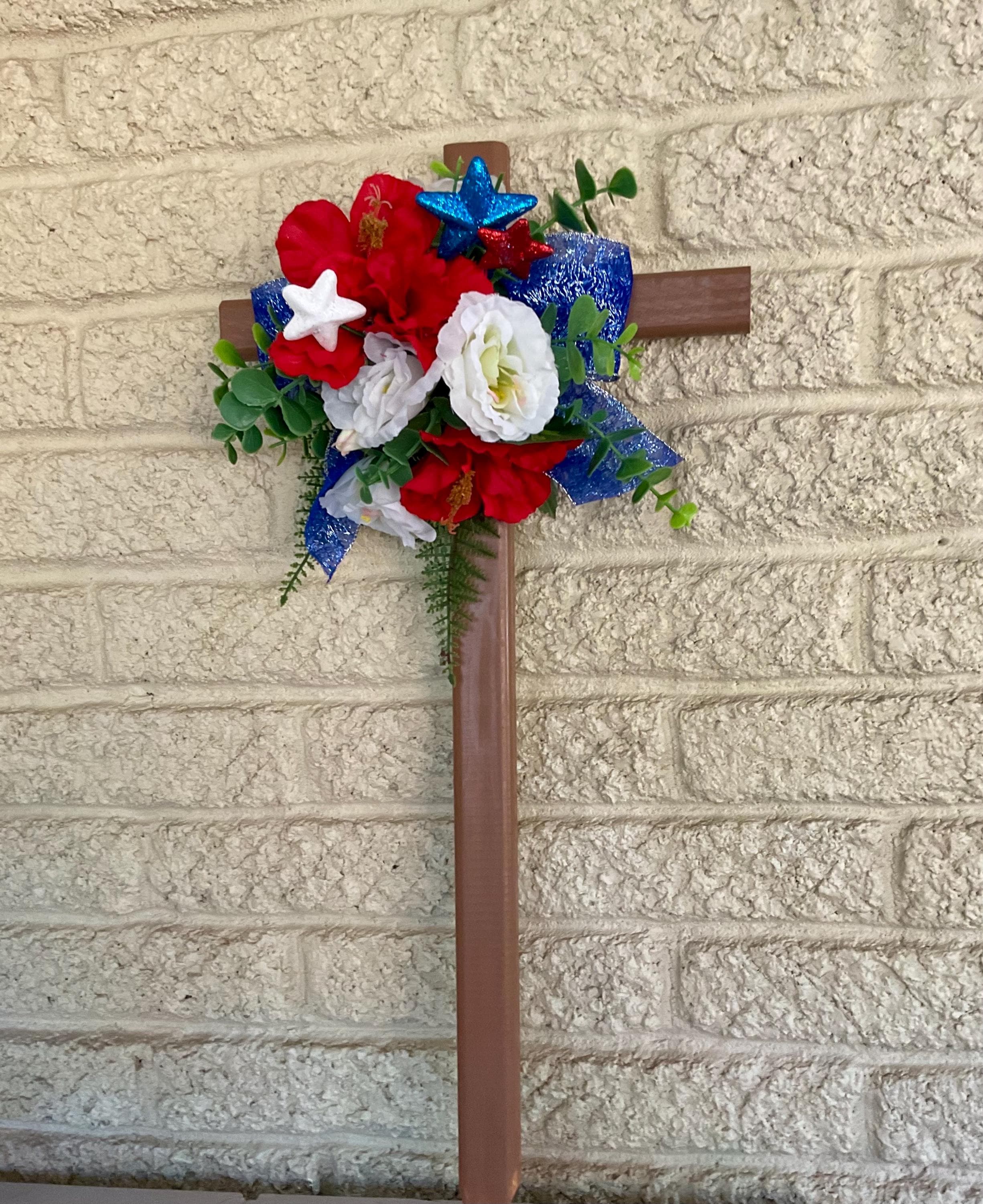 This NEW 24” pine cemetery cross has been painted brown with red poppies, white roses, red-white-blue glitter stars, layers of various greenery, and blue glitter ribbon. The cross has a pointed end for easy ground insertion. Every cross is sprayed with a coat of clear polyurethane to protect the ribbon and silk flowers from outdoor elements.