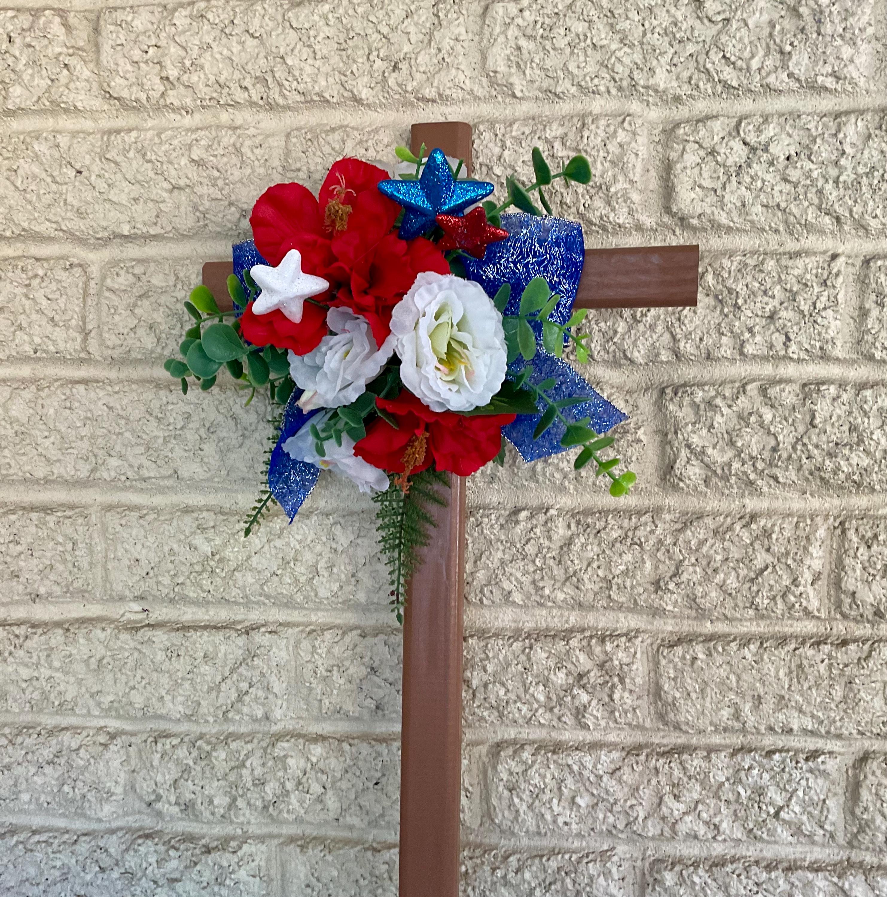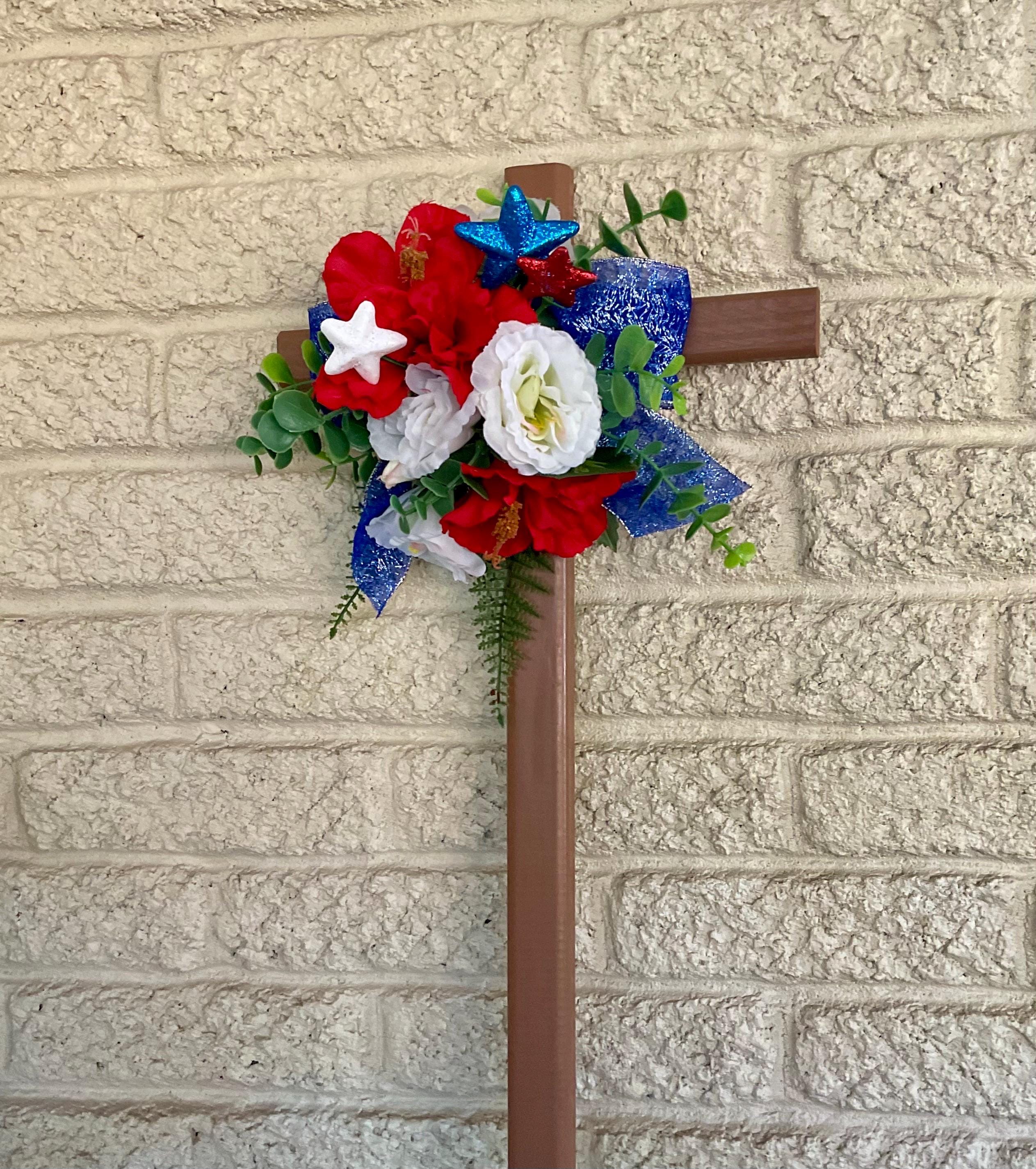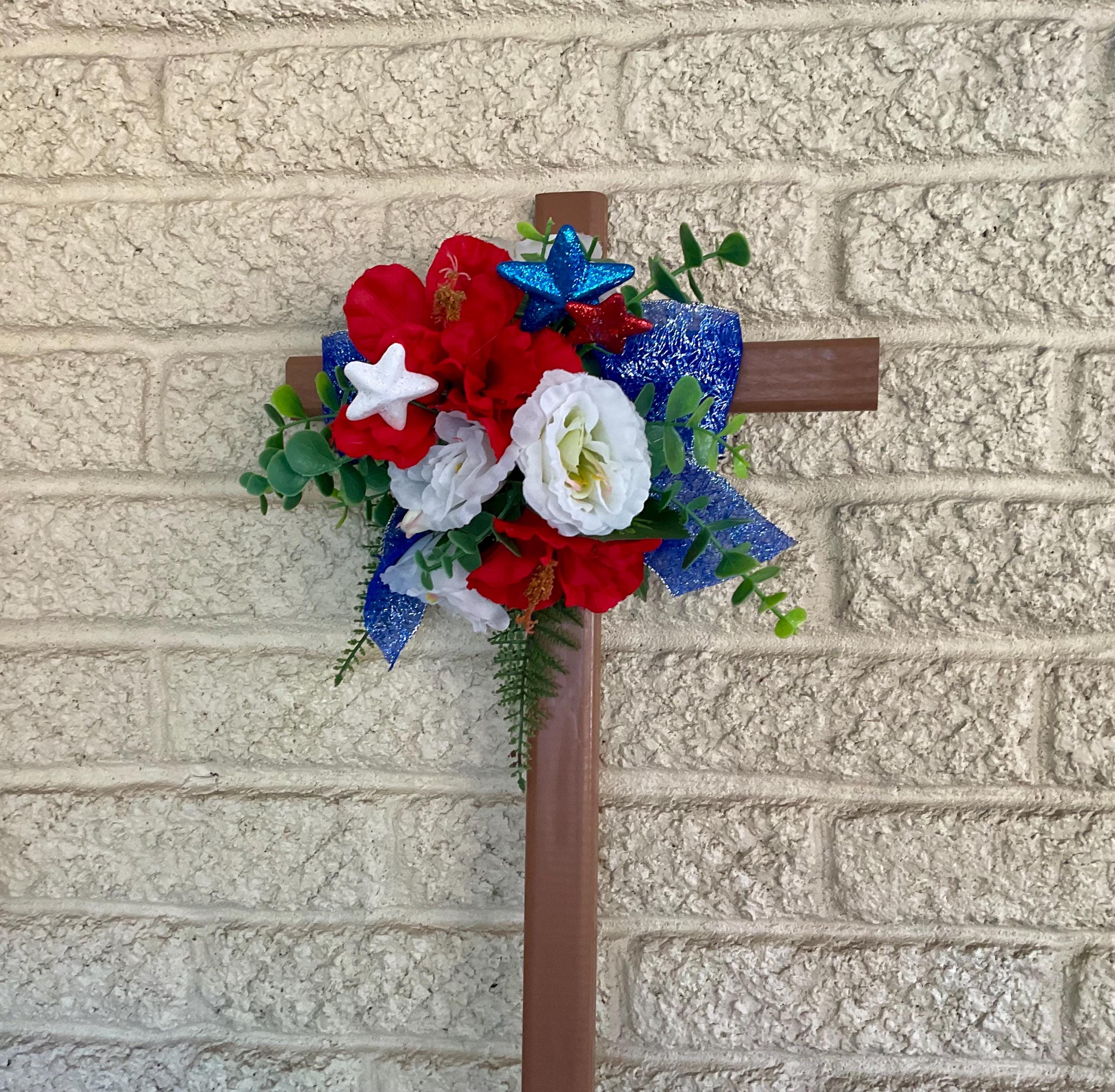 Cemetery Cross Decoration, Red White and Blue Grave Flowers, Patriotic Floral Memorial Grave Arrangement 24”